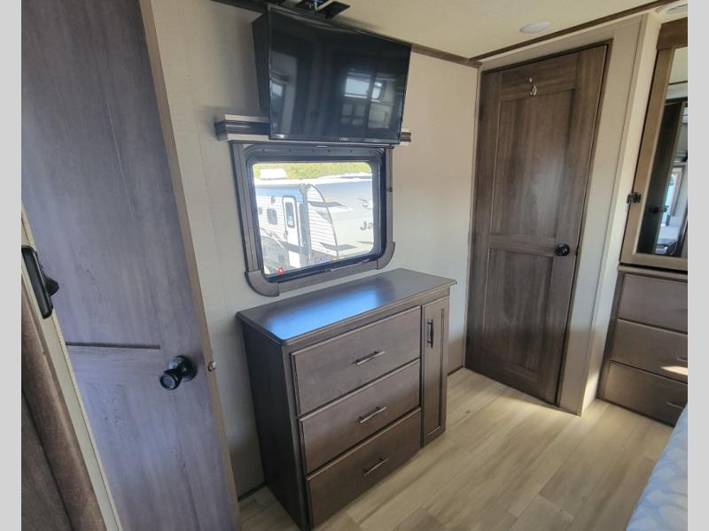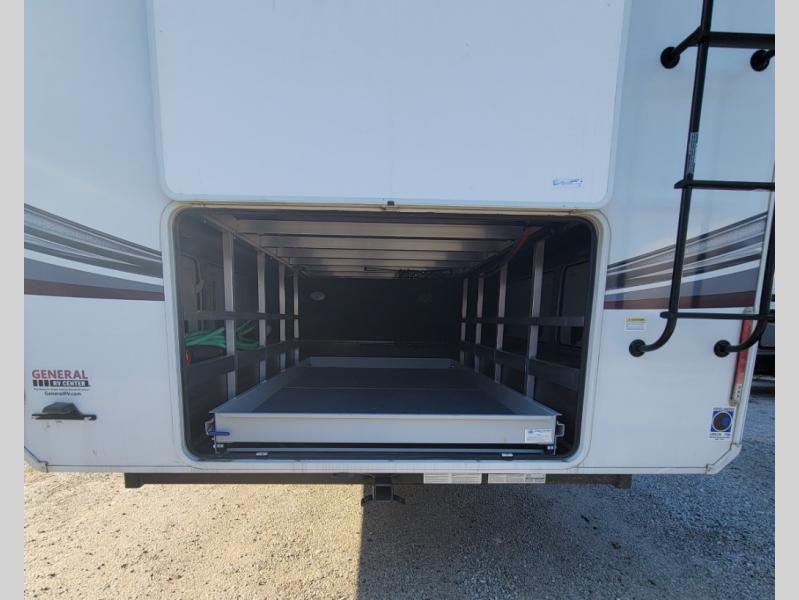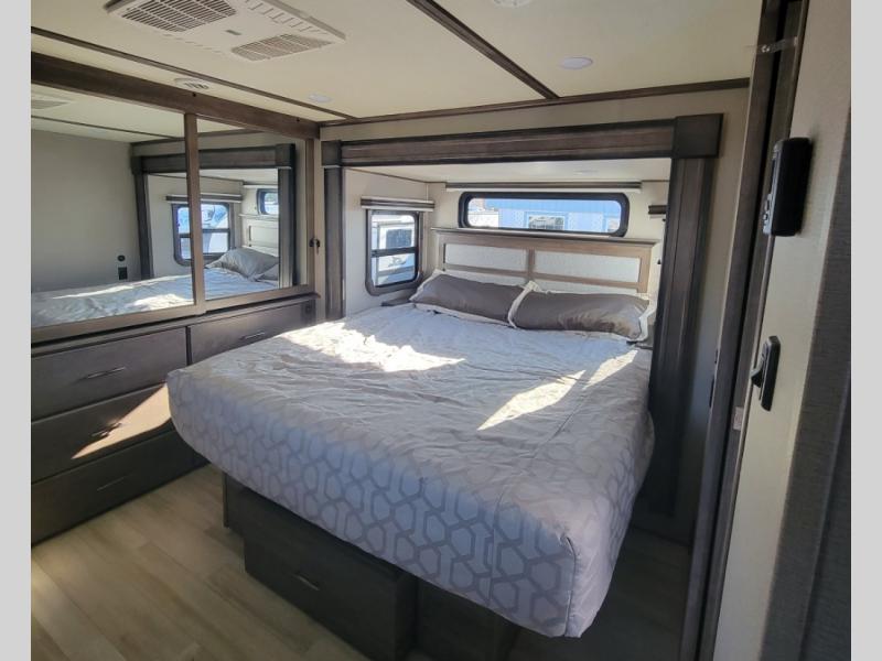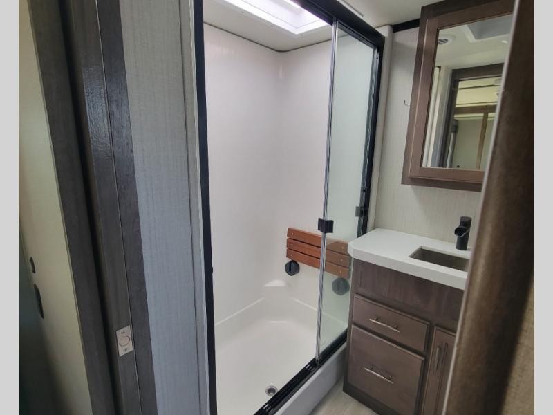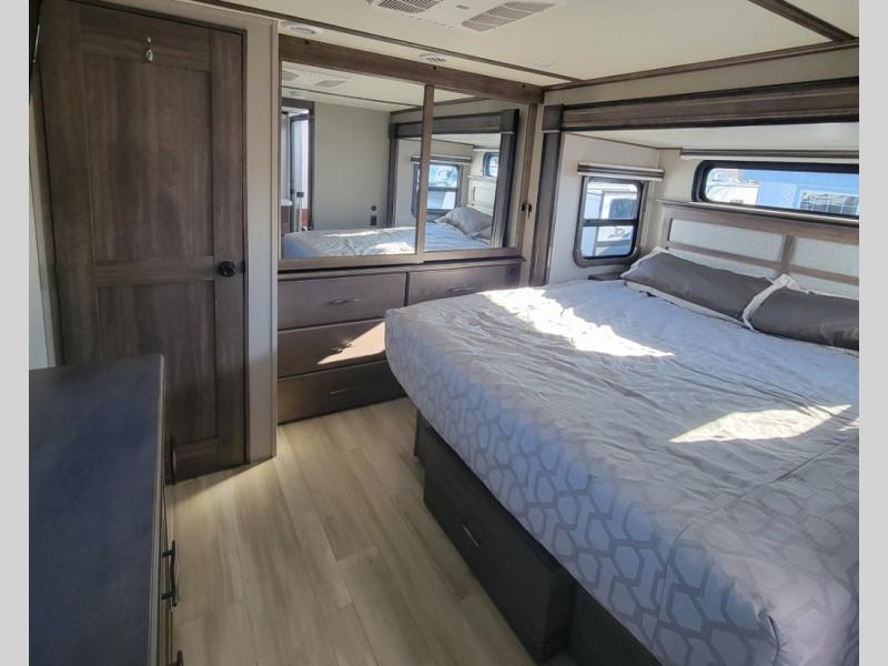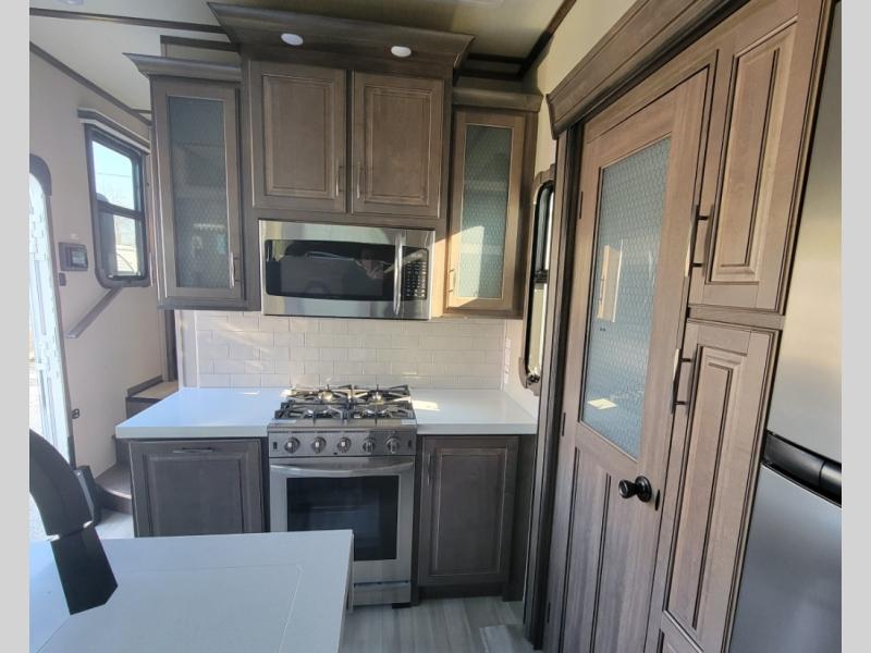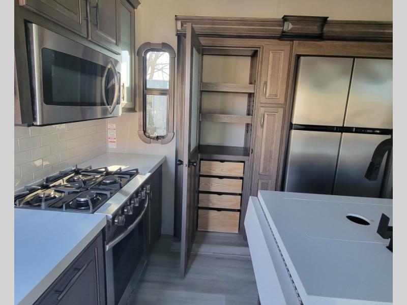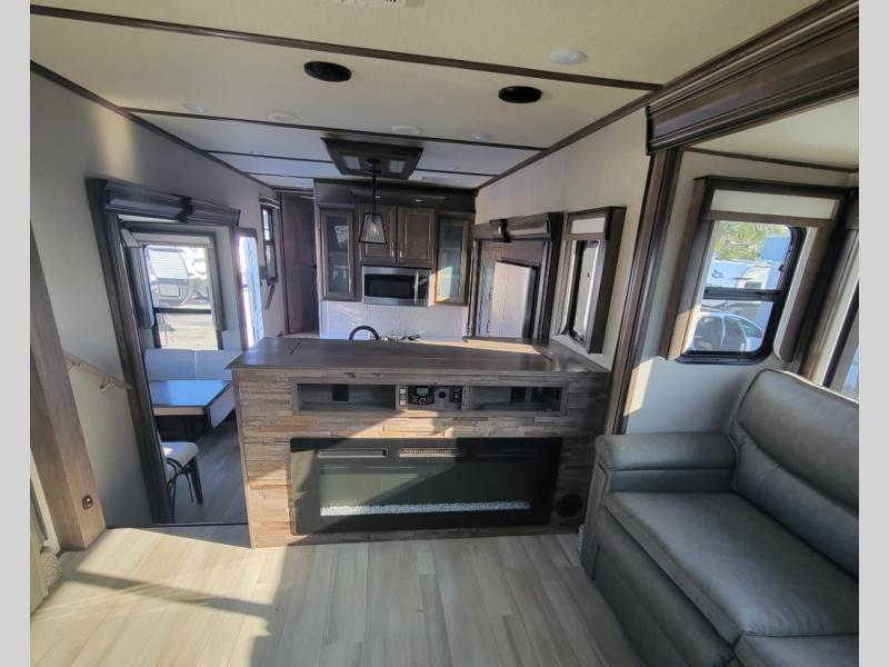 You can live in this fifth wheel or take it on long trips thanks to all the storage found throughout the inside as well as the rear exterior storage bay with tray allowing you to carry totes with off-season clothing, golf clubs, outdoor camping chairs and such. The front separate living area offers theater seating, dual opposing tri-fold sofa slides, and a TV plus a fireplace as well as offers sleeping space to guests. The cook will love the separate kitchen area to make meals for everyone using the kitchen island, the flip-up countertop, and all the appliances. The pull-out trash and the oversized pantry with shelves are more conveniences you will love. When it is time for bed, the rear master bedroom offers a queen bed or choose a king option, a pull-out ottoman allowing you to sit down and remove your shoes easily, and a closet prepped for a stackable washer/dryer option, and a wardrobe which includes drawers. You will also find a flip-top dresser, storage under the bed, a bedroom LED TV to watch, and a second entry into the bathroom with a sunken shower with a skylight and a flip-up seat giving you lots of headroom and comfort to get cleaned up.