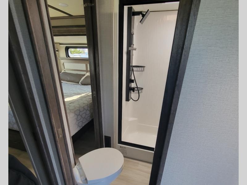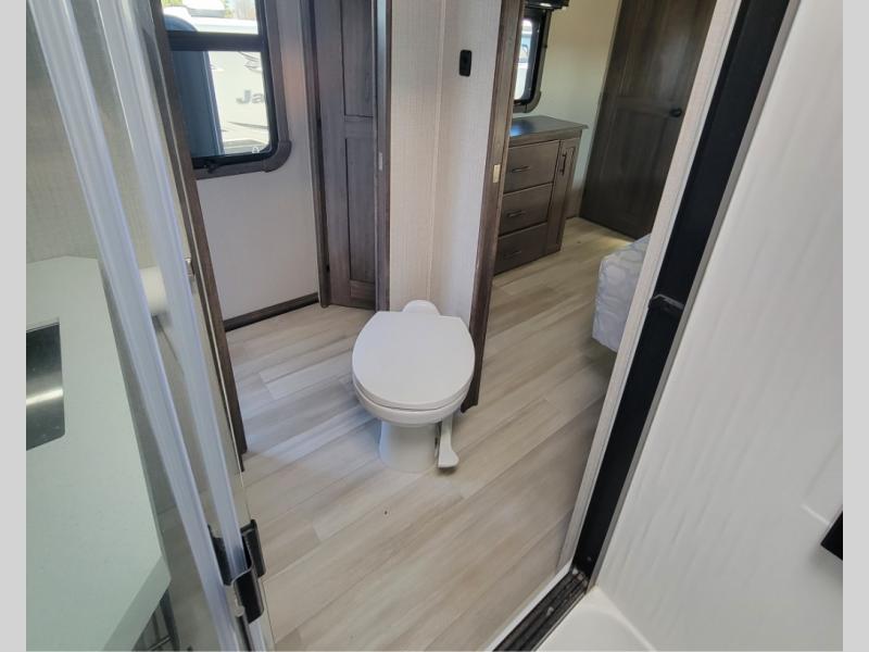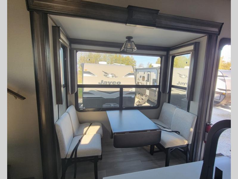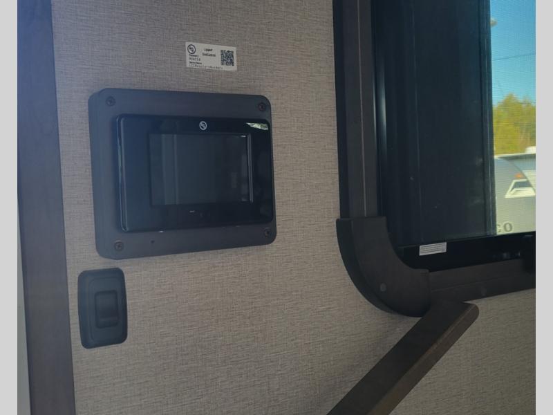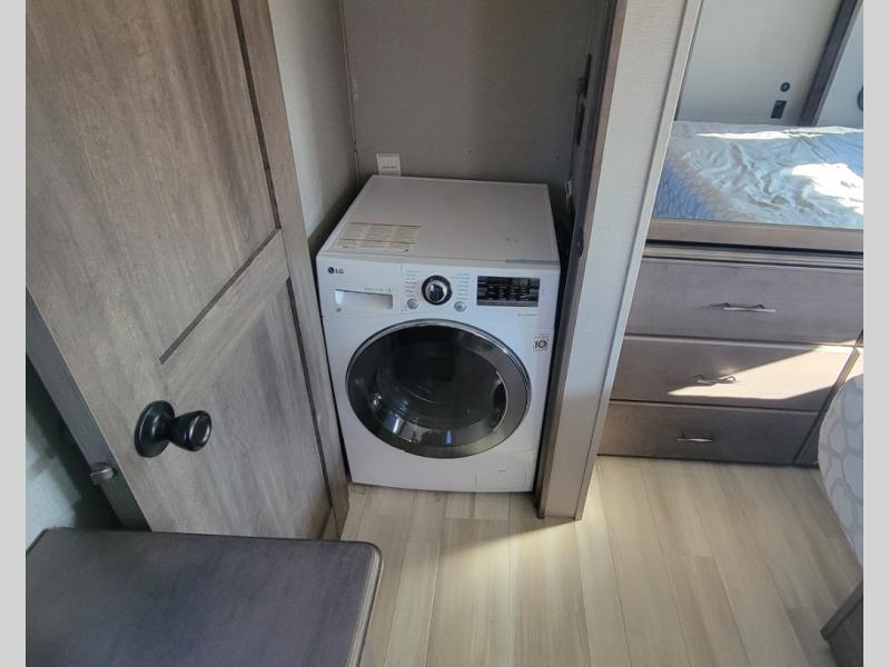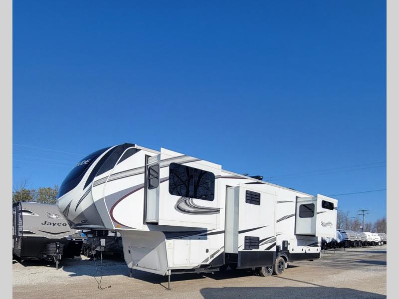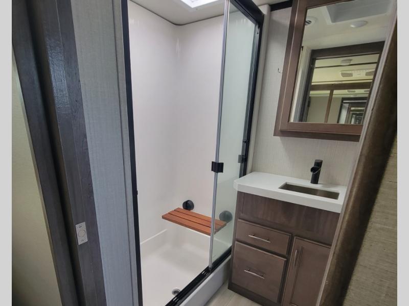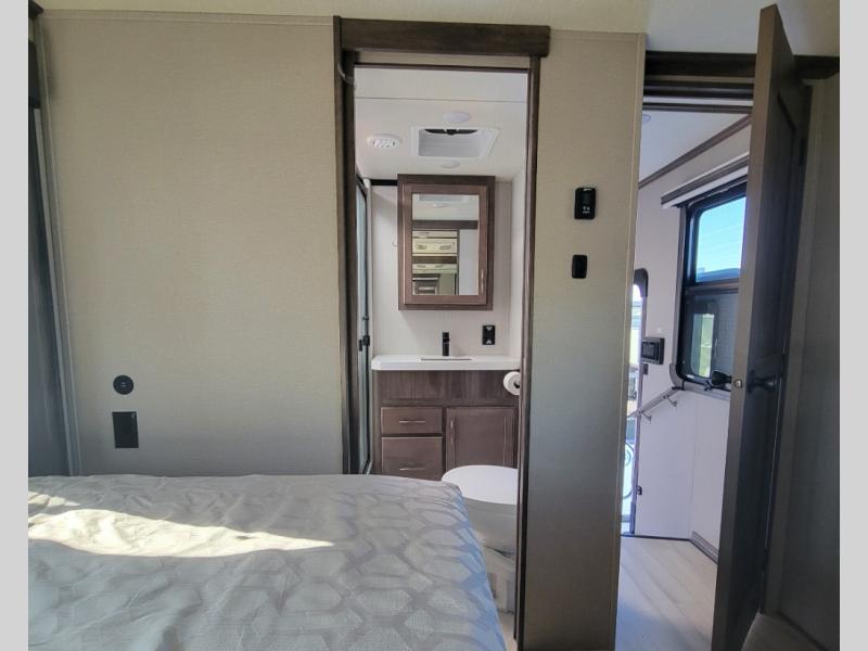 You can live in this fifth wheel or take it on long trips thanks to all the storage found throughout the inside as well as the rear exterior storage bay with tray allowing you to carry totes with off-season clothing, golf clubs, outdoor camping chairs and such. The front separate living area offers theater seating, dual opposing tri-fold sofa slides, and a TV plus a fireplace as well as offers sleeping space to guests. The cook will love the separate kitchen area to make meals for everyone using the kitchen island, the flip-up countertop, and all the appliances. The pull-out trash and the oversized pantry with shelves are more conveniences you will love. When it is time for bed, the rear master bedroom offers a queen bed or choose a king option, a pull-out ottoman allowing you to sit down and remove your shoes easily, and a closet prepped for a stackable washer/dryer option, and a wardrobe which includes drawers. You will also find a flip-top dresser, storage under the bed, a bedroom LED TV to watch, and a second entry into the bathroom with a sunken shower with a skylight and a flip-up seat giving you lots of headroom and comfort to get cleaned up.