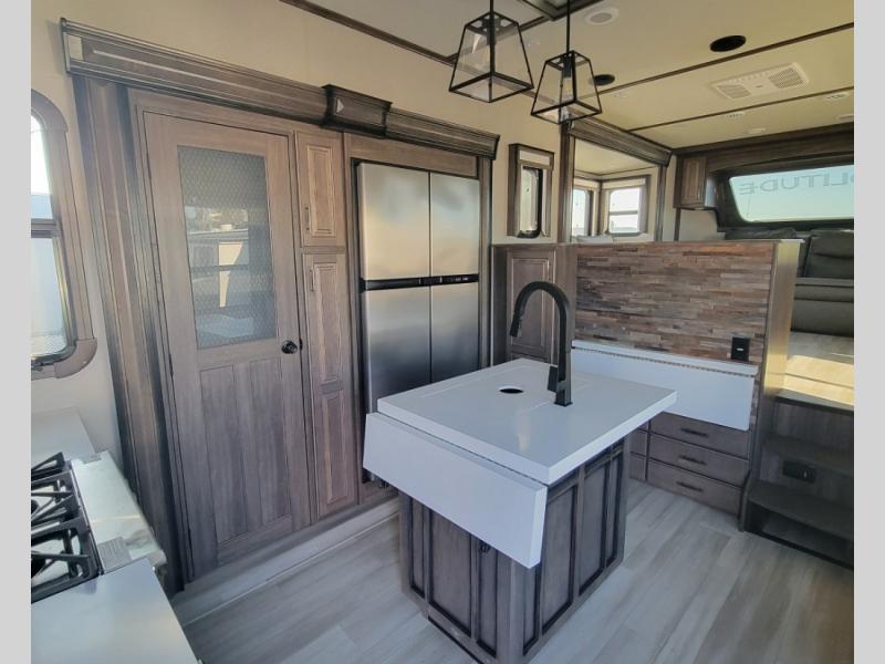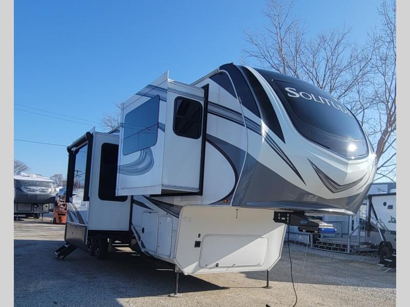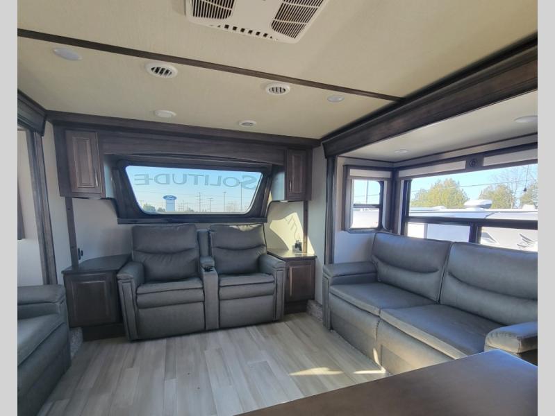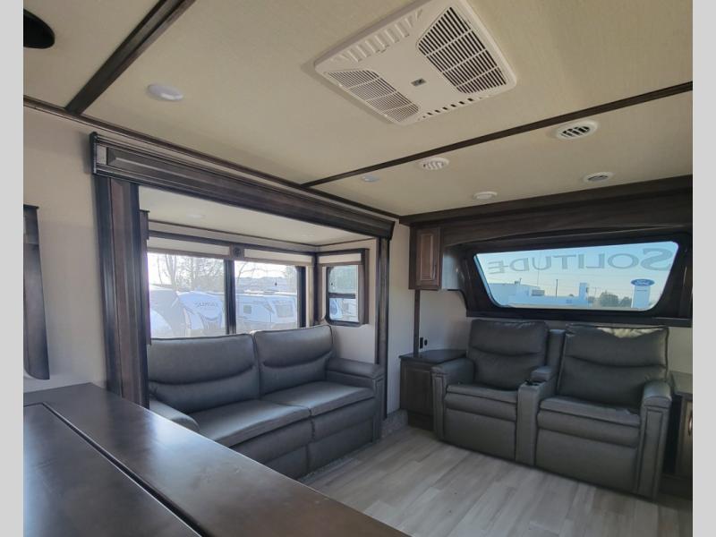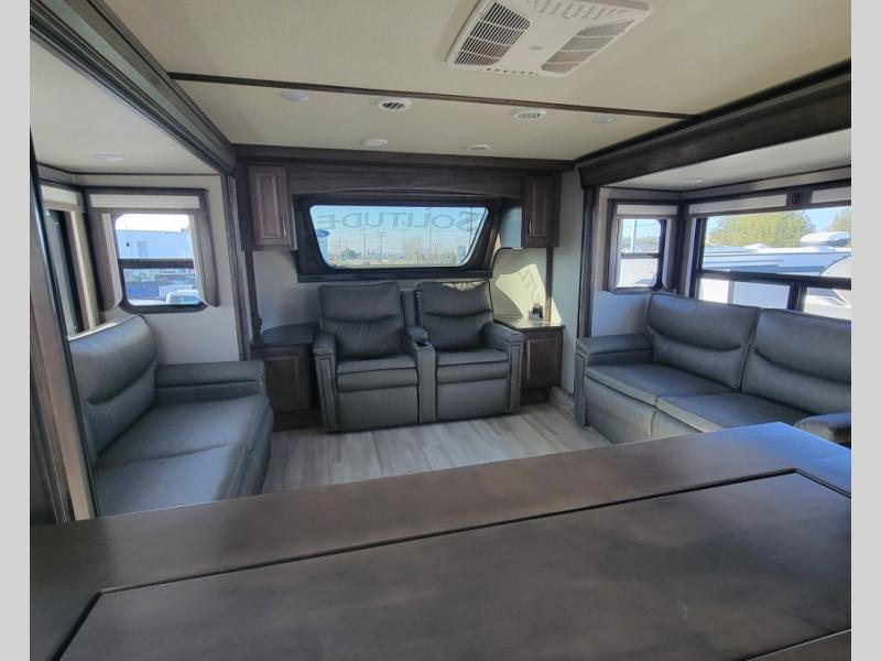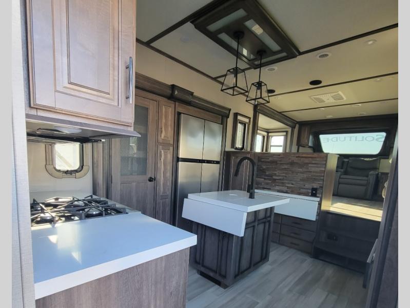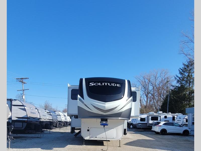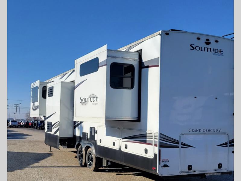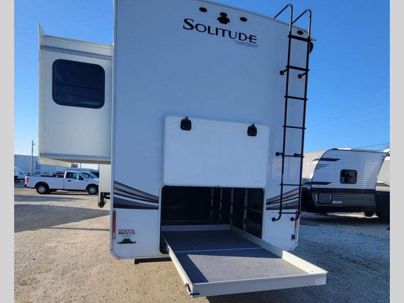 With each Solitude fifth wheel by Grand Design, you will have an exclusive superchassis, a wide rail design on heavy duty l-beam main rails providing a more stable jack stance, and maximum insulation from the thermal roof design and the exclusive full laminated walls to the insulated gooseneck and baggage doors. More features offered to help with traveling include the MORryde rubber pin box, the Tire Linc TPMS system, and the 6-point hydraulic system. And the 40,000 BTU of heating power, the heated underbelly and heated storage bay, the Evenflow heating system, and the Stealth A/C system with racetrack ducting, allow you to camp all year long! You will also find maximum storage solutions, residential features and so much more!