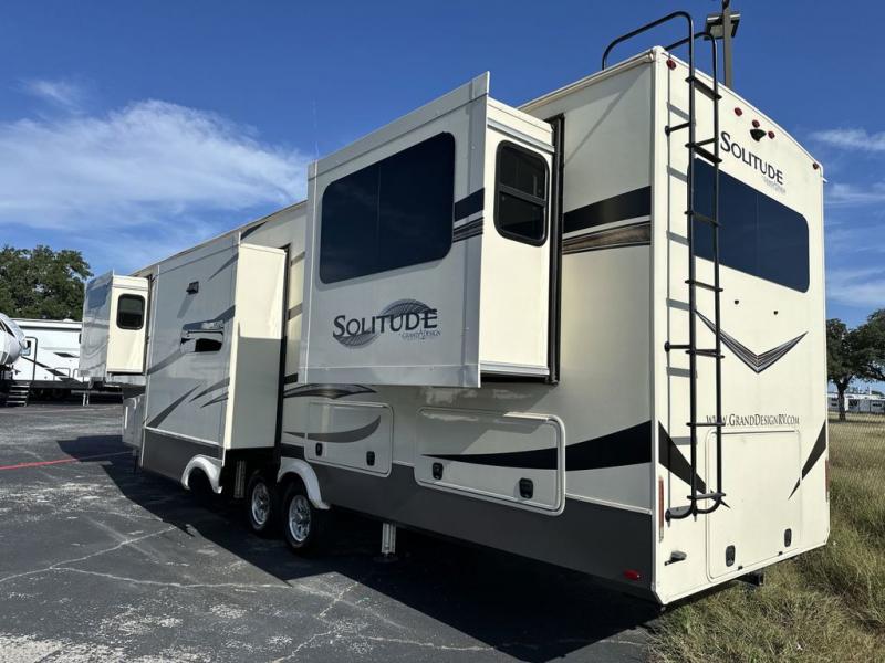 With each Solitude fifth wheel by Grand Design, you will have an exclusive superchassis, a wide rail design on heavy duty l-beam main rails providing a more stable jack stance, and maximum insulation from the thermal roof design and the exclusive full laminated walls to the insulated gooseneck and baggage doors. More features offered to help with traveling include the MORryde rubber pin box, the Tire Linc TPMS system, and the 6-point hydraulic system. And the 40,000 BTU of heating power, the heated underbelly and heated storage bay, the Evenflow heating system, and the Stealth A/C system with racetrack ducting, allow you to camp all year long! You will also find maximum storage solutions, residential features and so much more!