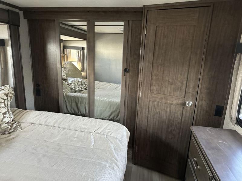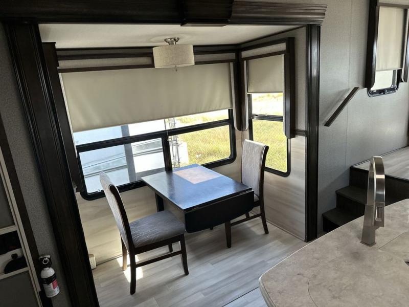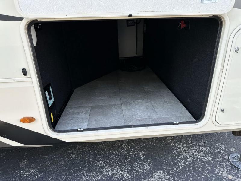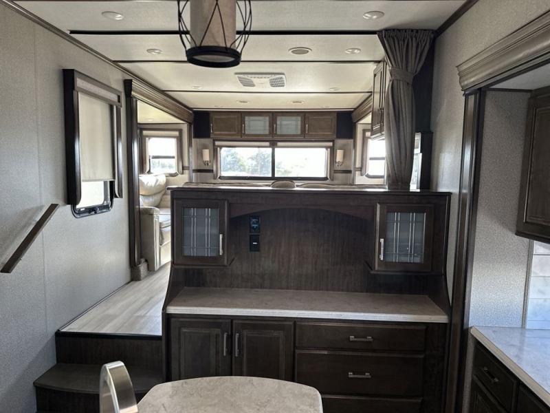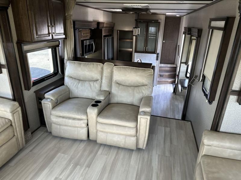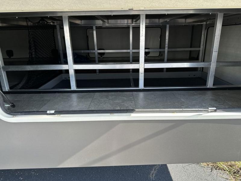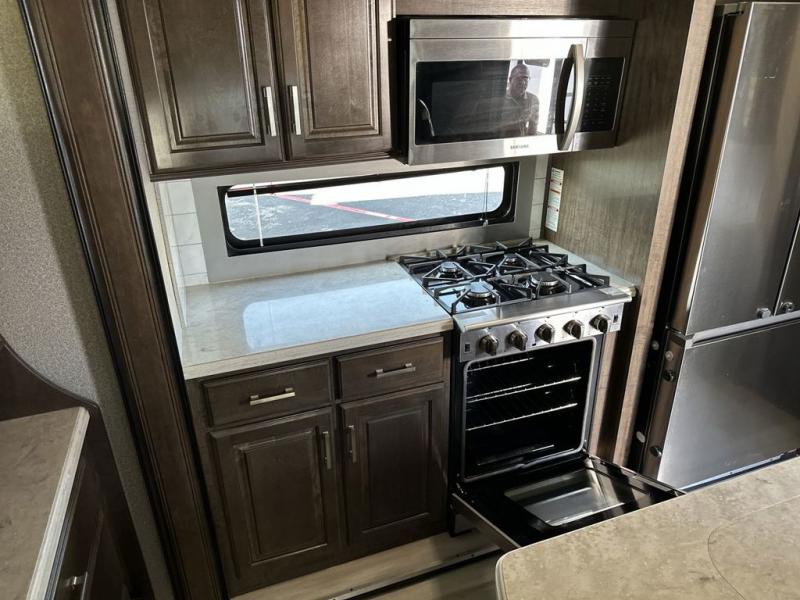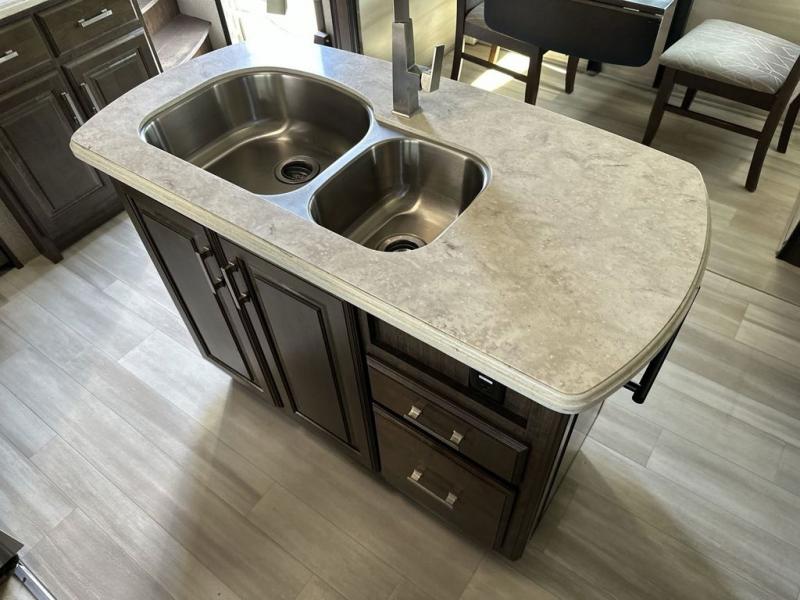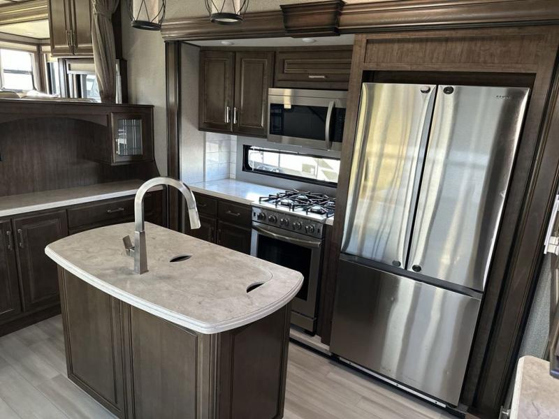 No worries about leaving anything behind with all the storage found throughout the interior and the exterior of this fifth wheel! From the bedroom closet and flip-up dresser, plus the overhead cabinets in the kitchen and separate living area to the exterior rear storage with a sliding tray and side access, there is a place for everything. Everyone can visit in the rear living area with an entertainment center, an LED TV, a fireplace and a window for great views while sitting on the dual tri-fold sofa slides and the theater seating. The buffet area can be utilized many ways, and the free-standing dinette offers a place to dine and play games. The kitchen offers full amenities including a hutch and oversized pantry. And you can stay refreshed with the full bathroom and get a good night's sleep on the queen bed slide or choose a king option.