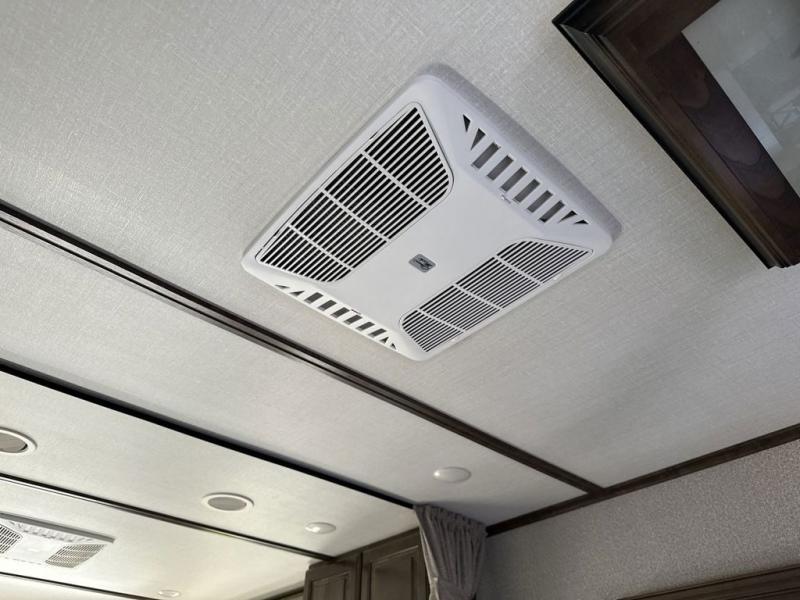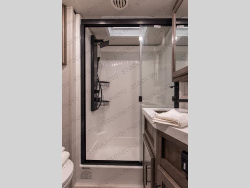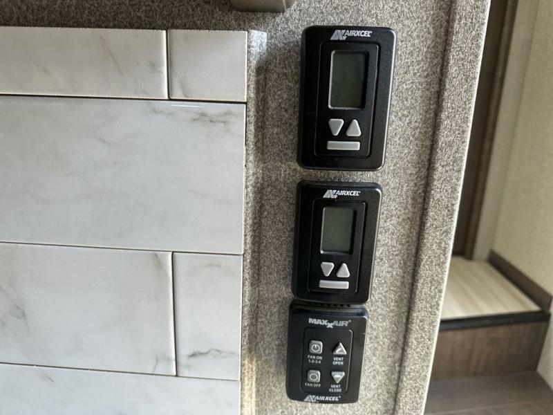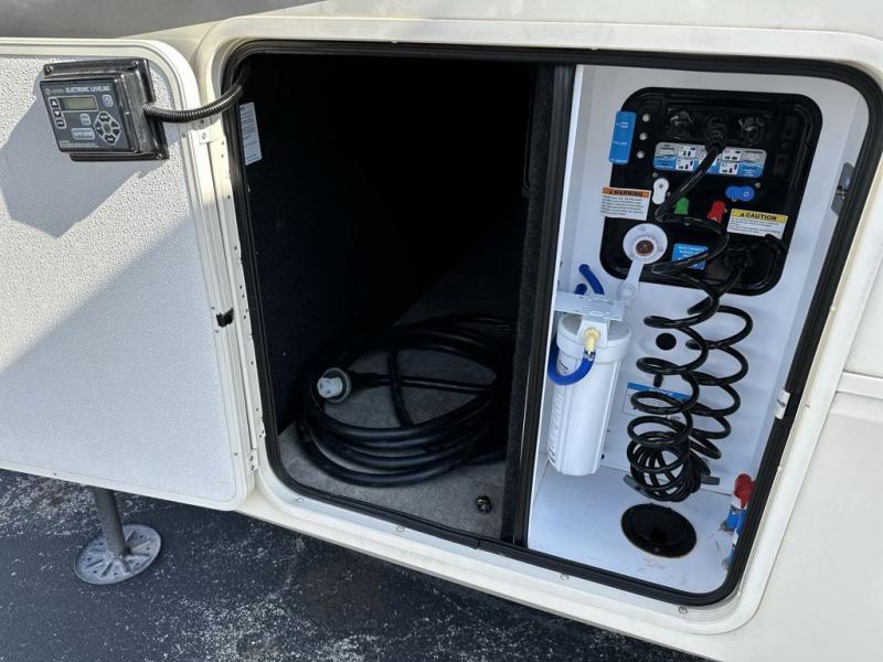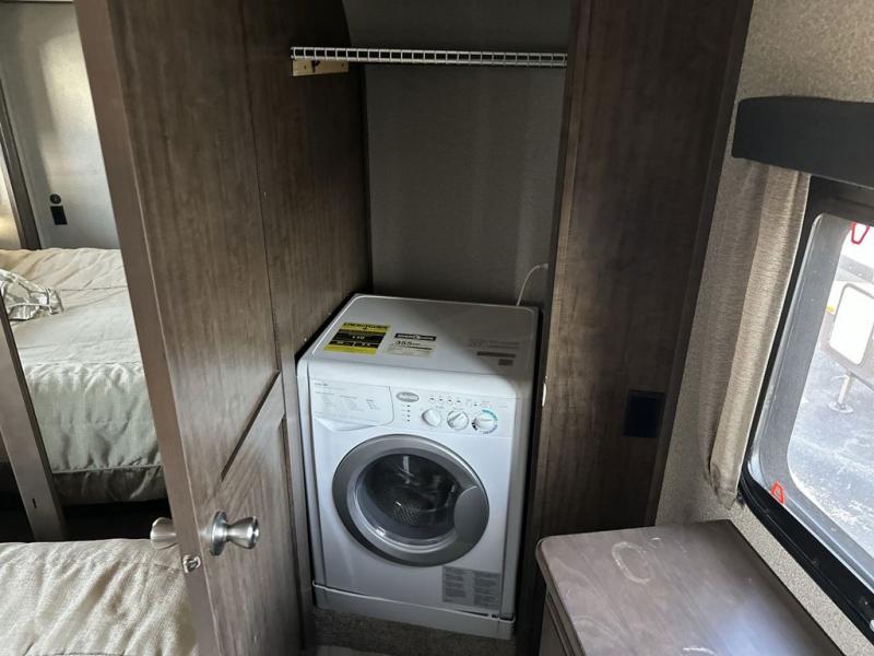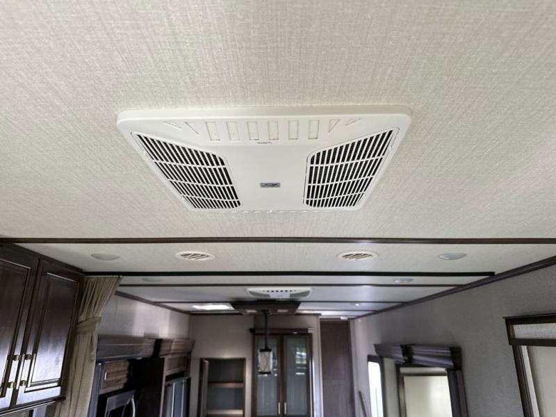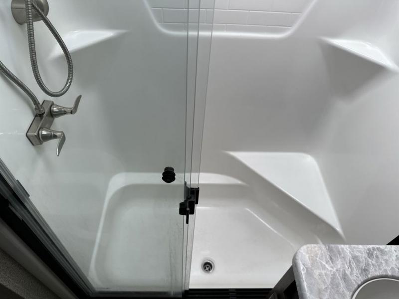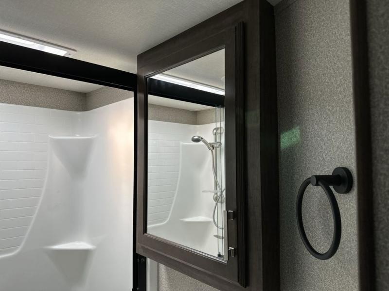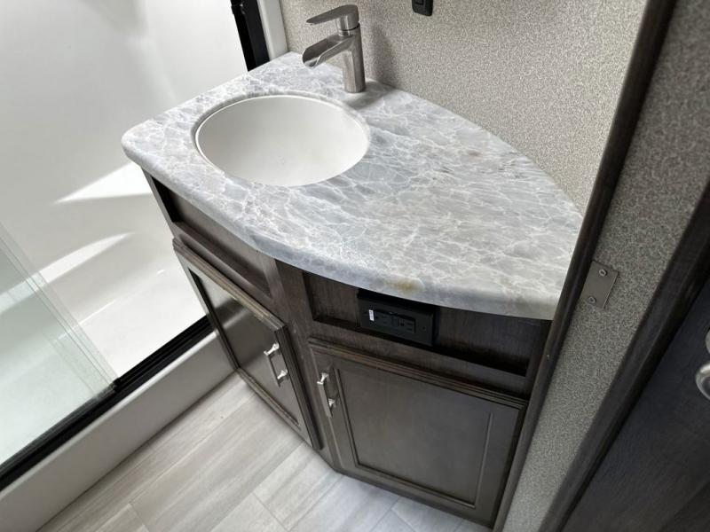 No worries about leaving anything behind with all the storage found throughout the interior and the exterior of this fifth wheel! From the bedroom closet and flip-up dresser, plus the overhead cabinets in the kitchen and separate living area to the exterior rear storage with a sliding tray and side access, there is a place for everything. Everyone can visit in the rear living area with an entertainment center, an LED TV, a fireplace and a window for great views while sitting on the dual tri-fold sofa slides and the theater seating. The buffet area can be utilized many ways, and the free-standing dinette offers a place to dine and play games. The kitchen offers full amenities including a hutch and oversized pantry. And you can stay refreshed with the full bathroom and get a good night's sleep on the queen bed slide or choose a king option.