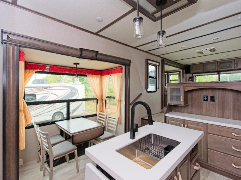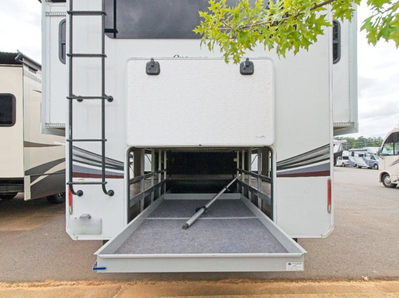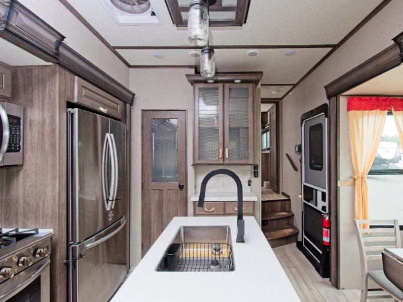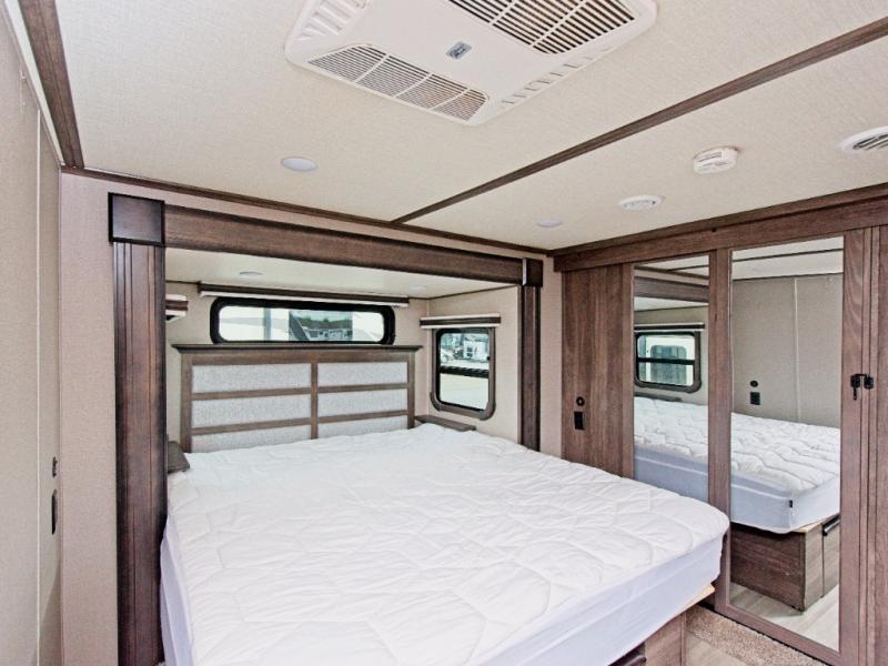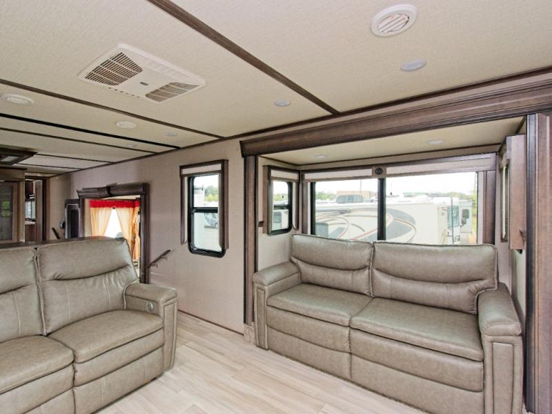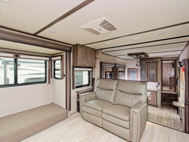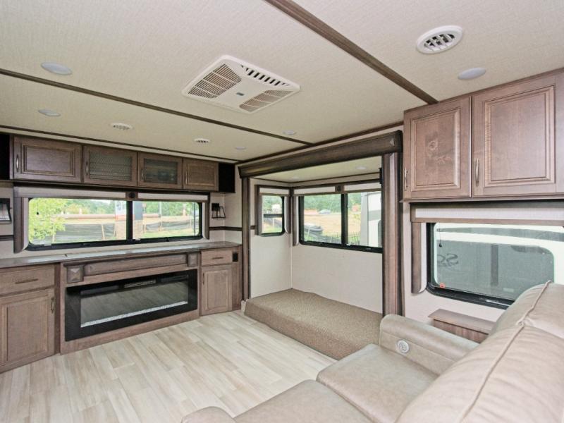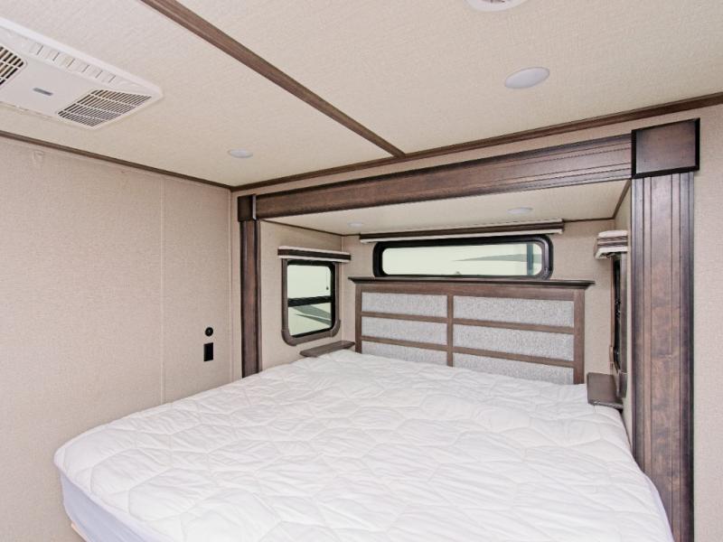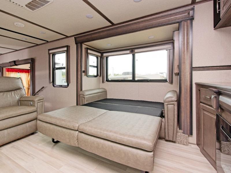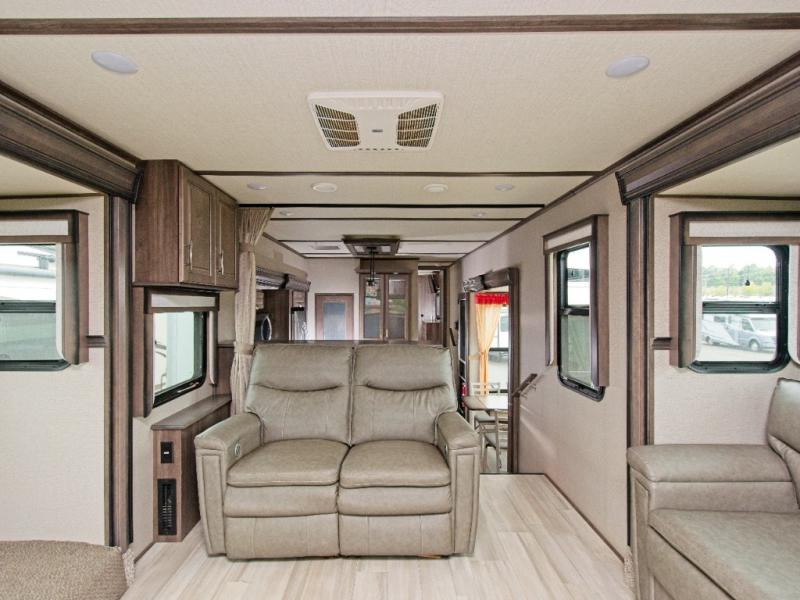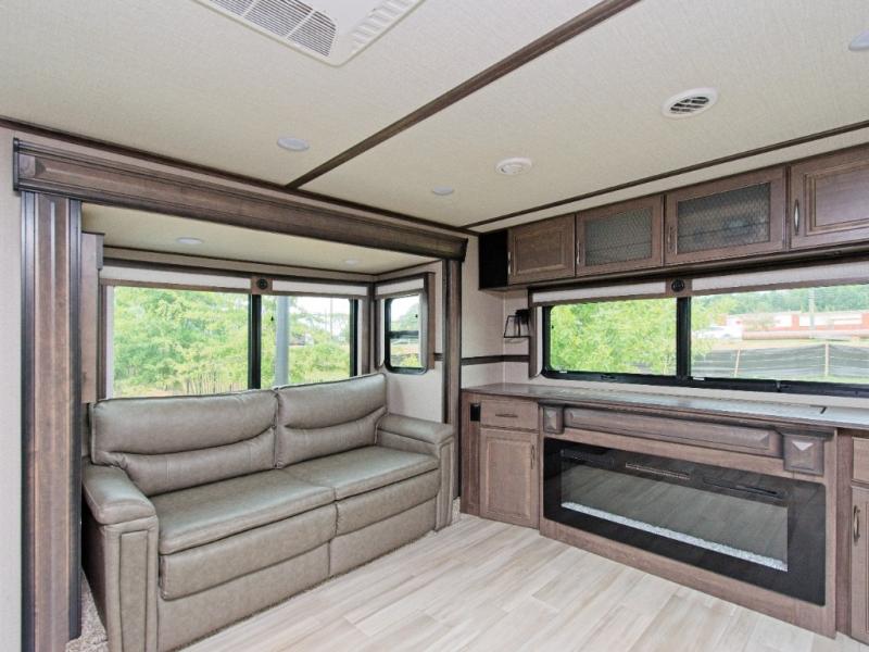 The standout feature of the 375RES is its unique raised rear living room, which creates a cozy, residential-style lounge area. With multiple sofas, theater seating, an entertainment center, and a fireplace, it’s the perfect space for relaxing or hosting family and friends. The elevated design also provides massive exterior storage underneath, so you can bring along everything you need for long adventures.