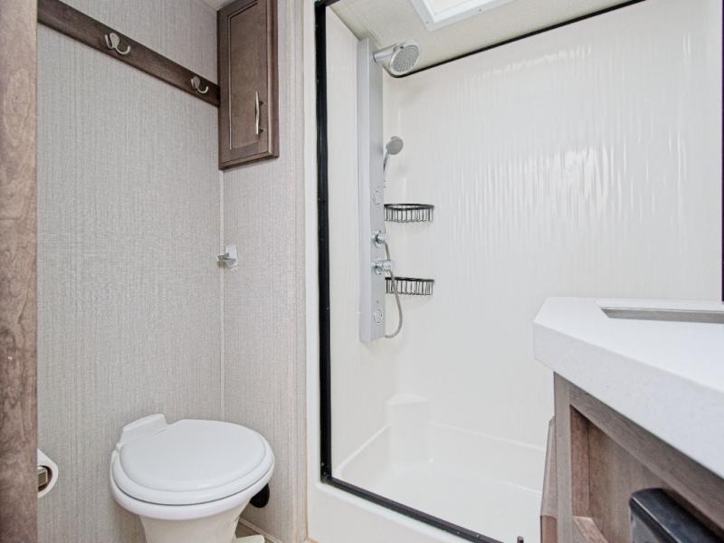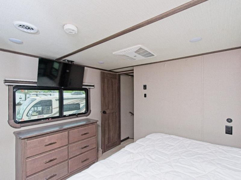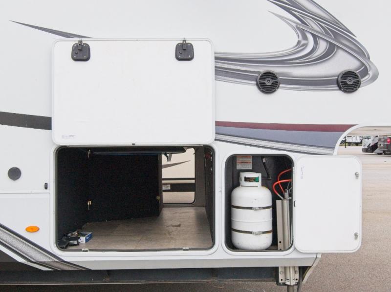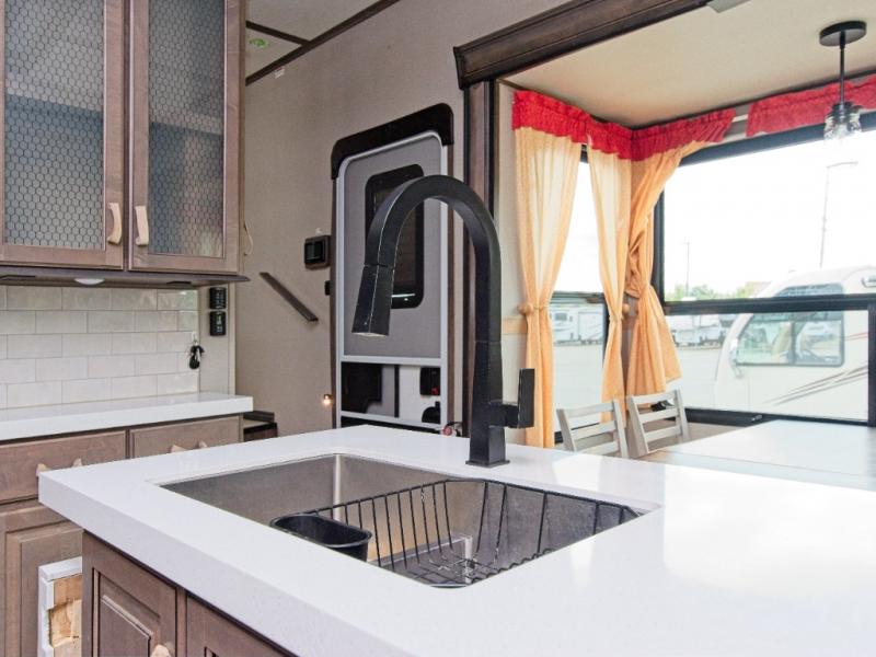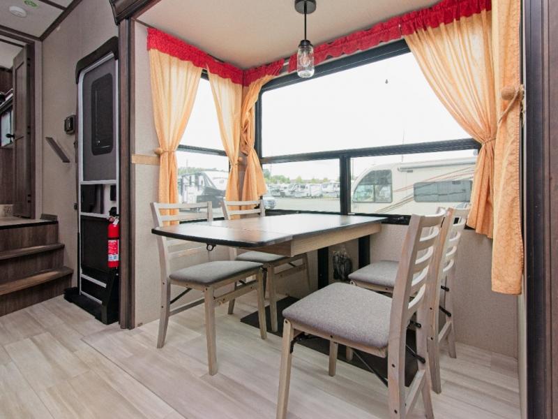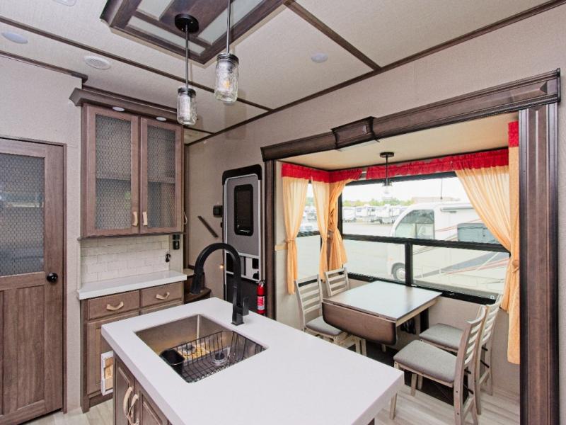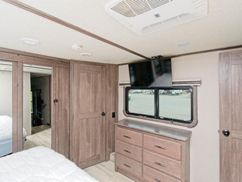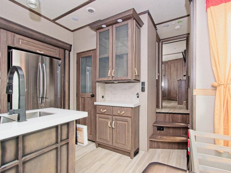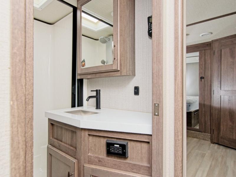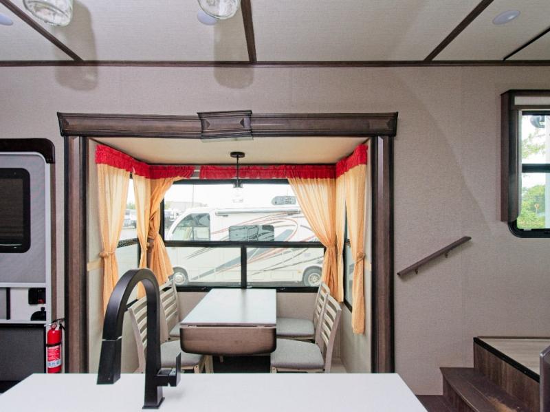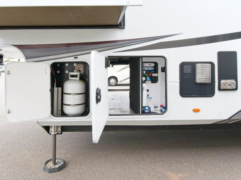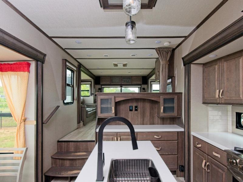 The standout feature of the 375RES is its unique raised rear living room, which creates a cozy, residential-style lounge area. With multiple sofas, theater seating, an entertainment center, and a fireplace, it’s the perfect space for relaxing or hosting family and friends. The elevated design also provides massive exterior storage underneath, so you can bring along everything you need for long adventures.