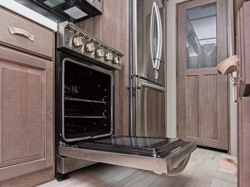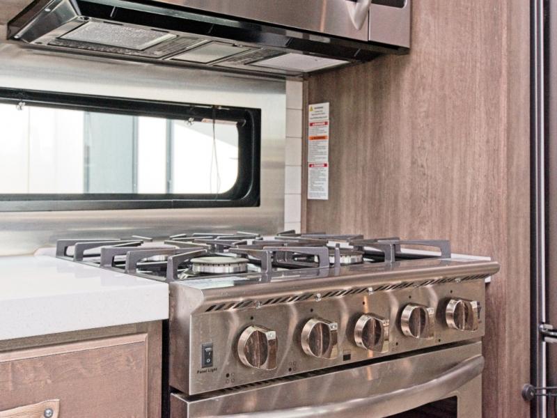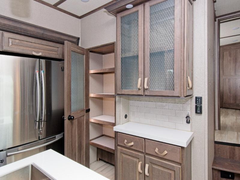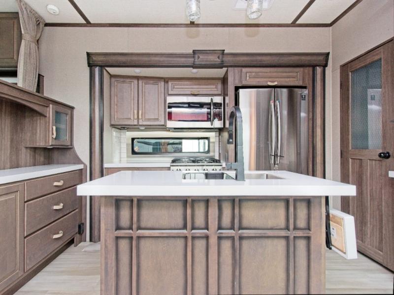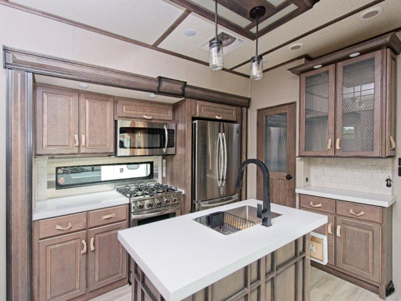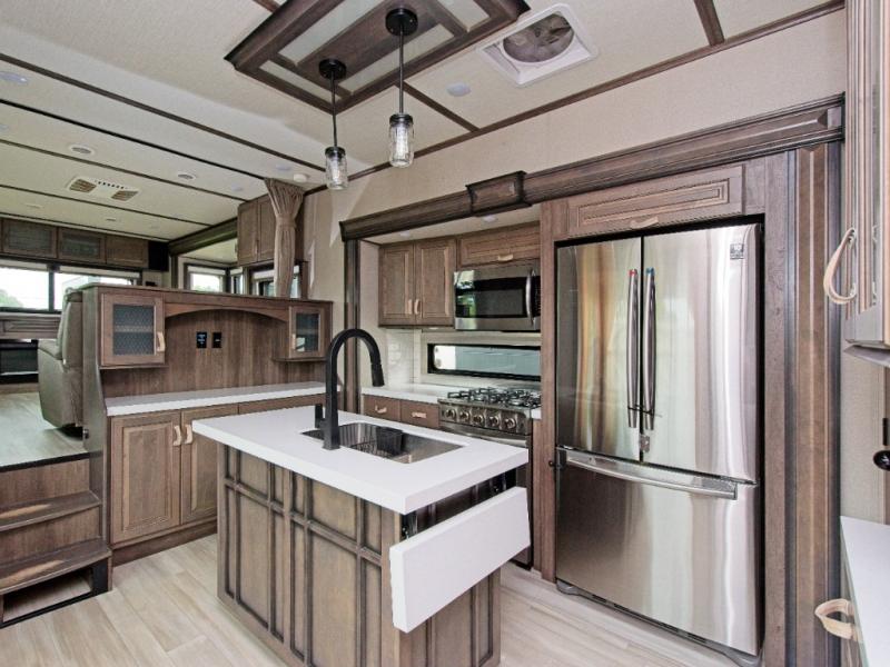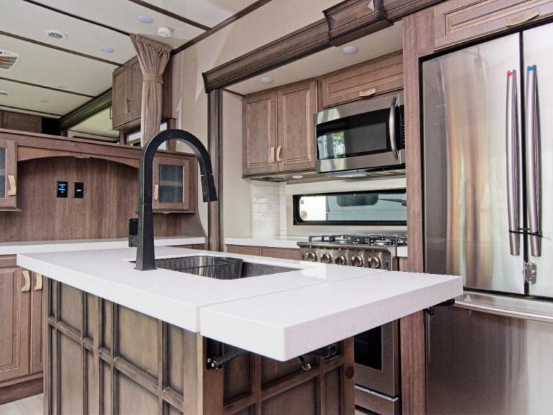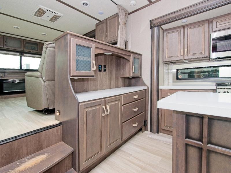 The gourmet kitchen is built to impress, featuring a large center island, solid-surface countertops, residential-style appliances, a pantry, and plenty of cabinetry. Cooking on the road has never been easier or more enjoyable.
