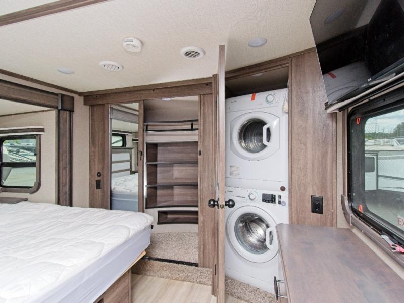 When it’s time to rest, the master suite offers a king-size bed, full wardrobe, and washer/dryer prep for ultimate convenience. The spacious bathroom includes a large shower with glass doors, dual sinks, and premium finishes, giving you a spa-like experience wherever you travel.