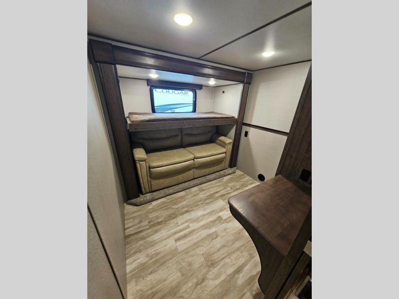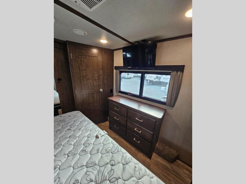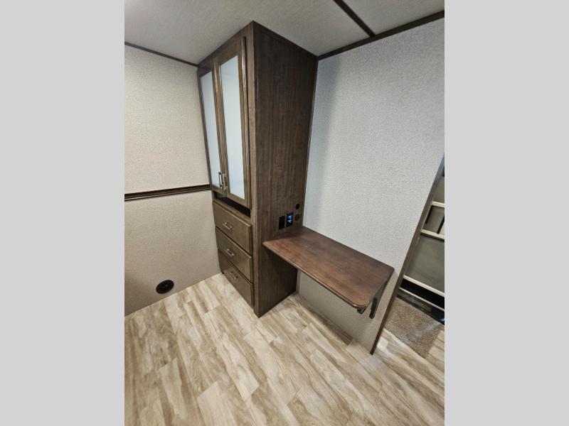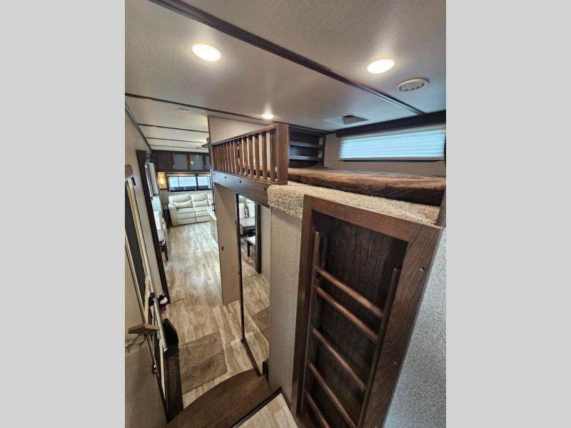 - you could be working steps away from the best views of the mountains in this Solitude fifth wheel! Imagine having a bunkhouse that includes a sofa and a desk for your multi-purpose room. You will find a loft above for extra sleeping space or storage, a full bathroom, and a master bedroom with everything you need! The kitchen includes a professional-grade stainless steel cooktop, built-in oven, microwave, a stainless steel 18 cu. ft. four-door refrigerator, plus a large pantry. You will also love the center island and hutch for additional space for your things. You will certainly enjoy the fireplace, theatre seating, and any option you choose to make your life better on the open road!
