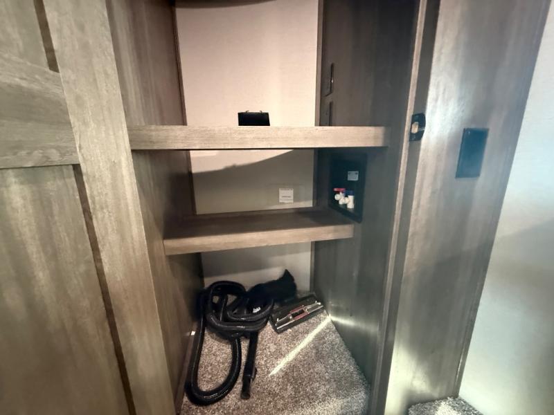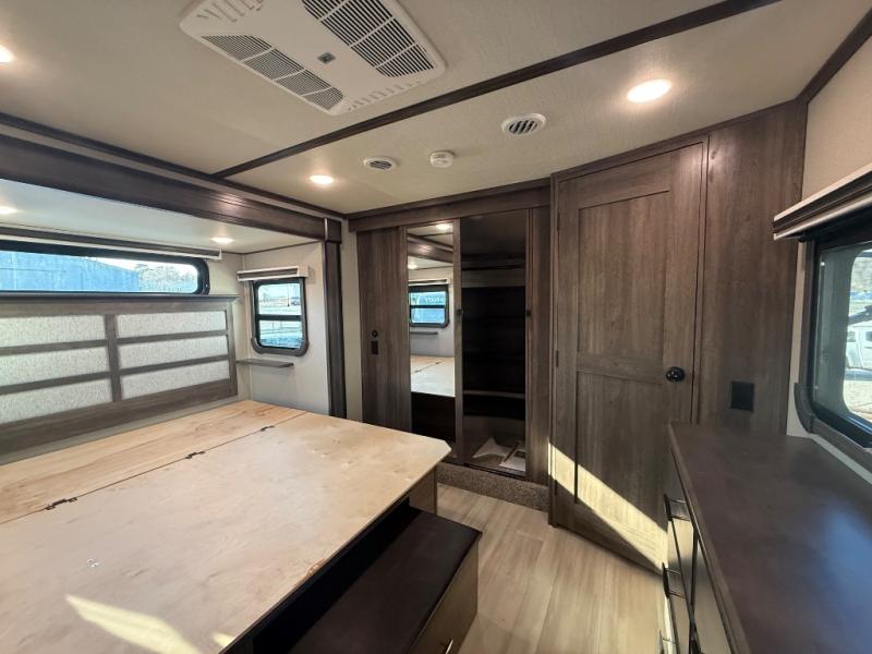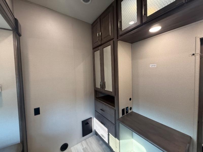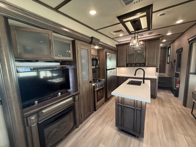 Whether you like to camp in cold or warm climates, you will have everything you need to stay cozy including a fireplace in this Solitude. The main living and kitchen area is spacious with dual opposing slides and offers theatre seating and a tri-fold sofa to relax on while watching the LED Smart TV and visiting with the cook in the kitchen that offers a large island and a residential kitchen faucet with a pull-out sprayer, a residential oven, an oversized pantry to store lots of goodies, and a real tile backsplash for style. The middle bunkhouse might be the reason you decided to own this fifth wheel which includes a fold down bunk and tri-fold sofa, plus a desk and closet making this room multi-functional. You can then retreat to your own master bedroom with a queen bed or choose the king option, a pull-out ottoman giving you a place to sit while taking off your shoes, an LED TV as well as a space prepped for a washer/dryer if you decide to add those appliances, plus more! You can also enjoy the outside grill and beverage cooler while relaxing under the awnings.