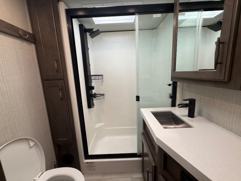 With each Solitude fifth wheel by Grand Design, you will have an exclusive superchassis, a wide rail design on heavy duty l-beam main rails providing a more stable jack stance, and maximum insulation from the thermal roof design and the exclusive full laminated walls to the insulated gooseneck and baggage doors. More features offered to help with traveling include the MORryde rubber pin box, the Tire Linc TPMS system, and the 6-point hydraulic system. And the 40,000 BTU of heating power, the heated underbelly and heated storage bay, the Evenflow heating system, and the Stealth A/C system with racetrack ducting, allow you to camp all year long! You will also find maximum storage solutions, residential features and so much more!