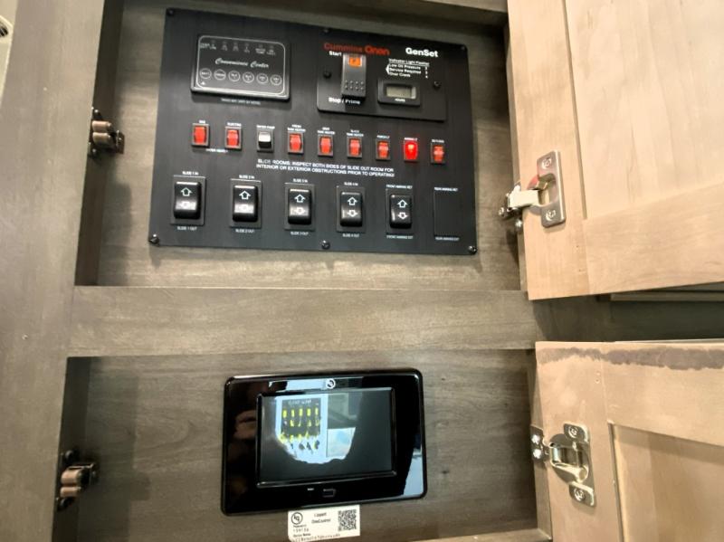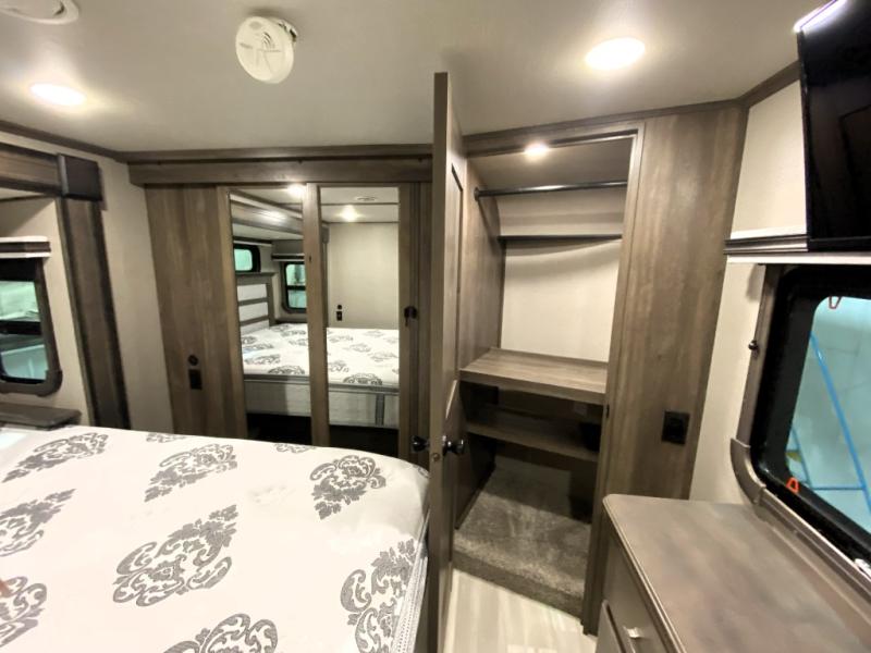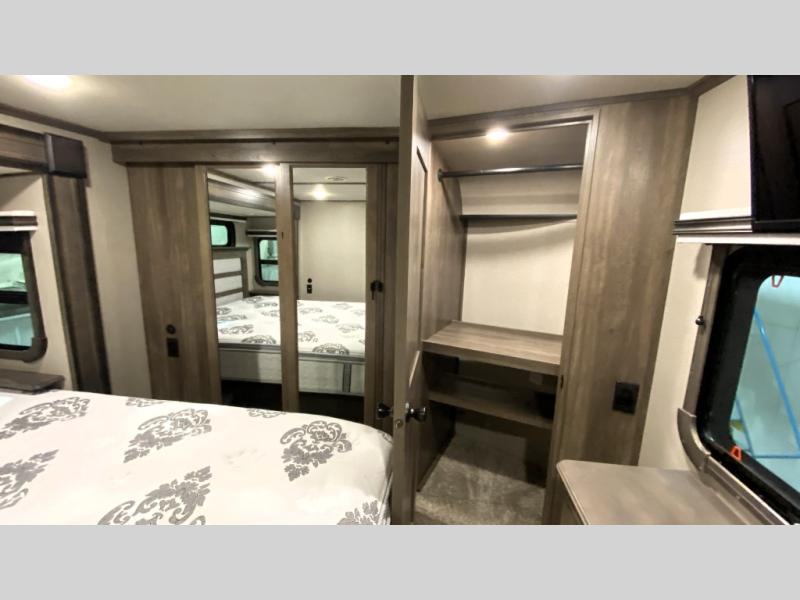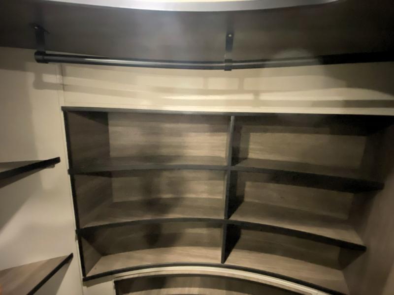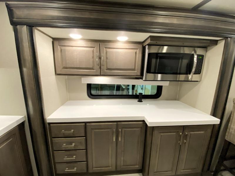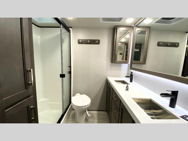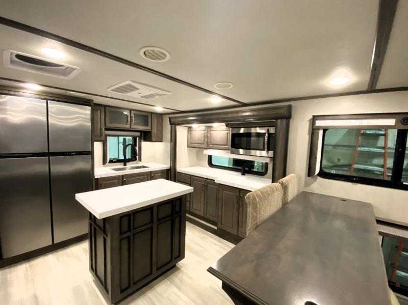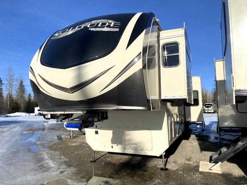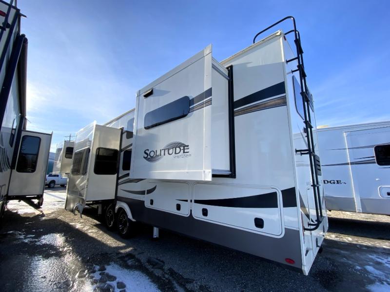 You will love your extended stays while traveling in this Solitude fifth wheel which features five slides! A rear raised kitchen provides the family chef a great space with opposing slides as well as an island for food prep. A raised bar top with two stools overlooks the center living space that also features dual opposing slides, two tri-fold sofas, and theatre seating. Dual sinks in the full bathroom means getting ready is easy for two, and the shower with skylight offers more head room that you are also sure to appreciate. As you wind down your day, the front master bedroom will be a welcomed retreat thanks to a queen bed slide with a pull-out ottoman to sit on when removing your shoes, and the walk-in closet provides ample space for all of your things. For added storage, a large exterior sliding tray offers more room for luggage and larger items. There is also a mid-coach pass-through storage compartment for other camping gear, and an optional pull-out kitchen and/or king bed option if you decide to change things up.