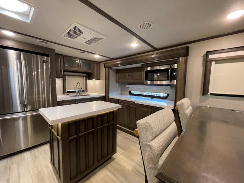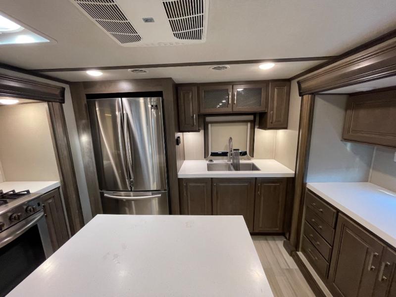 You will love your extended stays while traveling in this Solitude fifth wheel which features five slides! A rear raised kitchen provides the family chef a great space with opposing slides as well as an island for food prep. A raised bar top with two stools overlooks the center living space that also features dual opposing slides, two tri-fold sofas, and theatre seating. Dual sinks in the full bathroom means getting ready is easy for two, and the shower with skylight offers more head room that you are also sure to appreciate. As you wind down your day, the front master bedroom will be a welcomed retreat thanks to a queen bed slide with a pull-out ottoman to sit on when removing your shoes, and the walk-in closet provides ample space for all of your things. For added storage, a large exterior sliding tray offers more room for luggage and larger items. There is also a mid-coach pass-through storage compartment for other camping gear, and an optional pull-out kitchen and/or king bed option if you decide to change things up.
