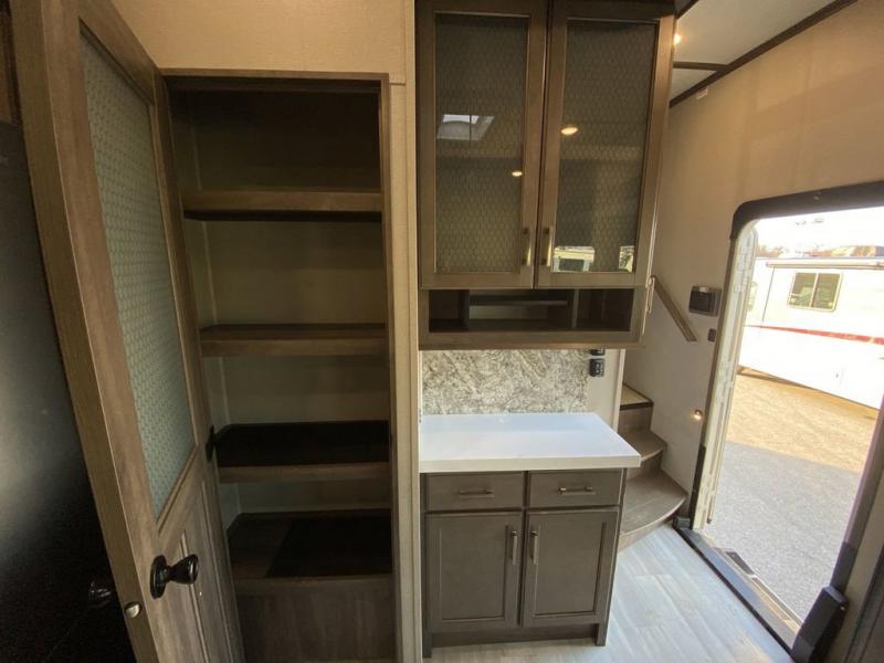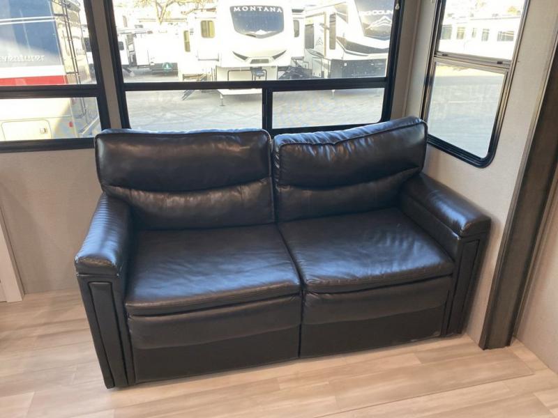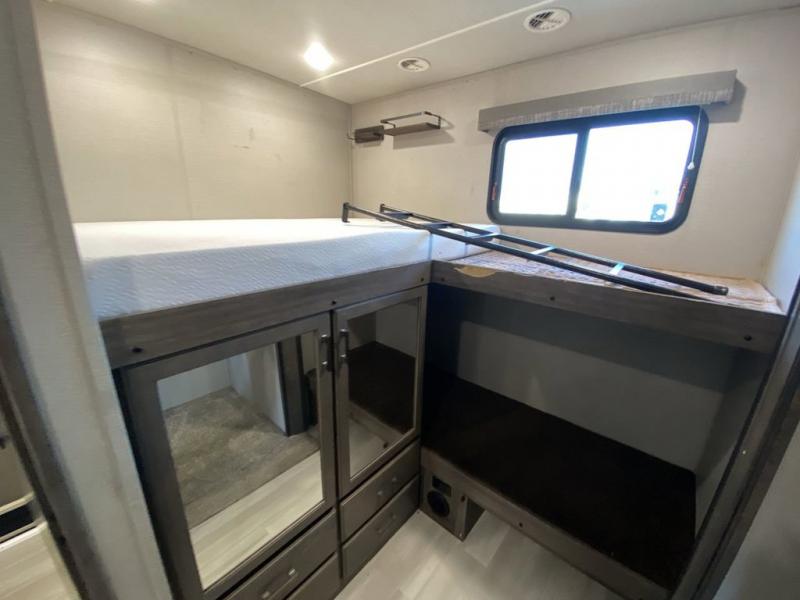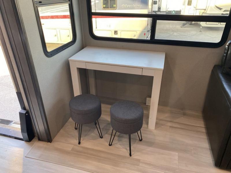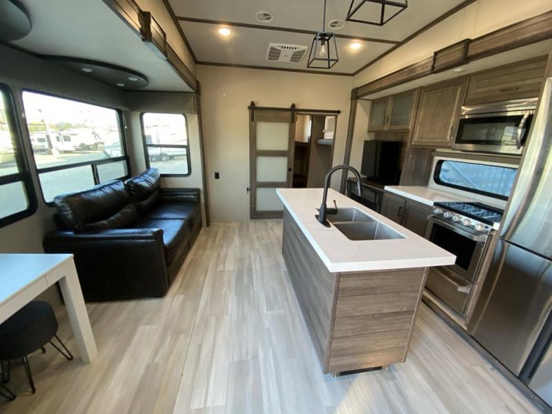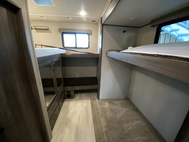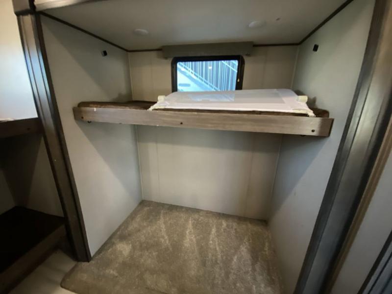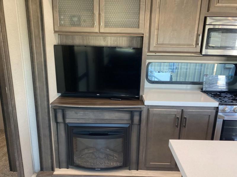 RV living with your family of seven or eight just got a lot more convenient with this fifth wheel! With four slide outs throughout giving you a spacious private front bedroom, central main living and kitchen area as well as a rear private bunkhouse, everyone will have their own space to work, play, eat and sleep! Everyone can gather to relax on the theater seats, the free-standing dinette as well as stand around the kitchen island as the cook prepares snacks and meals with full amenities including an oversized pantry, a hutch and a convection microwave all while watching the LED Smart TV and enjoying the fireplace. Take the group outside to eat under the two power awnings after grabbing your camping chairs from the pass-through storage. And the outside kitchen will come in handy for many meals. You will find four bunk beds and a tri-fold sofa to sleep on in the bunkhouse which offers a half bath with the second exterior entry/exit, and a queen bed in the front bedroom next to the full bathroom. You might like to add a few options such as a king bed, a washer/dryer, and/or a super sofa with tri-fold bed.
