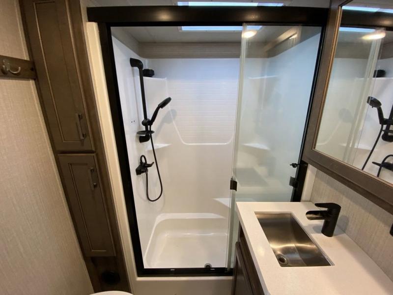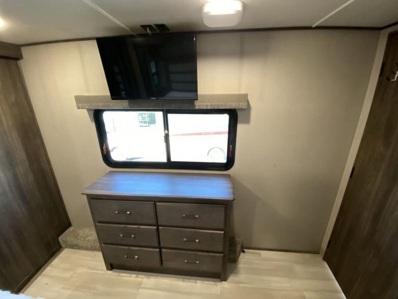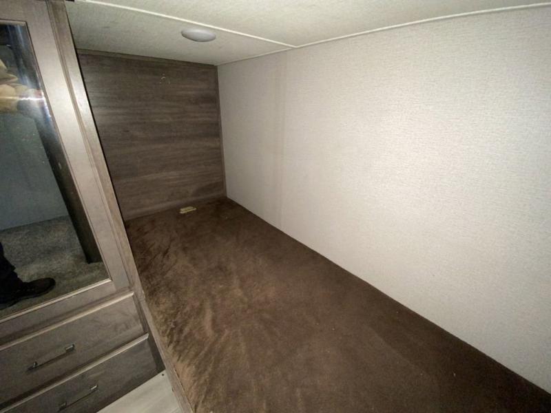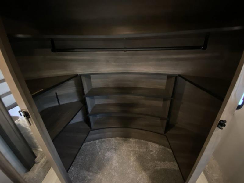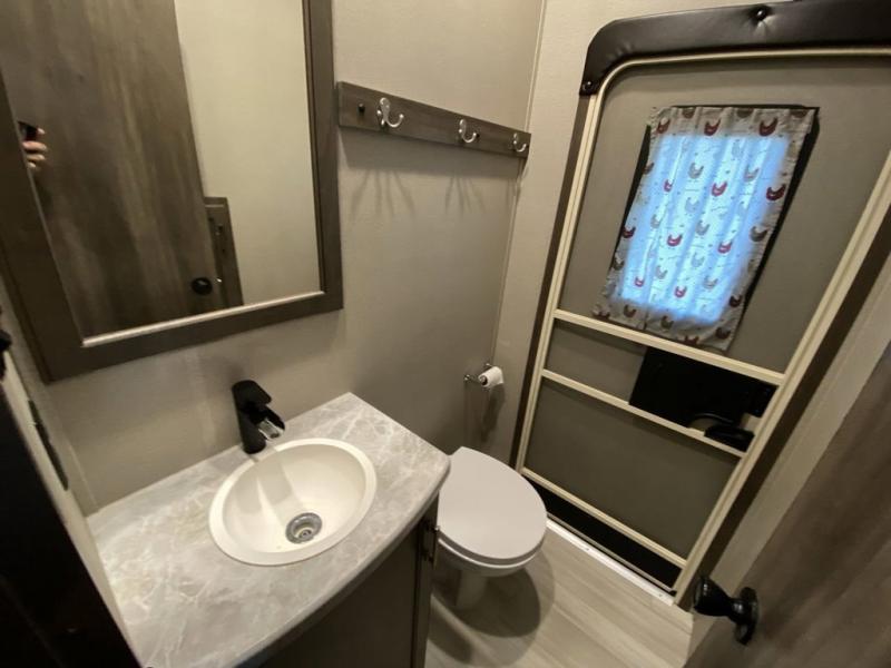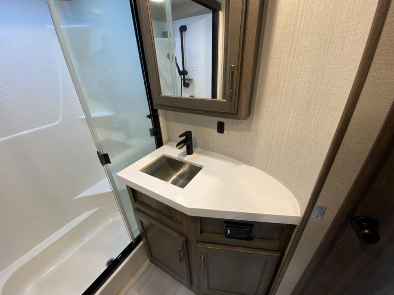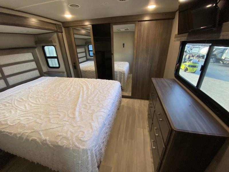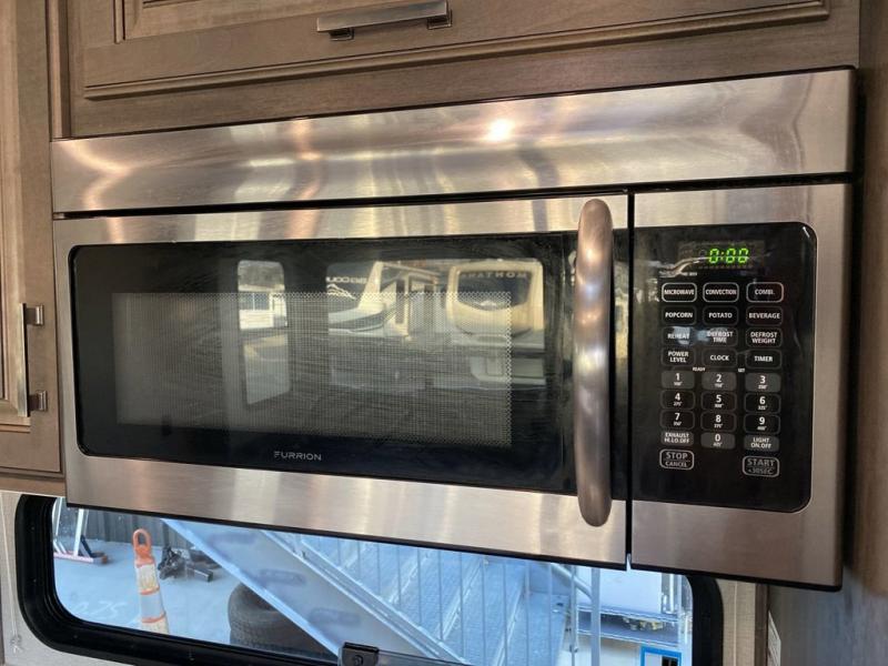 RV living with your family of seven or eight just got a lot more convenient with this fifth wheel! With four slide outs throughout giving you a spacious private front bedroom, central main living and kitchen area as well as a rear private bunkhouse, everyone will have their own space to work, play, eat and sleep! Everyone can gather to relax on the theater seats, the free-standing dinette as well as stand around the kitchen island as the cook prepares snacks and meals with full amenities including an oversized pantry, a hutch and a convection microwave all while watching the LED Smart TV and enjoying the fireplace. Take the group outside to eat under the two power awnings after grabbing your camping chairs from the pass-through storage. And the outside kitchen will come in handy for many meals. You will find four bunk beds and a tri-fold sofa to sleep on in the bunkhouse which offers a half bath with the second exterior entry/exit, and a queen bed in the front bedroom next to the full bathroom. You might like to add a few options such as a king bed, a washer/dryer, and/or a super sofa with tri-fold bed.