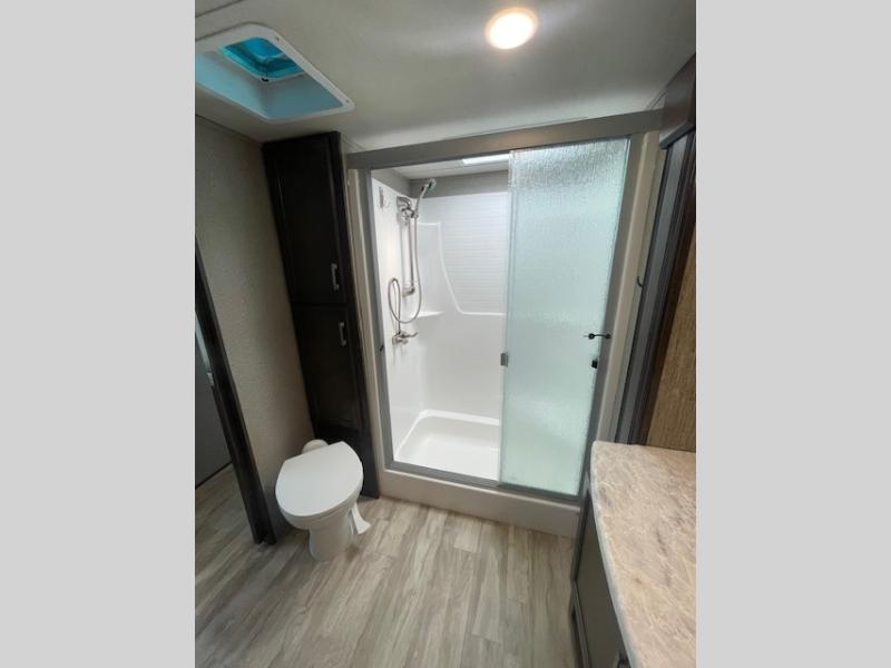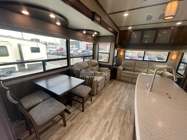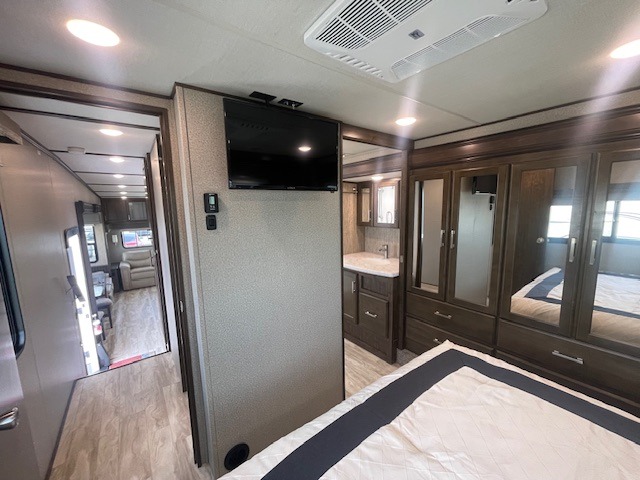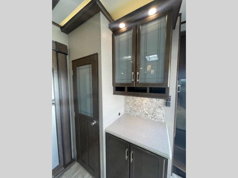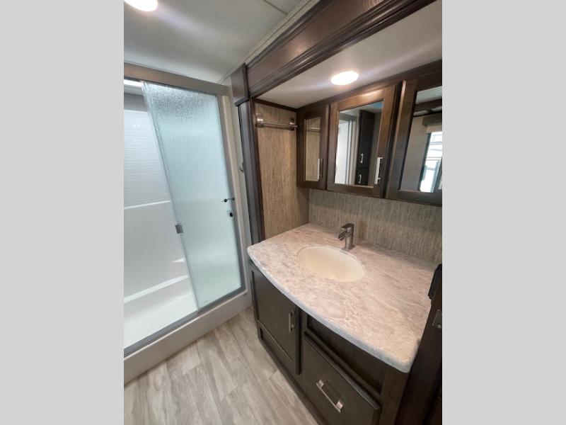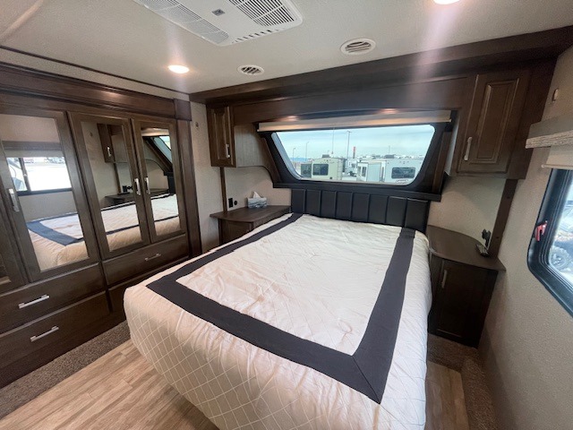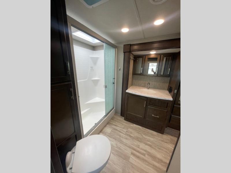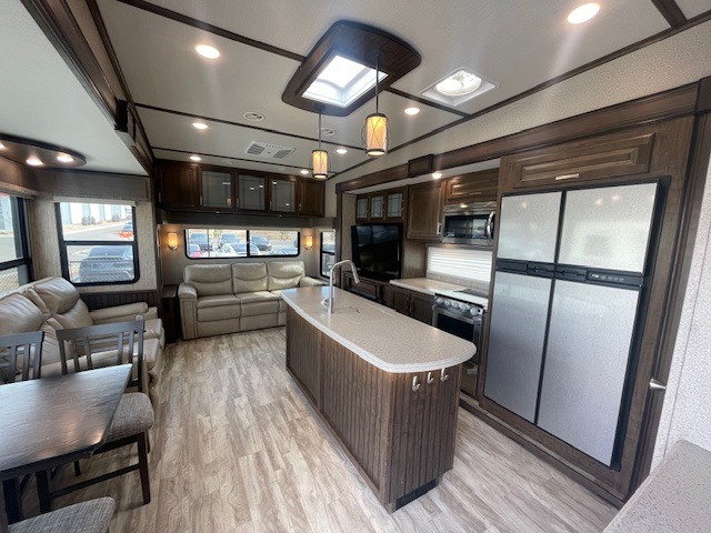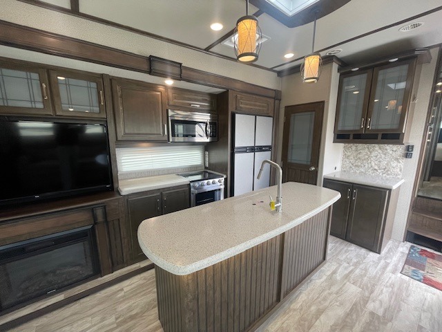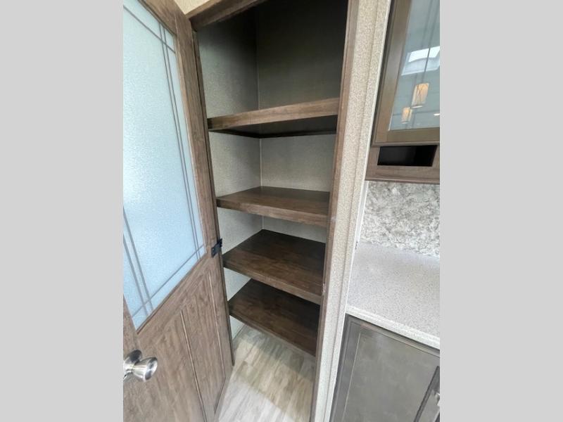 You and your spouse will love living in this fifth wheel with the master suite offering a walk-around queen bed with a king bed option, plus there is a 32" LED TV, and a slide out with a mirrored wardrobe and drawers plus a bathroom sink that stretches into the double-entry bathroom. The main living and kitchen area is spacious as well with two slides opening up the area around the kitchen island giving the cook plenty of space to make meals and you can relax on the theater seats, or the tri-fold sofa which offers sleeping space for guests. You can work or dine from the free-standing dinette while watching the LED Smart TV with fireplace below. And the oversized pantry as well as the hutch offers more storage for the food and picture frames. You might like to add a washer/dryer option if you don't want to use the appliances at the RV park, and there is a solar package option available.