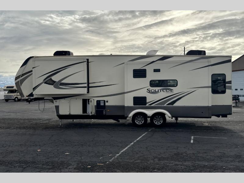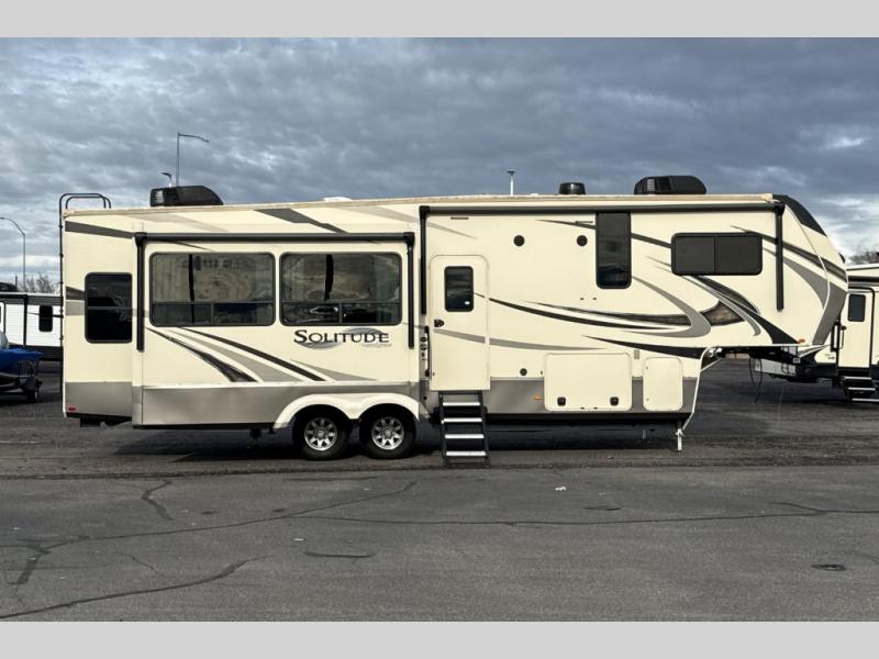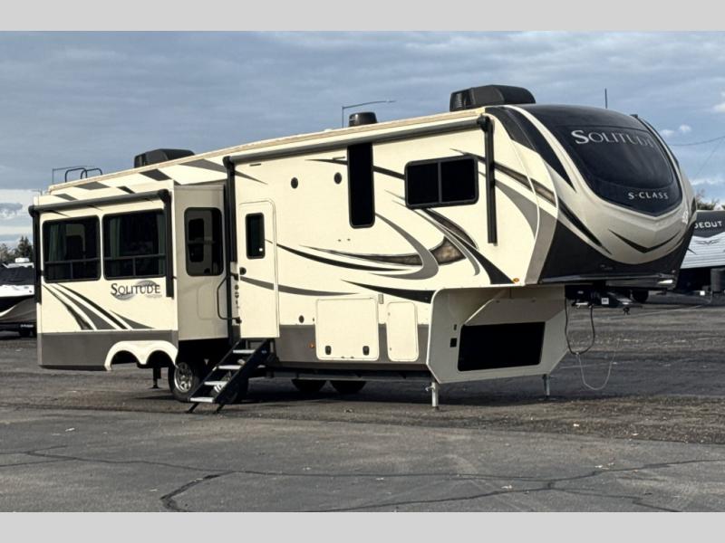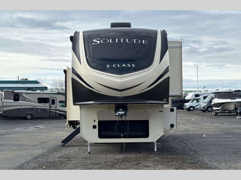 With any Grand Design Solitude S-Class fifth wheel you can enjoy years of full-time RVing or weeklong trips during any season thanks to the Weather-Tek package which provides maximum insulation from the thermal roof design, the fully laminated walls, the triple insulated main floor, and the exclusive Rail-Tite underbelly seal and insulated gooseneck. Each is built on an exclusive superchassis with 101" wide body construction for more livable floor space, and includes a wide rail design with reinforced axle hangers. The interior offers power theater seats with heat and massage for maximum comfort, no carpet in slides/flush floor kitchen slides, solid surface bathroom countertops for style and easy care, plus so much more! Choose your Solitude S-Class and start living the dream!