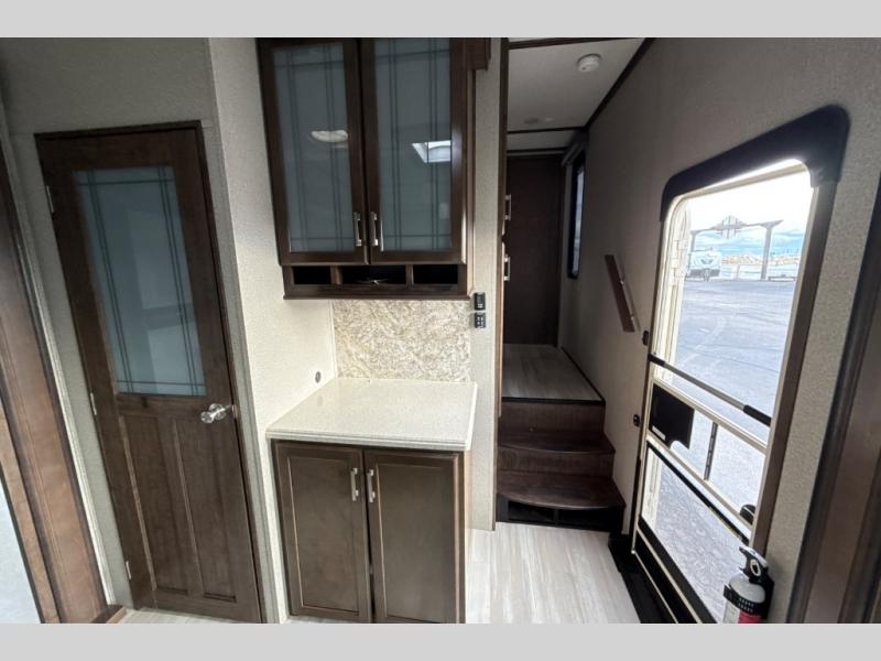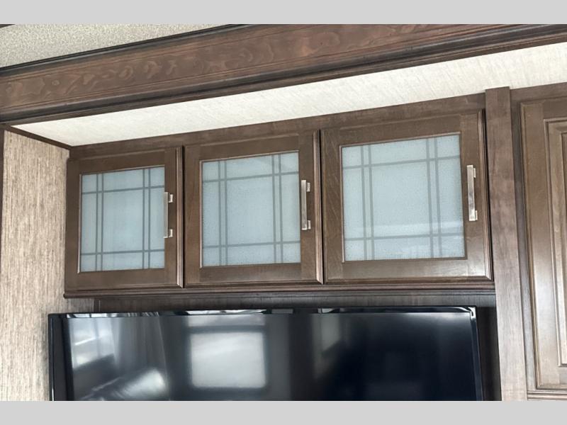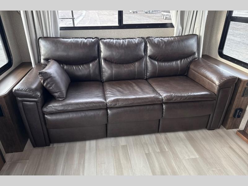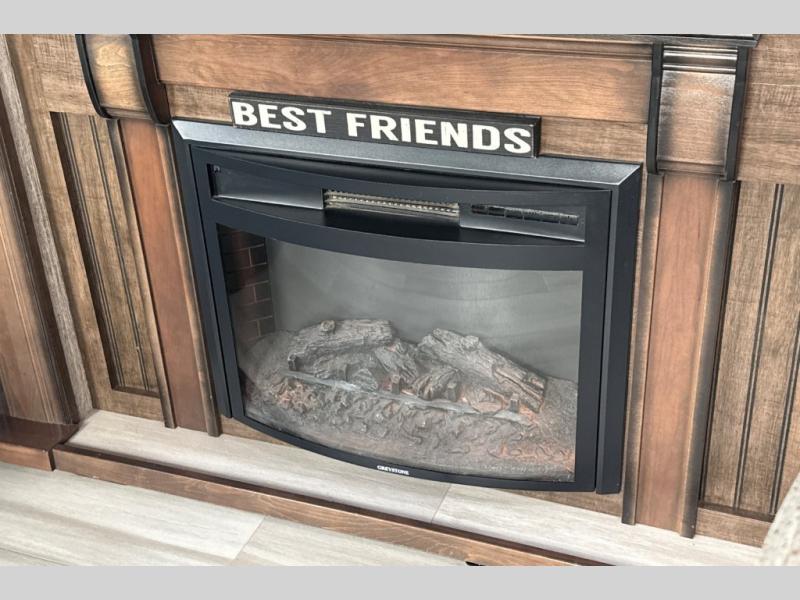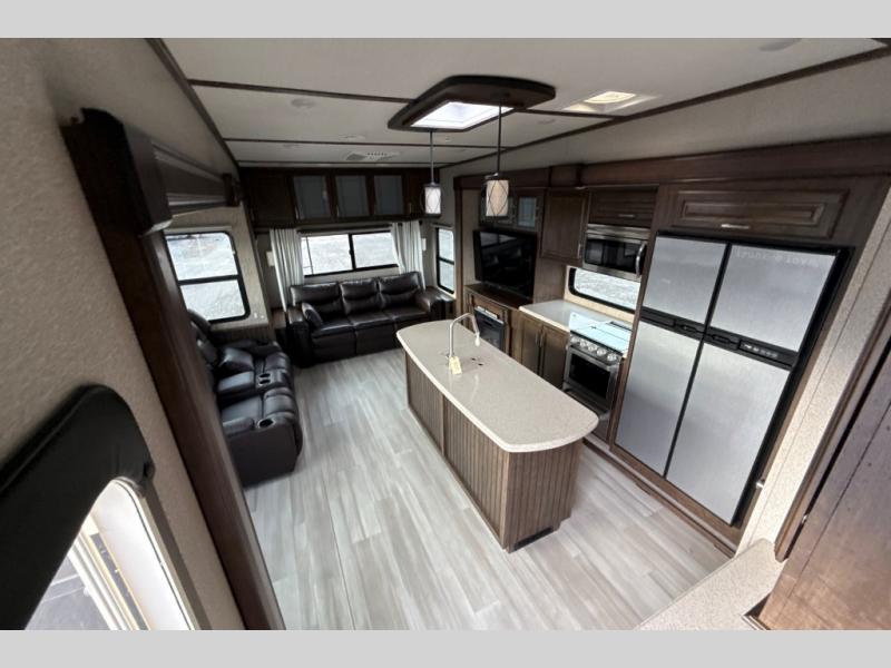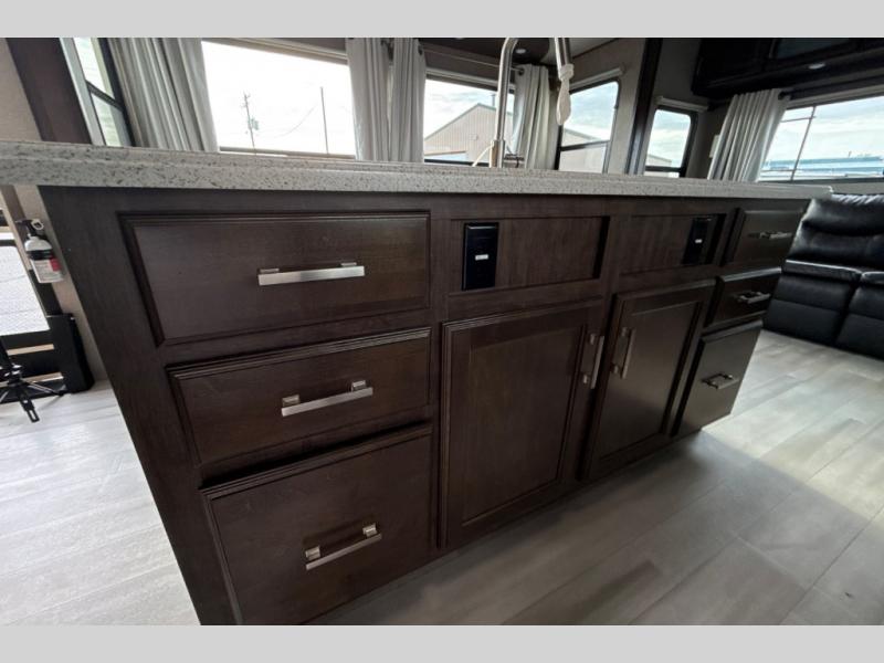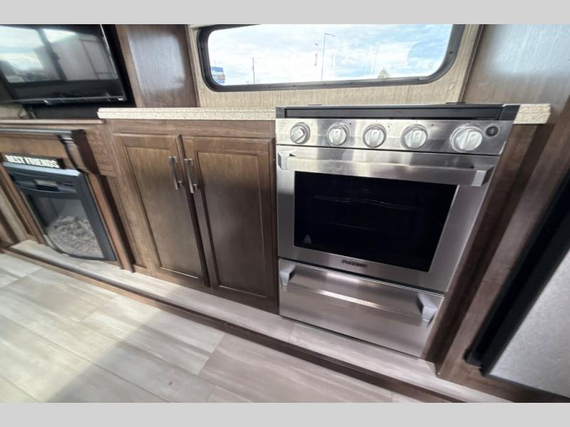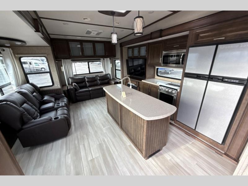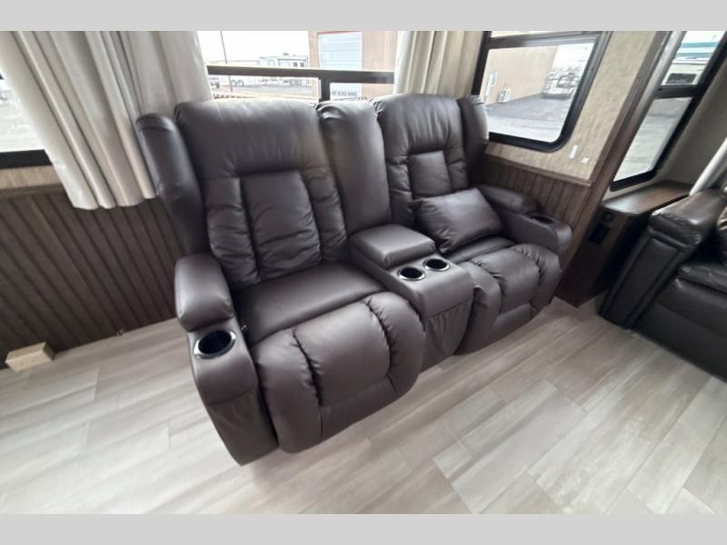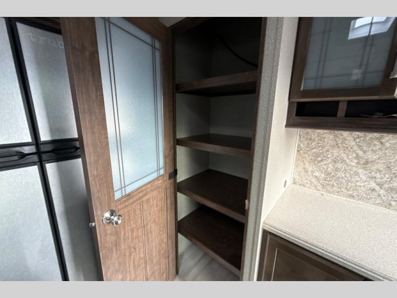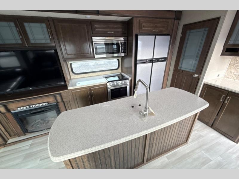 You and your spouse will love living in this fifth wheel with the master suite offering a walk-around queen bed with a king bed option, plus there is a 32" LED TV, and a slide out with a mirrored wardrobe and drawers plus a bathroom sink that stretches into the double-entry bathroom. The main living and kitchen area is spacious as well with two slides opening up the area around the kitchen island giving the cook plenty of space to make meals and you can relax on the theater seats, or the tri-fold sofa which offers sleeping space for guests. You can work or dine from the free-standing dinette while watching the LED Smart TV with fireplace below. And the oversized pantry as well as the hutch offers more storage for the food and picture frames. You might like to add a washer/dryer option if you don't want to use the appliances at the RV park, and there is a solar package option available.