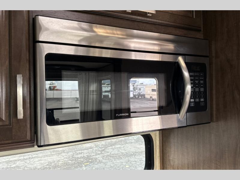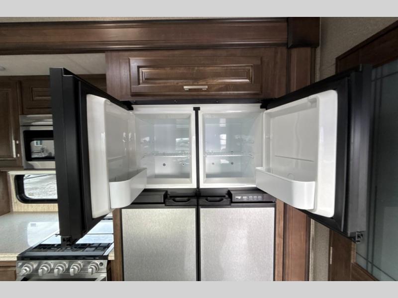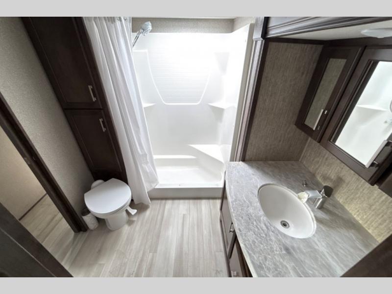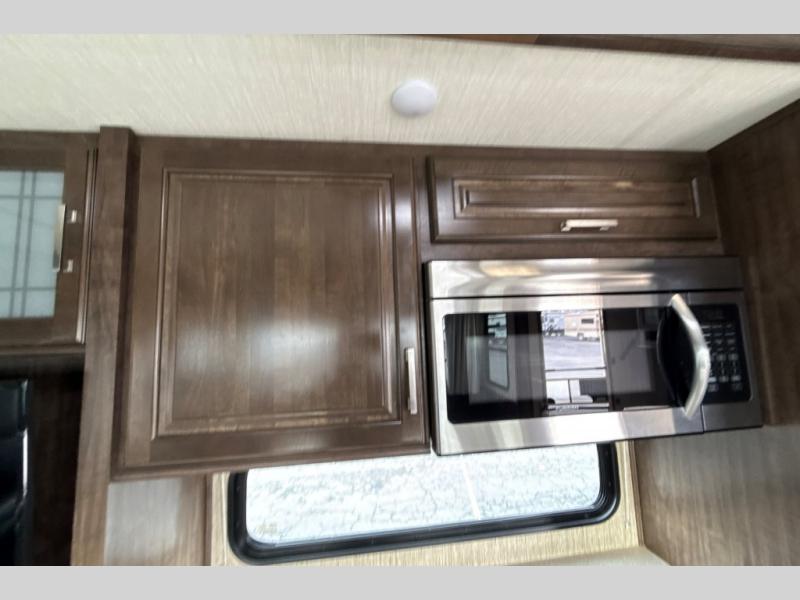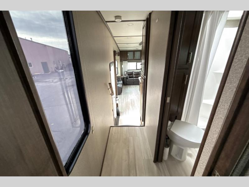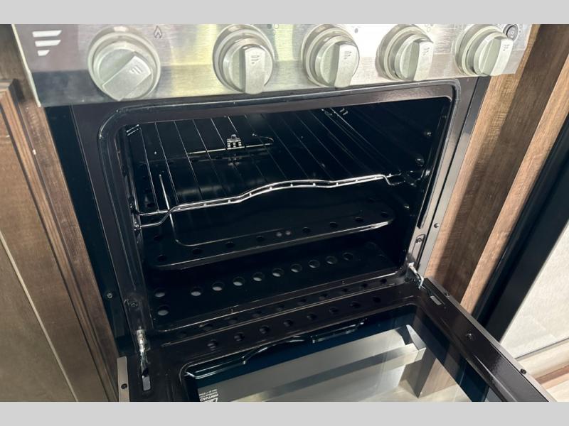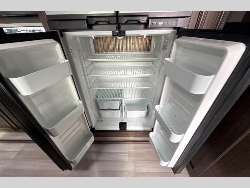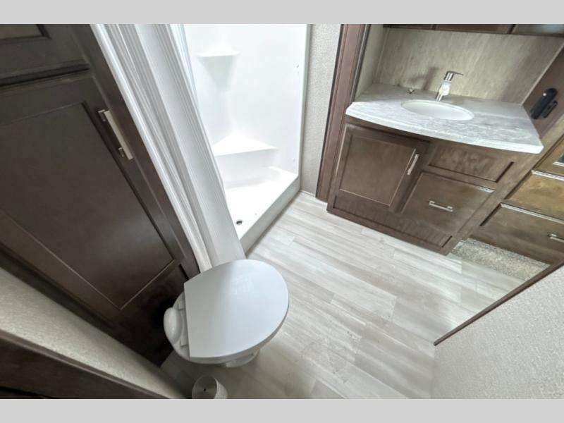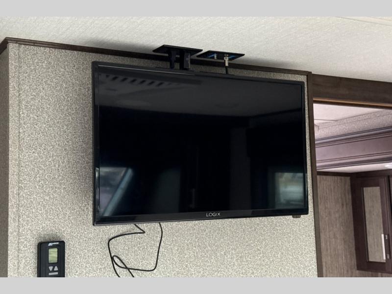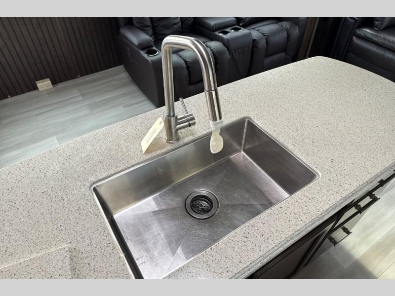 You and your spouse will love living in this fifth wheel with the master suite offering a walk-around queen bed with a king bed option, plus there is a 32" LED TV, and a slide out with a mirrored wardrobe and drawers plus a bathroom sink that stretches into the double-entry bathroom. The main living and kitchen area is spacious as well with two slides opening up the area around the kitchen island giving the cook plenty of space to make meals and you can relax on the theater seats, or the tri-fold sofa which offers sleeping space for guests. You can work or dine from the free-standing dinette while watching the LED Smart TV with fireplace below. And the oversized pantry as well as the hutch offers more storage for the food and picture frames. You might like to add a washer/dryer option if you don't want to use the appliances at the RV park, and there is a solar package option available.
