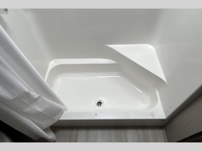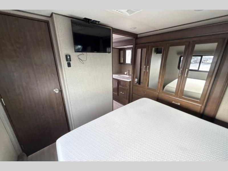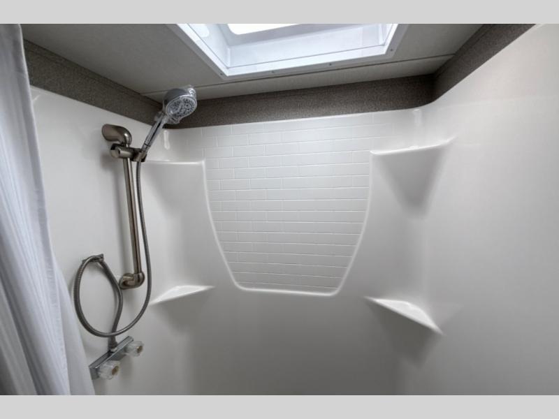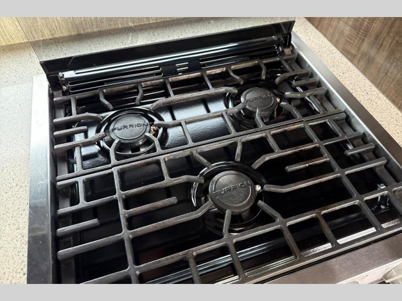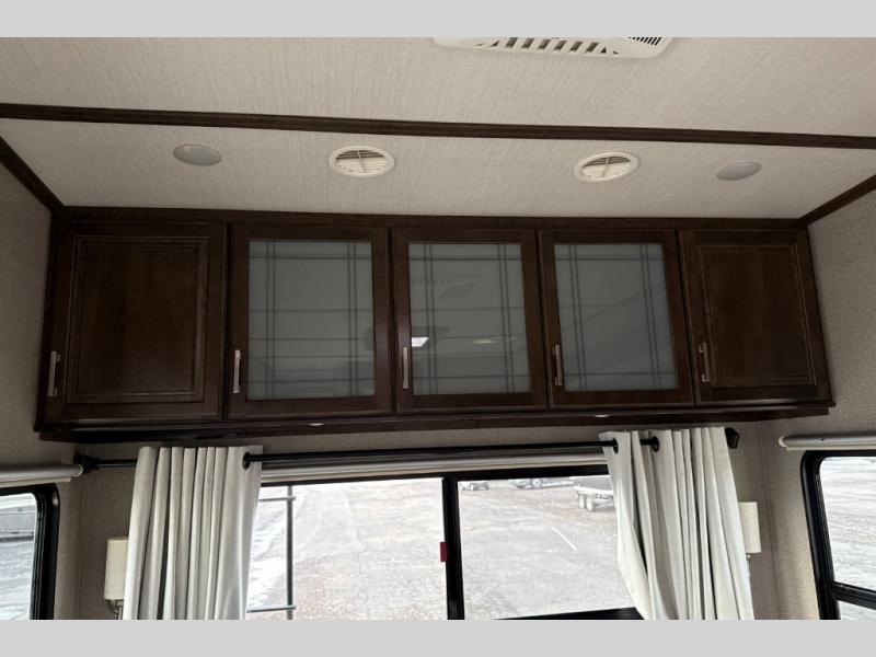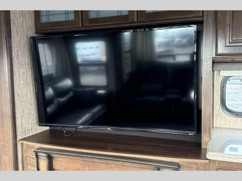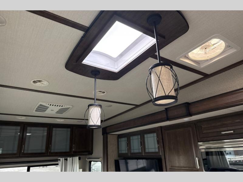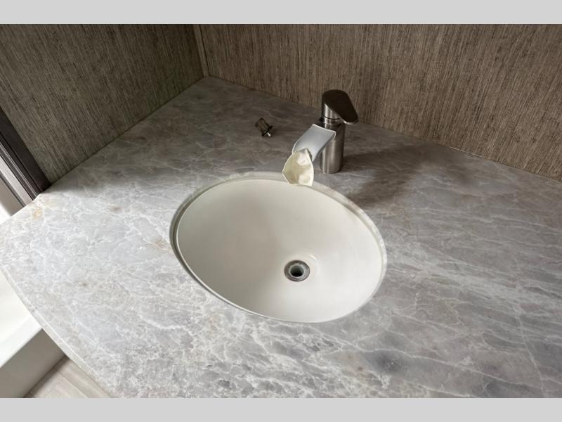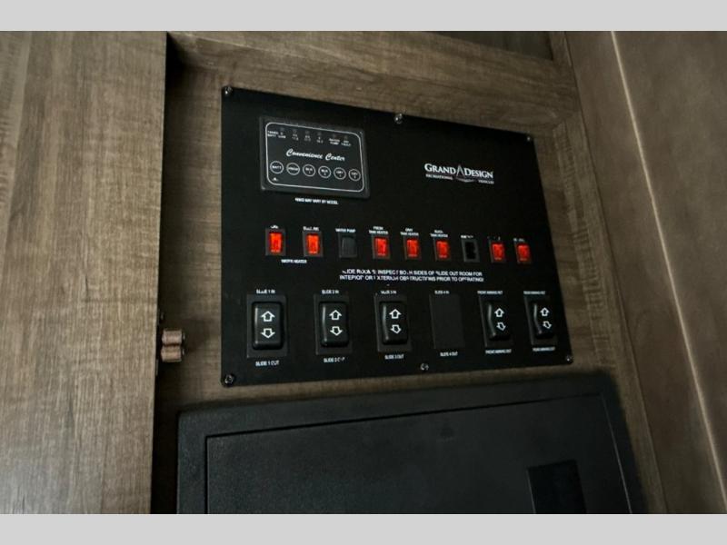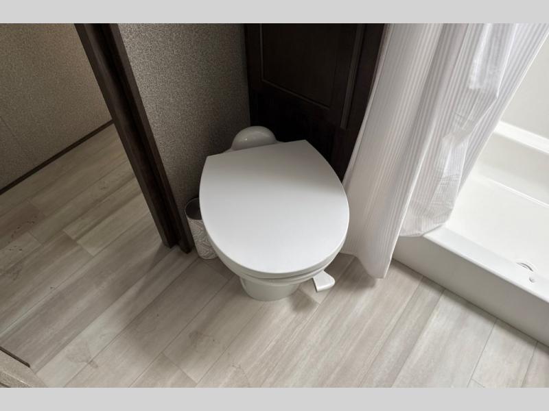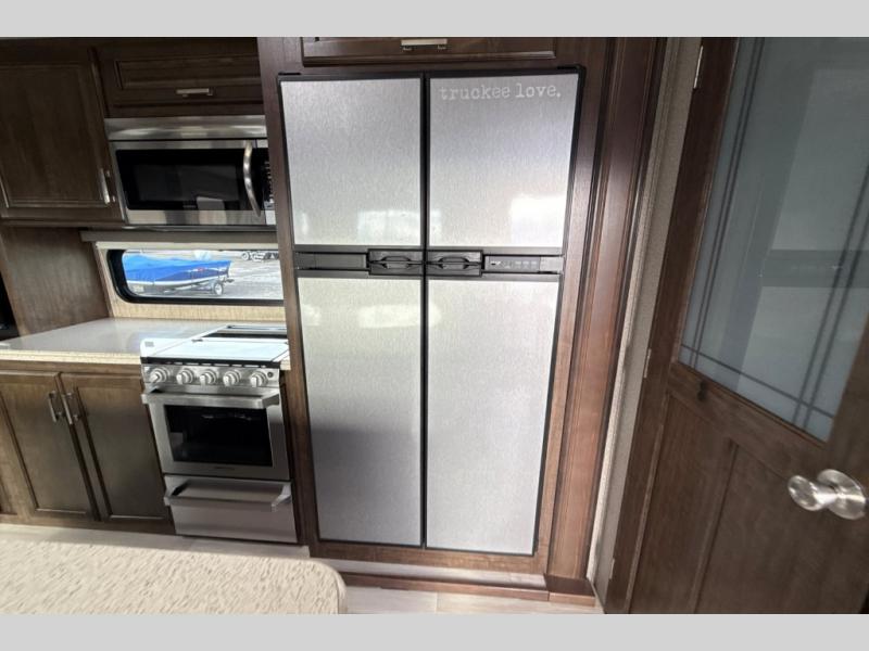 You and your spouse will love living in this fifth wheel with the master suite offering a walk-around queen bed with a king bed option, plus there is a 32" LED TV, and a slide out with a mirrored wardrobe and drawers plus a bathroom sink that stretches into the double-entry bathroom. The main living and kitchen area is spacious as well with two slides opening up the area around the kitchen island giving the cook plenty of space to make meals and you can relax on the theater seats, or the tri-fold sofa which offers sleeping space for guests. You can work or dine from the free-standing dinette while watching the LED Smart TV with fireplace below. And the oversized pantry as well as the hutch offers more storage for the food and picture frames. You might like to add a washer/dryer option if you don't want to use the appliances at the RV park, and there is a solar package option available.