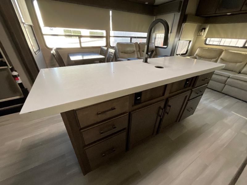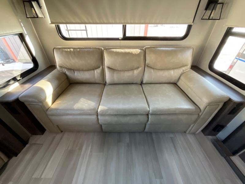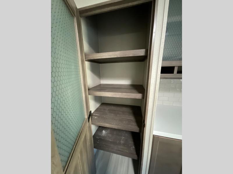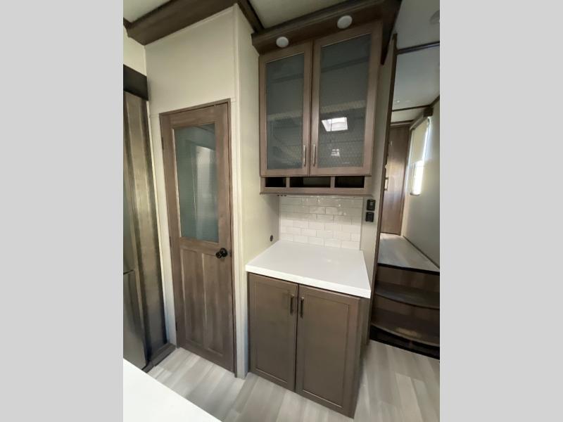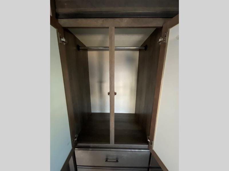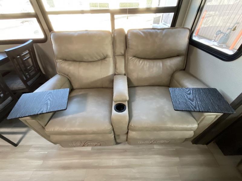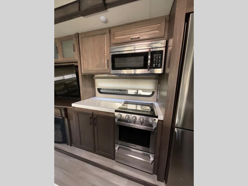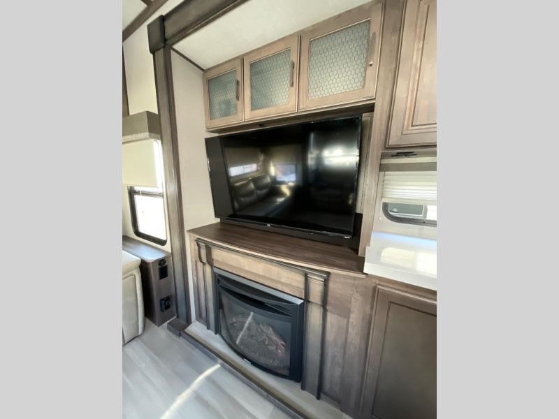 You and your spouse will love living in this fifth wheel with the master suite offering a walk-around queen bed with a king bed option, plus there is a 32" LED TV, and a slide out with a mirrored wardrobe and drawers plus a bathroom sink that stretches into the double-entry bathroom. The main living and kitchen area is spacious as well with two slides opening up the area around the kitchen island giving the cook plenty of space to make meals and you can relax on the theater seats, or the tri-fold sofa which offers sleeping space for guests. You can work or dine from the free-standing dinette while watching the LED Smart TV with fireplace below. And the oversized pantry as well as the hutch offers more storage for the food and picture frames. You might like to add a washer/dryer option if you don't want to use the appliances at the RV park, and there is a solar package option available.