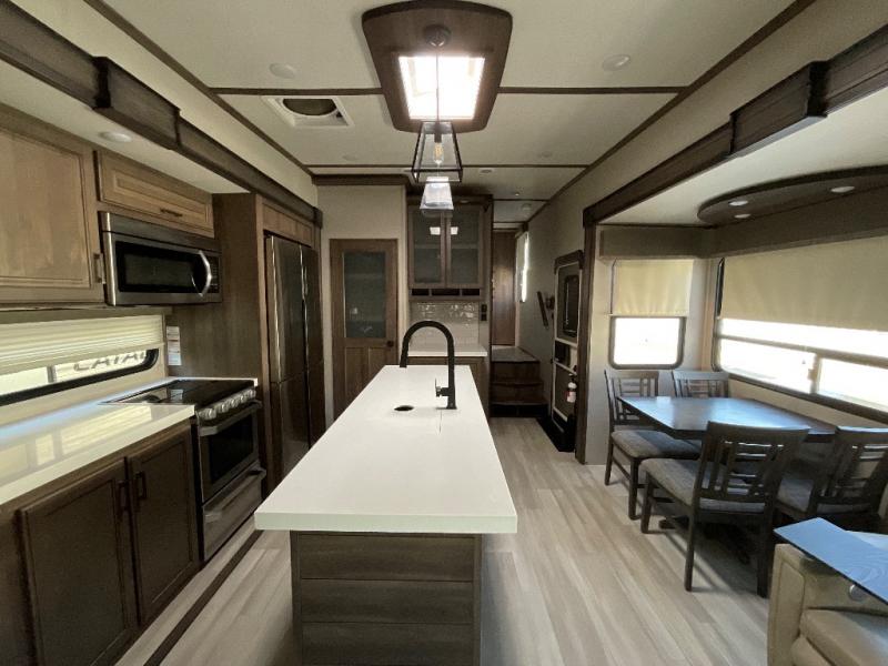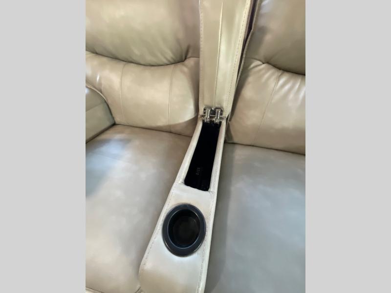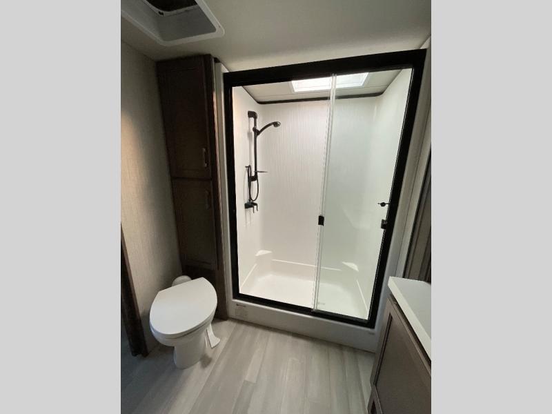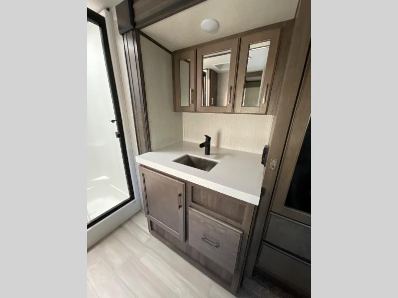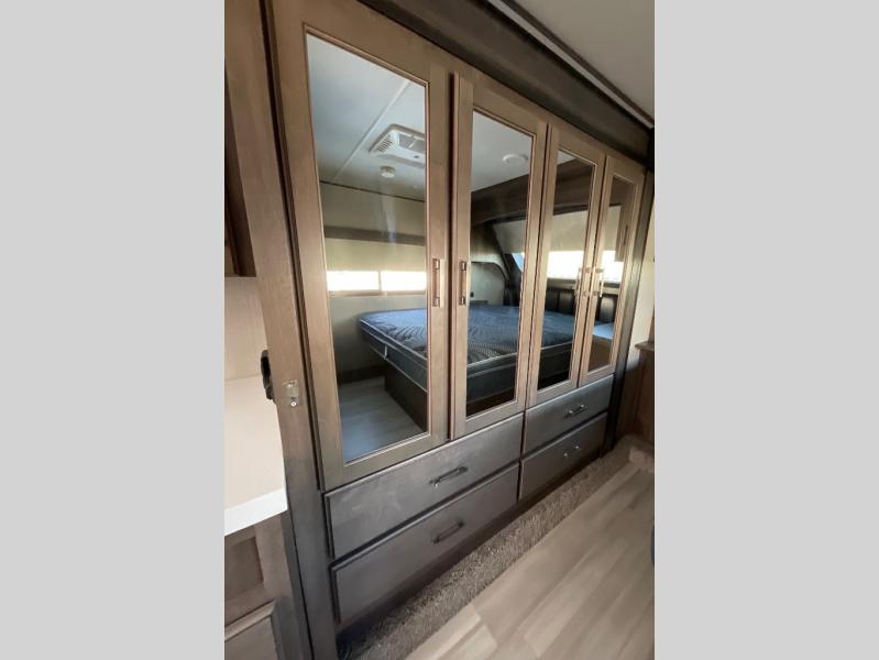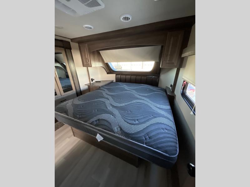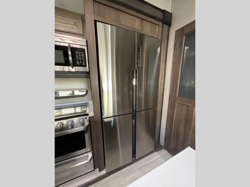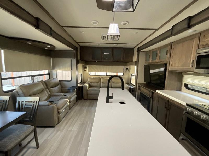 You and your spouse will love living in this fifth wheel with the master suite offering a walk-around queen bed with a king bed option, plus there is a 32" LED TV, and a slide out with a mirrored wardrobe and drawers plus a bathroom sink that stretches into the double-entry bathroom. The main living and kitchen area is spacious as well with two slides opening up the area around the kitchen island giving the cook plenty of space to make meals and you can relax on the theater seats, or the tri-fold sofa which offers sleeping space for guests. You can work or dine from the free-standing dinette while watching the LED Smart TV with fireplace below. And the oversized pantry as well as the hutch offers more storage for the food and picture frames. You might like to add a washer/dryer option if you don't want to use the appliances at the RV park, and there is a solar package option available.