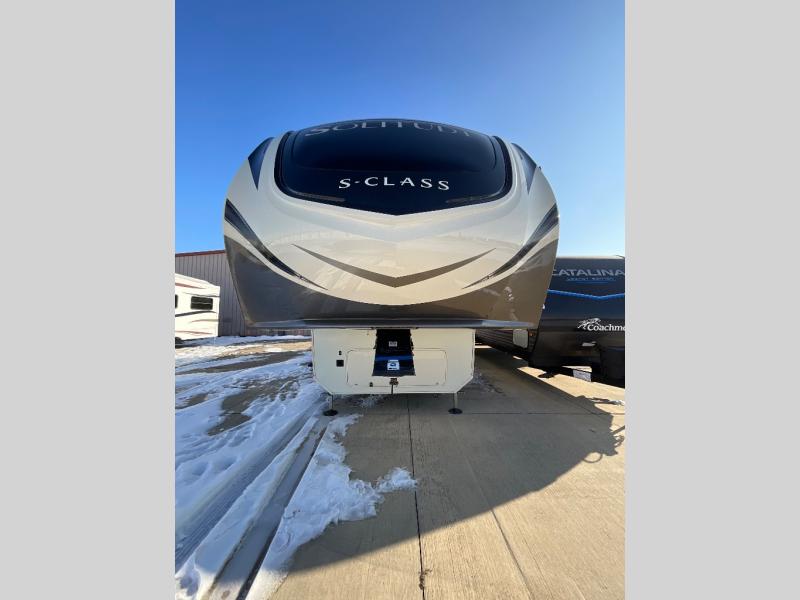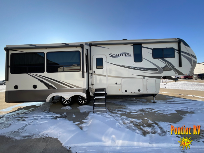 With any Grand Design Solitude S-Class fifth wheel you can enjoy years of full-time RVing or weeklong trips during any season thanks to the Weather-Tek package which provides maximum insulation from the thermal roof design, the fully laminated walls, the triple insulated main floor, and the exclusive Rail-Tite underbelly seal and insulated gooseneck. Each is built on an exclusive superchassis with 101" wide body construction for more livable floor space, and includes a wide rail design with reinforced axle hangers. The interior offers power theater seats with heat and massage for maximum comfort, no carpet in slides/flush floor kitchen slides, solid surface bathroom countertops for style and easy care, plus so much more! Choose your Solitude S-Class and start living the dream!