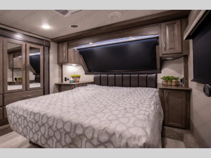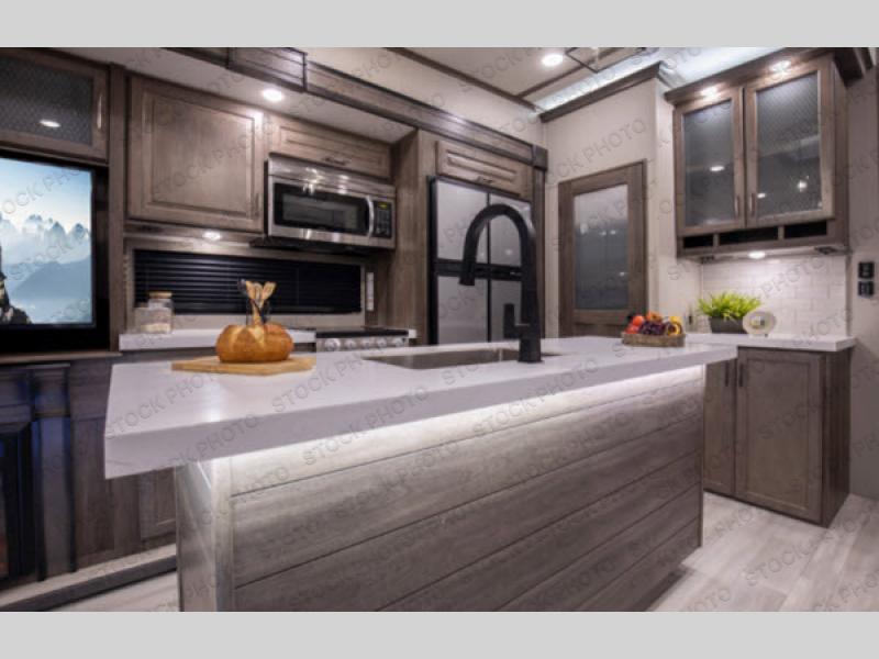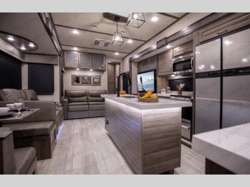With any Grand Design Solitude S-Class fifth wheel you can enjoy years of full-time RVing or weeklong trips during any season thanks to the Weather-Tek package which provides maximum insulation from the thermal roof design, the fully laminated walls, the triple insulated main floor, and the exclusive Rail-Tite underbelly seal and insulated gooseneck. Each is built on an exclusive superchassis with 101" wide body construction for more livable floor space, and includes a wide rail design with reinforced axle hangers. The interior offers power theater seats with heat and massage for maximum comfort, no carpet in slides/flush floor kitchen slides, solid surface bathroom countertops for style and easy care, plus so much more! Choose your Solitude S-Class and start living the dream!