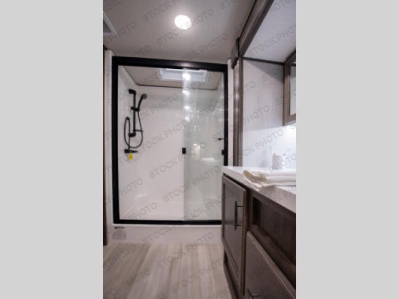The whole family will enjoy living in this fifth wheel from the spacious main living and kitchen area with two slide outs, and the double-size bunk beds in the rear private bunkhouse to the front master suite with double-entry to the full bathroom. The kids will be able to slide the door closed for privacy and there is a wardrobe to hang their clothes and storage under the bunks. The parents will have plenty of storage solutions from under the queen bed and on the sides of the bed to the slide out wardrobe with mirrors and drawers plus a sink which stretches into the bathroom. You can gather in the main area with a tri-fold sofa, theater seating and a free-standing dinette as well find the kitchen appliances, the LED Smart TV with fireplace below plus more! When you want to be outdoors, the two power awnings offer protection from the elements, and the beverage cooler and grill give you more choices when cooking.