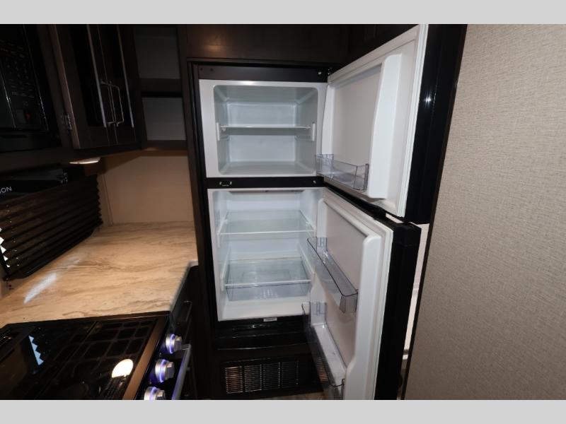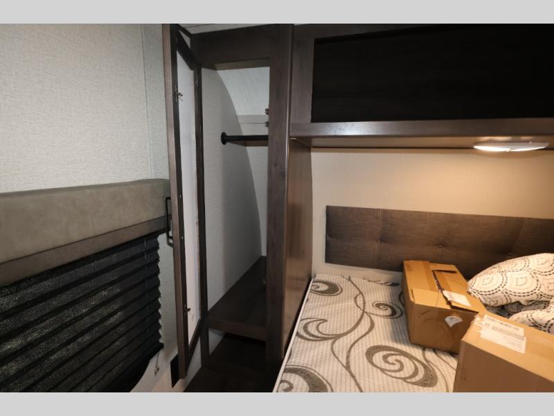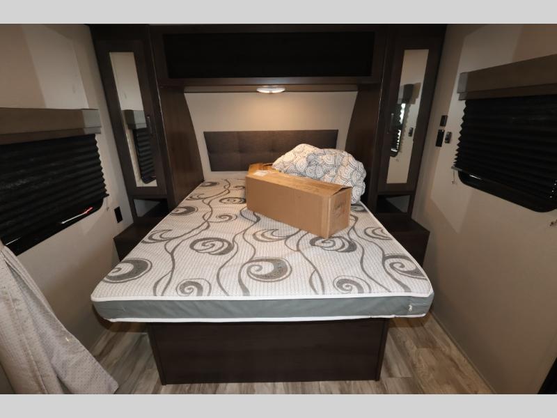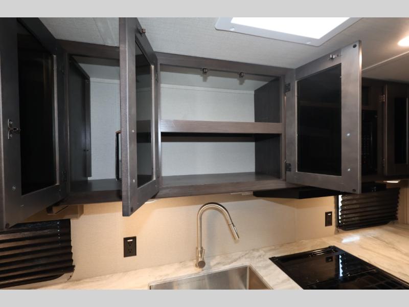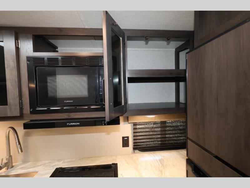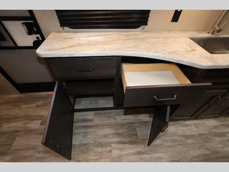 You won't want to camp any other way after seeing this Transcend Xplor travel trailer! It features a front queen bed with tapered overhead cabinets, wardrobes on either side of it, and a privacy curtain to get dressed for the day in privacy. Once you're ready, you can head into the kitchen and fry up some delicious bacon on the three-burner cooktop, and you can even fill up your pet's dish bowl conveniently located in the pet drawer below the double-door refrigerator. The U-shaped dinette slide welcomes you to comfortably enjoy your breakfast, but you can also switch it out for the optional theatre seats instead. Inside the rear corner bathroom, you will find everything you need to get squeaky clean after a fun day outdoors, like the walk-in shower, the linen closet, and the vanity sink!