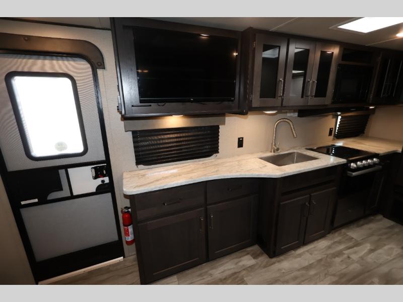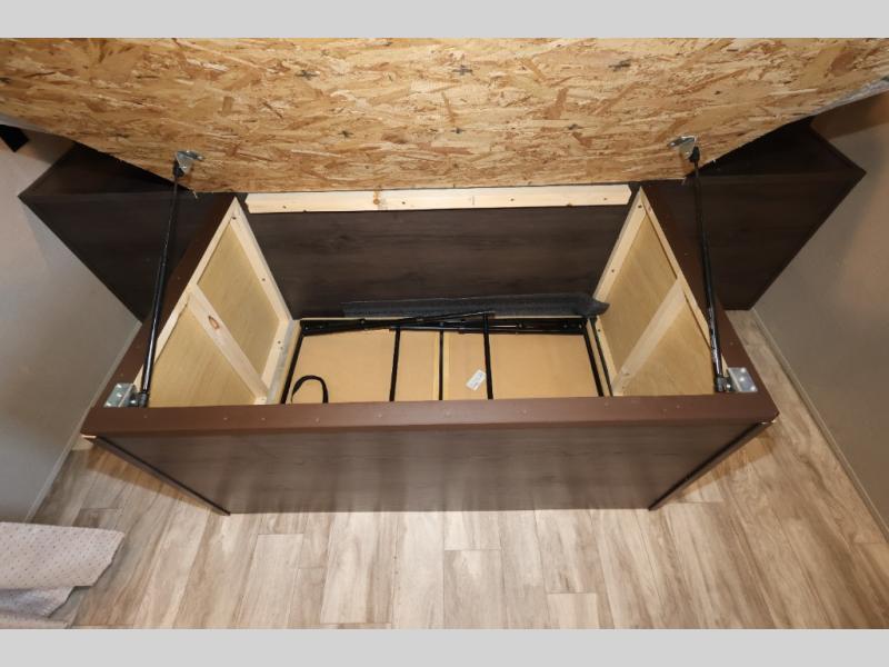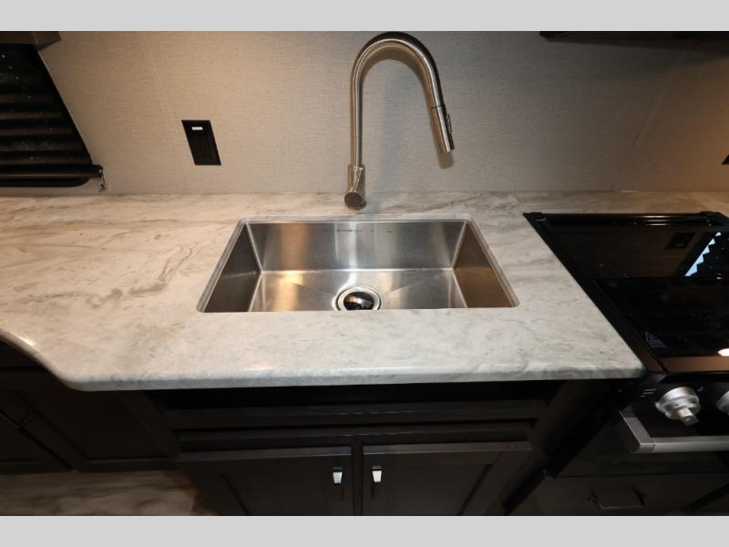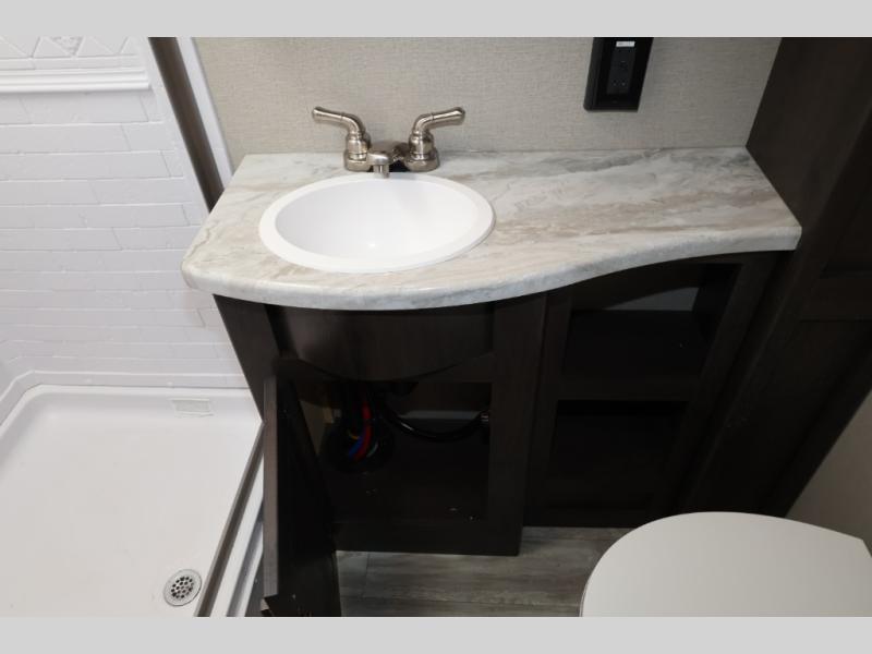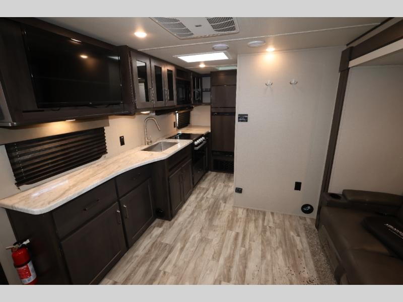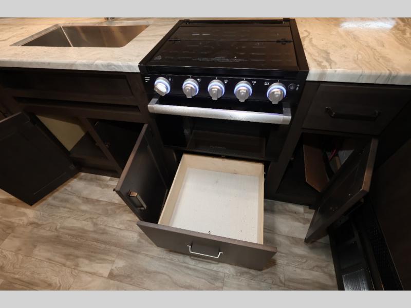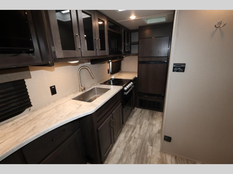 You won't want to camp any other way after seeing this Transcend Xplor travel trailer! It features a front queen bed with tapered overhead cabinets, wardrobes on either side of it, and a privacy curtain to get dressed for the day in privacy. Once you're ready, you can head into the kitchen and fry up some delicious bacon on the three-burner cooktop, and you can even fill up your pet's dish bowl conveniently located in the pet drawer below the double-door refrigerator. The U-shaped dinette slide welcomes you to comfortably enjoy your breakfast, but you can also switch it out for the optional theatre seats instead. Inside the rear corner bathroom, you will find everything you need to get squeaky clean after a fun day outdoors, like the walk-in shower, the linen closet, and the vanity sink!