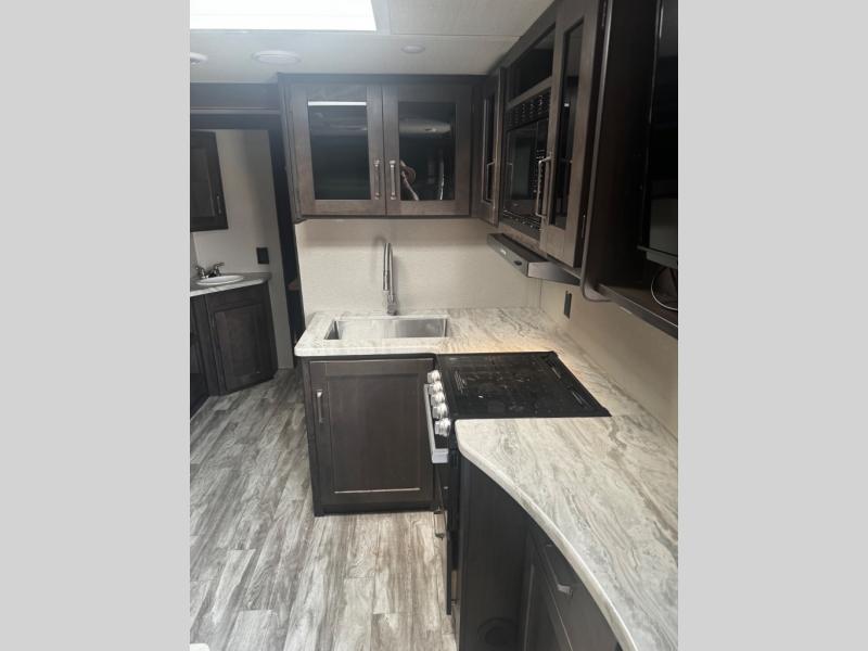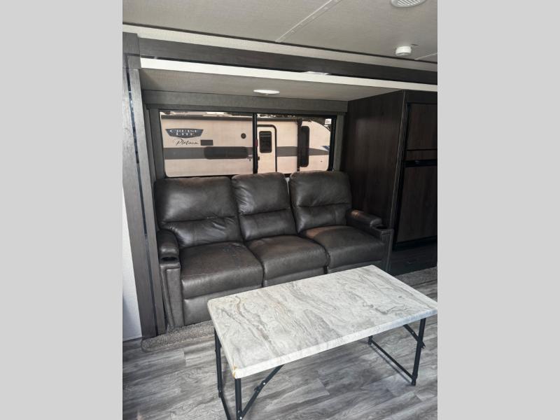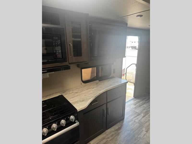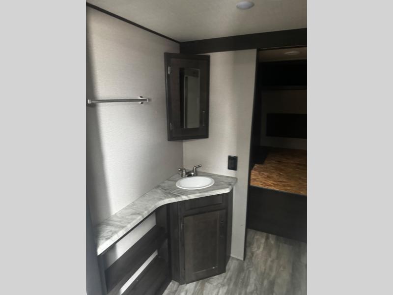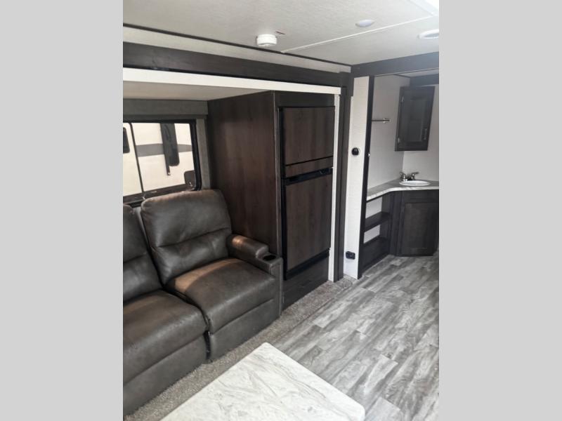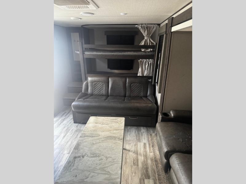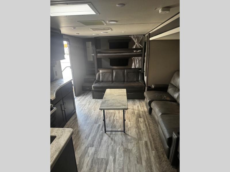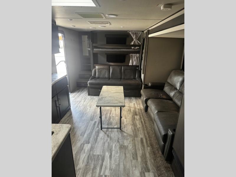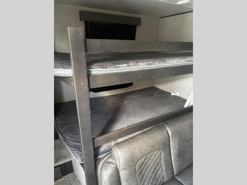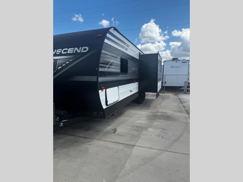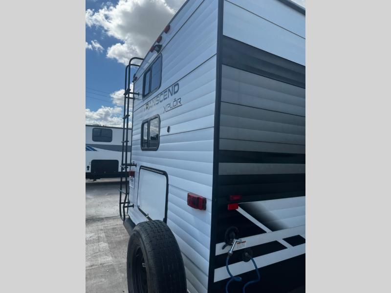 You can advance beyond the typical and mundane travels by using this Transcend Xplor travel trailer to create new and exciting adventures! You won't ever have to worry about where everyone is going to sleep because the double-size bunks, jackknife sofa, U-shaped dinette, and queen-size bed provide loads of sleeping space. There is also great accessibility with the two entry doors, and the walk-through bath also has two points of entry with doors on either side. The entertainment center is directly across from the U-shaped dinette, and you can even change out the dinette for the optional theater seats for added comfort while you watch a movie. This model also includes a 42" x 22" rear storage that will allow you to bring along even more comforts from home!