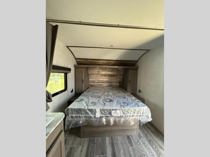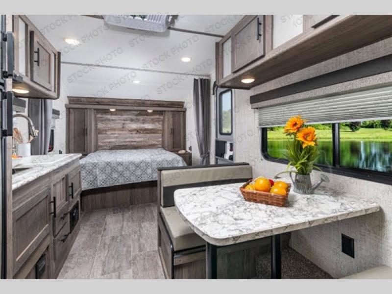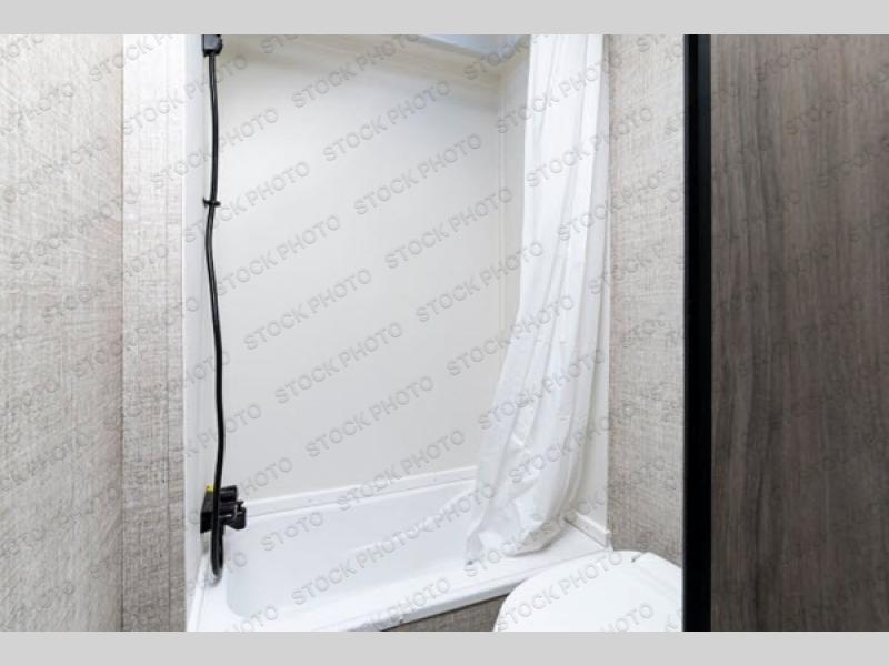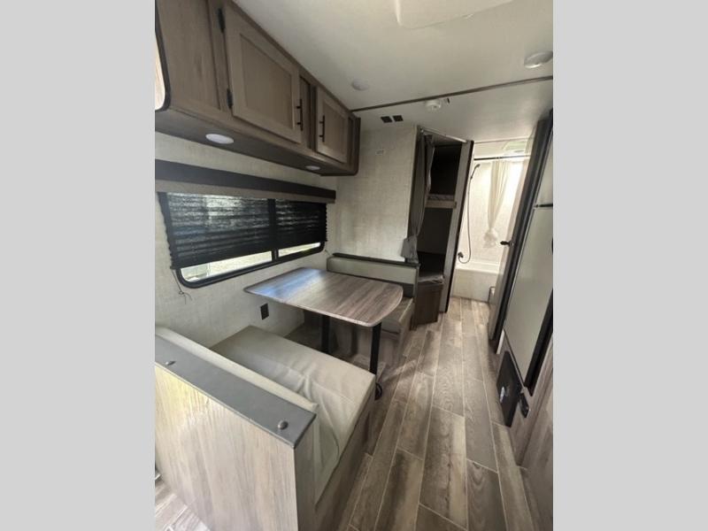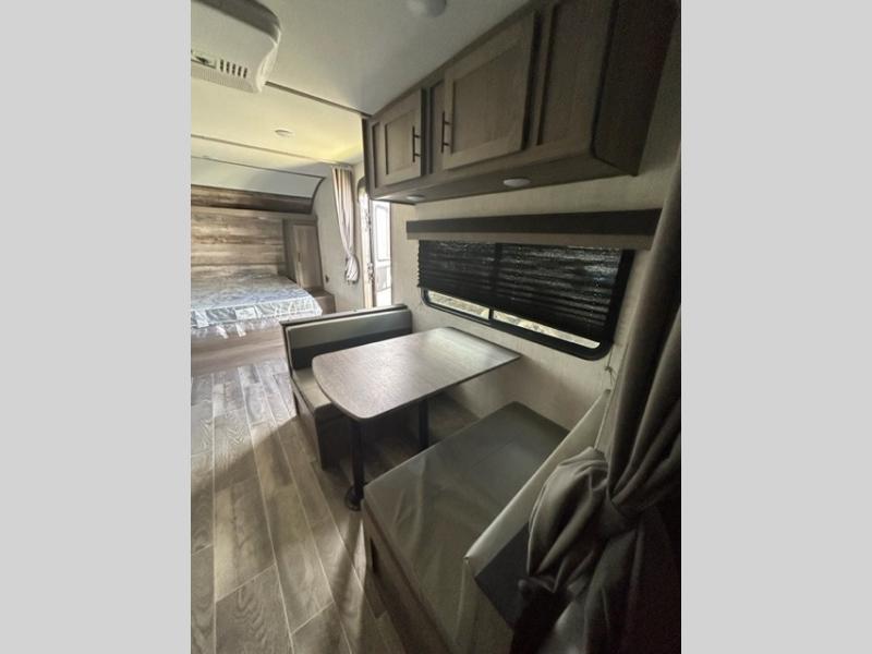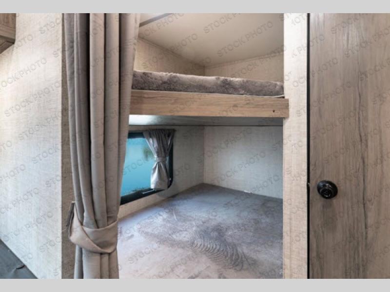 Invite more along with double-size bunks in this travel trailer! The private shower and toilet is close to the bunks if you're camping with little ones, and there is a sink just outside the door so two people can freshen up at once. You and your spouse will get comfortable on the front queen bed, or you can choose the optional Murphy bed to enjoy more seating space during the day. This model includes a booth dinette to dine at each day, or you can sit outside under the electric awning!