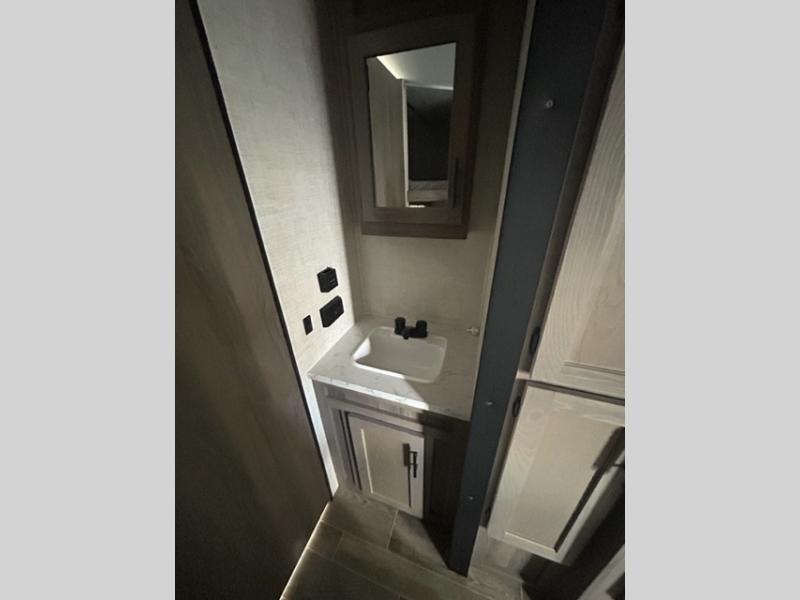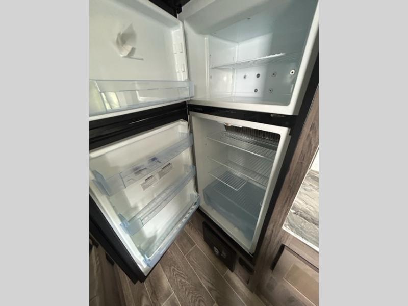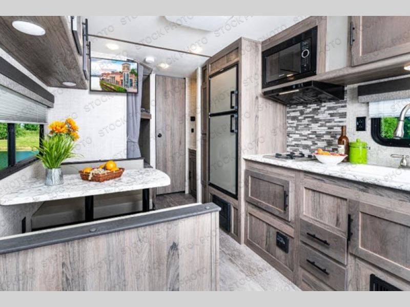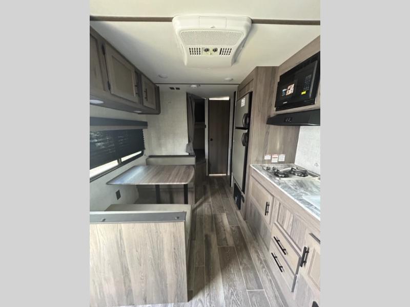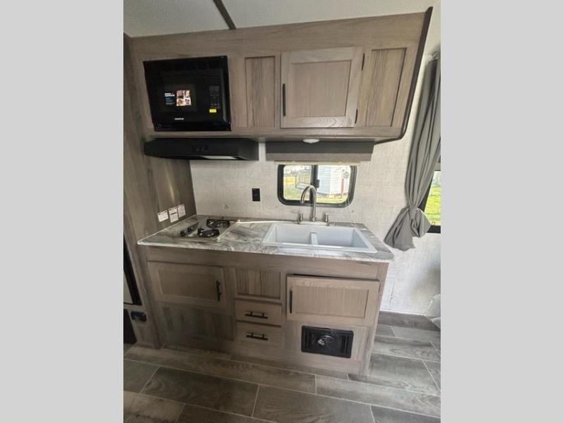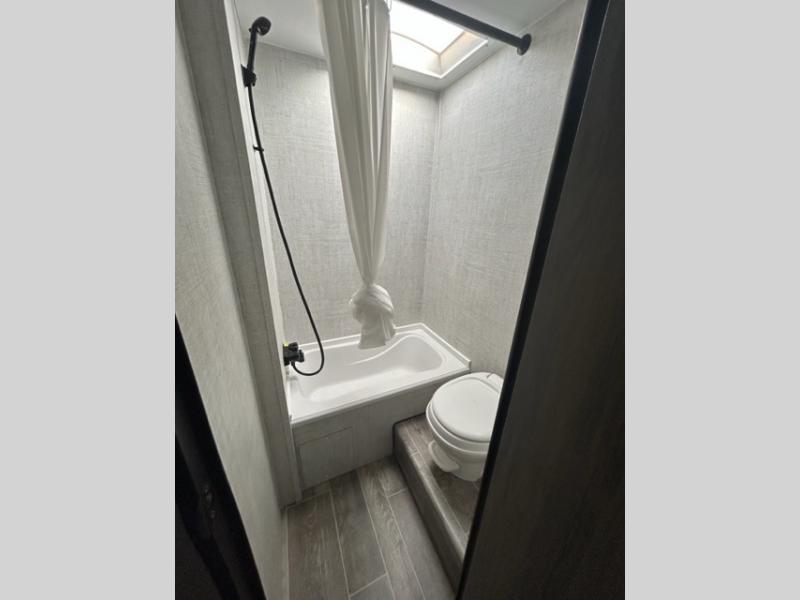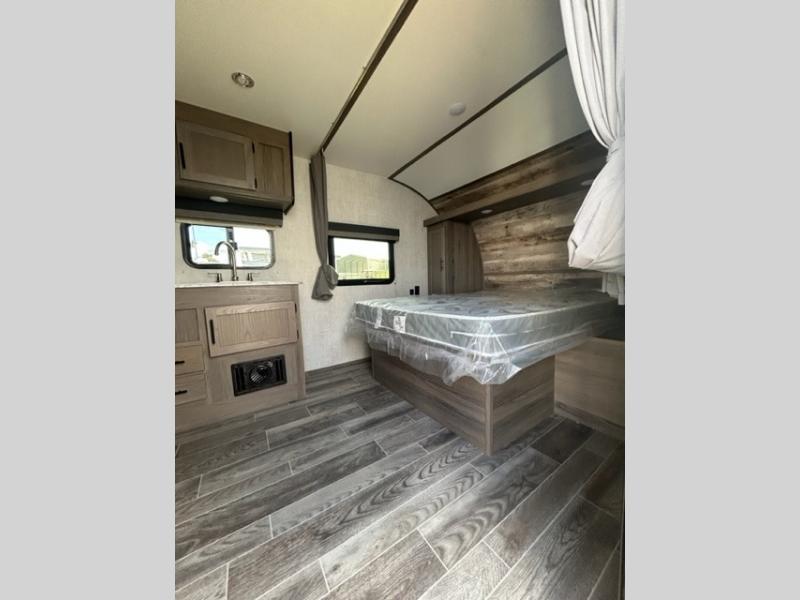 Invite more along with double-size bunks in this travel trailer! The private shower and toilet is close to the bunks if you're camping with little ones, and there is a sink just outside the door so two people can freshen up at once. You and your spouse will get comfortable on the front queen bed, or you can choose the optional Murphy bed to enjoy more seating space during the day. This model includes a booth dinette to dine at each day, or you can sit outside under the electric awning!