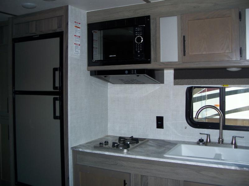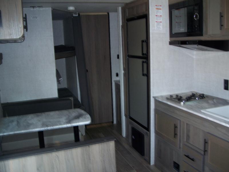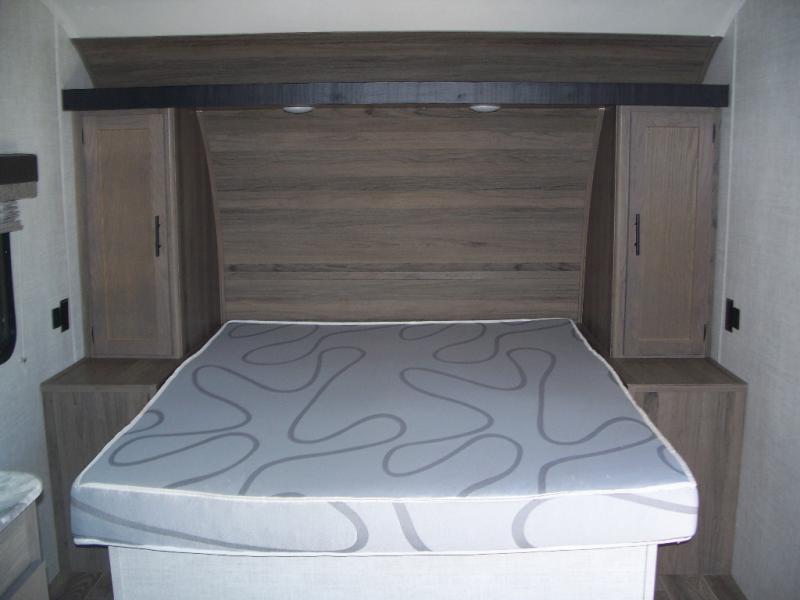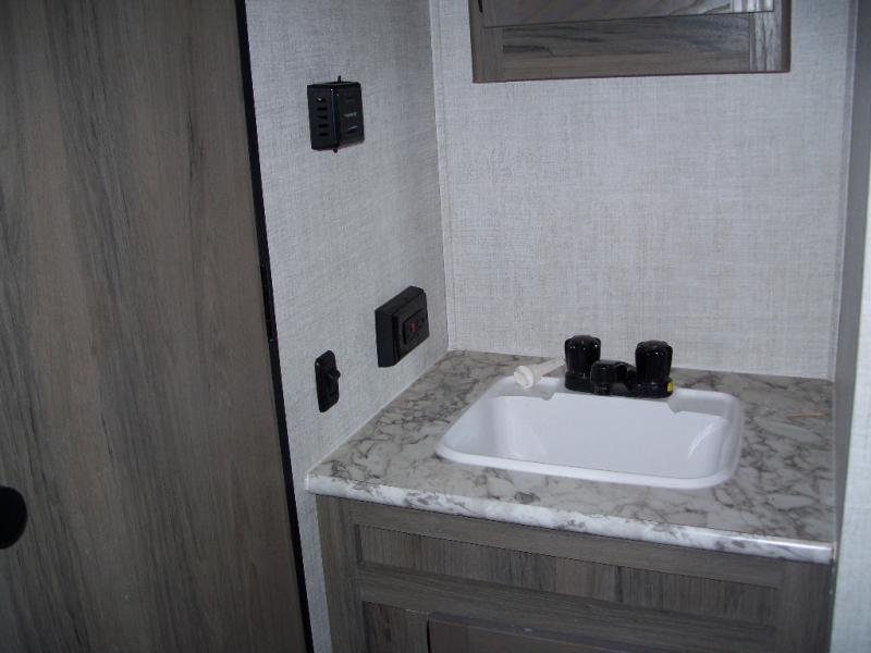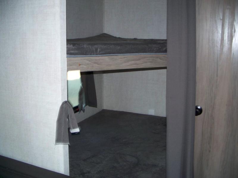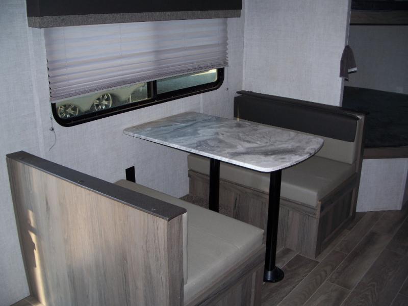 Invite more along with double-size bunks in this travel trailer! The private shower and toilet is close to the bunks if you're camping with little ones, and there is a sink just outside the door so two people can freshen up at once. You and your spouse will get comfortable on the front queen bed, or you can choose the optional Murphy bed to enjoy more seating space during the day. This model includes a booth dinette to dine at each day, or you can sit outside under the electric awning!