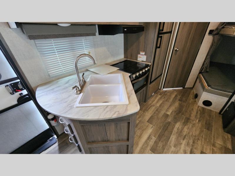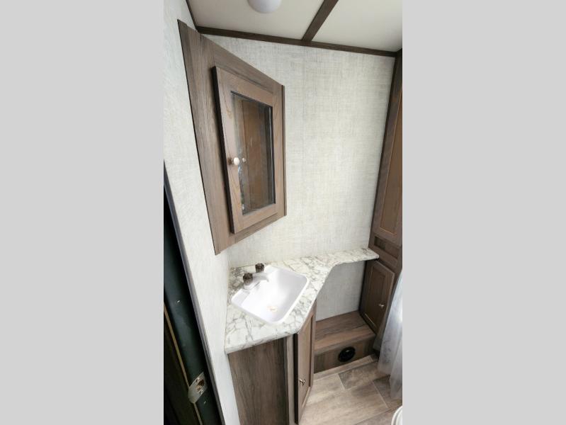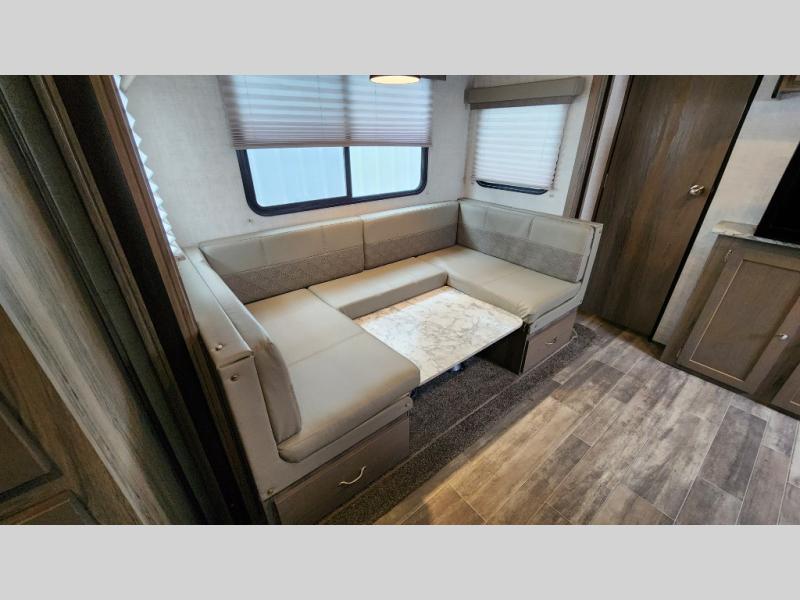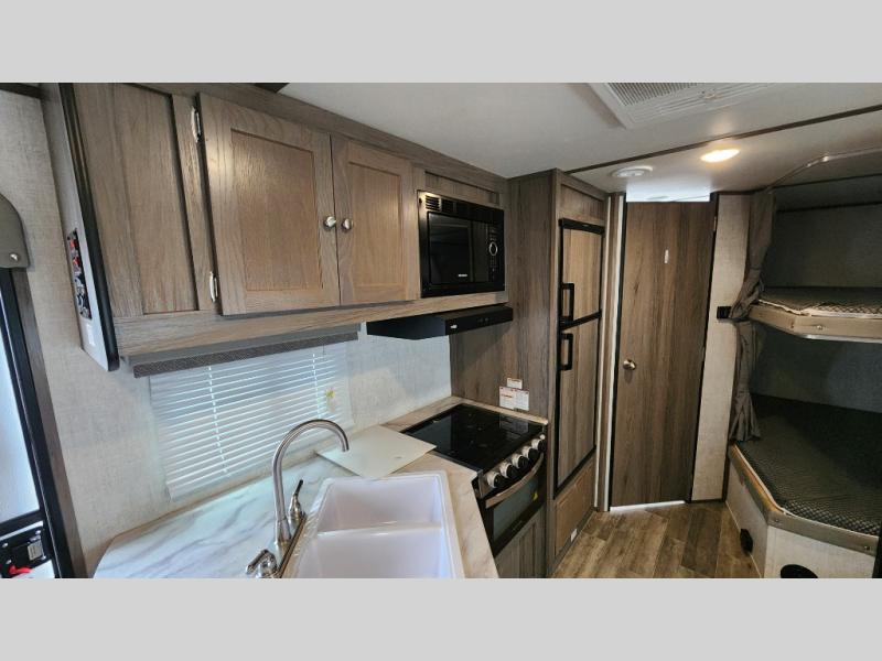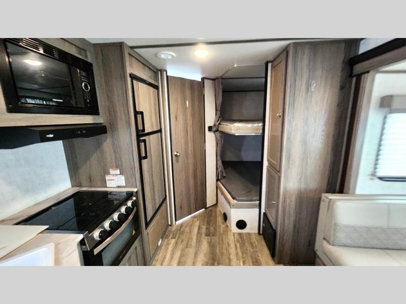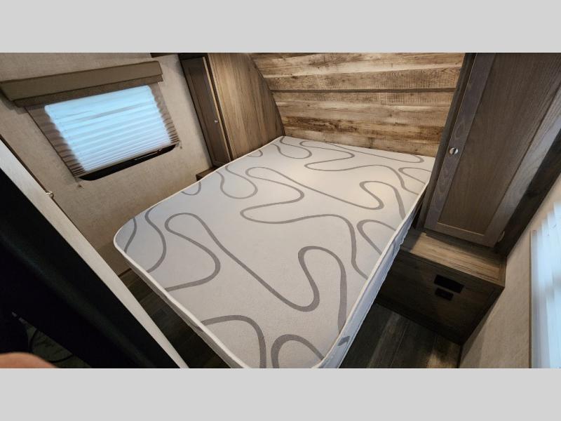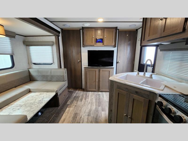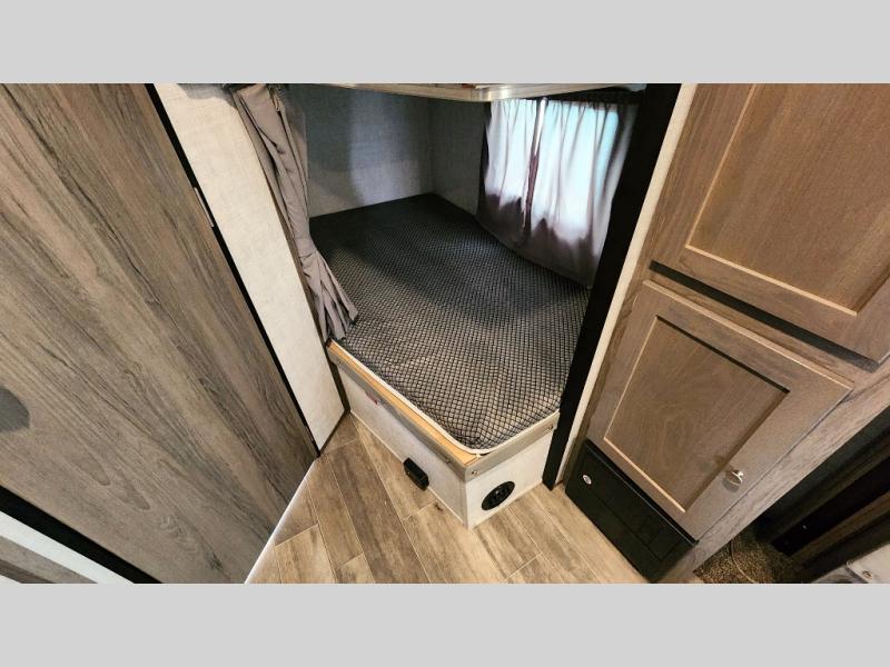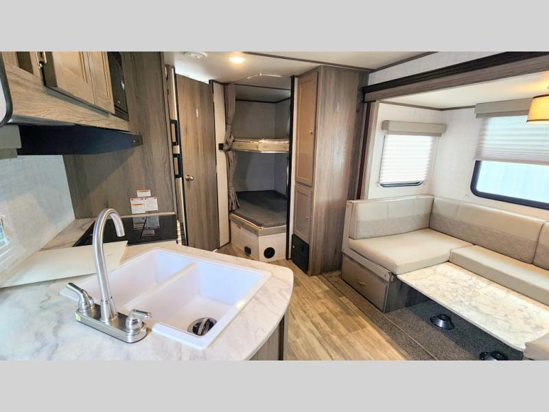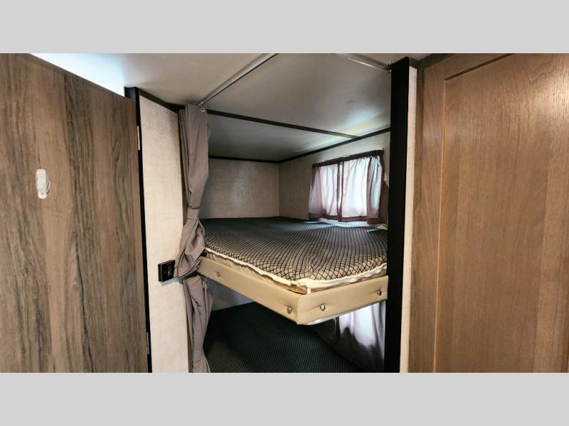 Everyone is going to love camping in this GEO Limited Edition travel trailer! The kids will have their own place to sleep at night with the rear corner bunk beds, and you will also enjoy how close they are to the rear corner bathroom. The U-shaped dinette is not only great for eating your meals and playing games, but it can also transform into an extra sleeping space when needed. After a fun-filled day, you can head to the front private bedroom and enjoy a good night's rest on the queen-size bed with shirt closets on either side to keep your hang-up clothes neat and tidy.