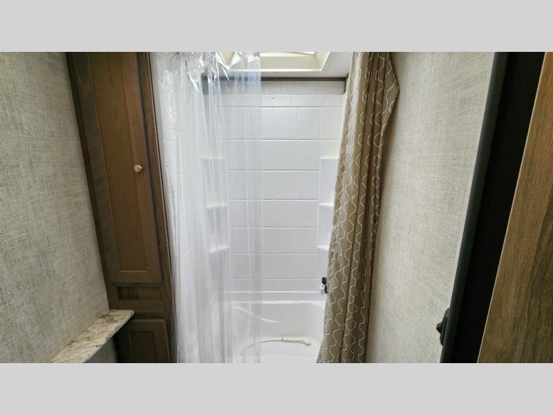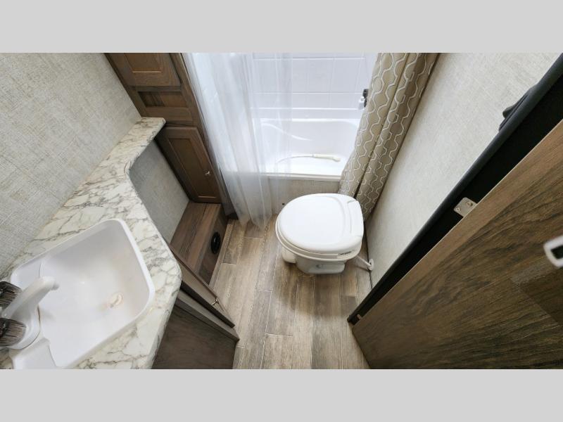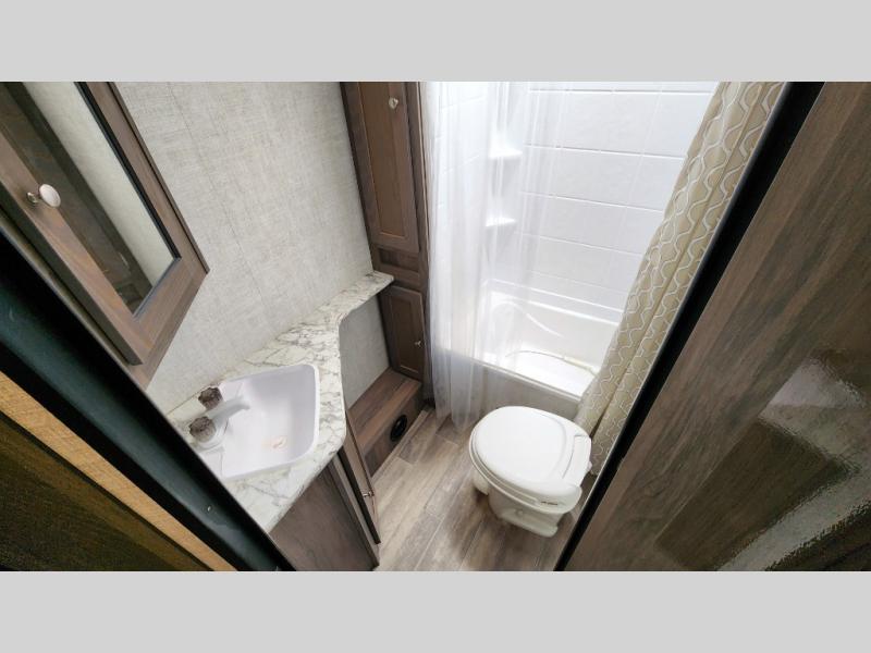 You can enjoy a relaxing weekend by the lake or an adventurous excursion out on the trails after you hitch up the Gulf Stream GEO Limited Edition travel trailer and head out to the destination of your choice! Plenty of your neighbors will be jealous of the lightweight and durable construction that you have sitting in your driveway, and if you let them check out the interior, they'll be impressed by the high-performance vinyl flooring, vintage wash ceiling panels, wood cabinet doors, Cipilino Bianco laminated countertops, designer window treatments, and mini blinds. The bathroom has a skylight to increase the amount of natural lighting on the interior, and the Bluetooth home theater stereo with speakers will provide musical entertainment.
