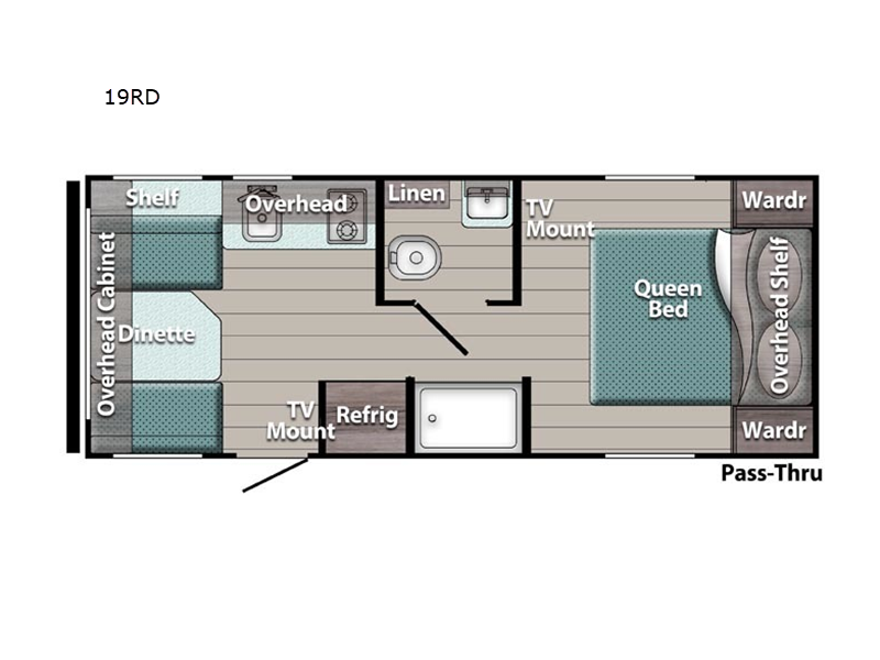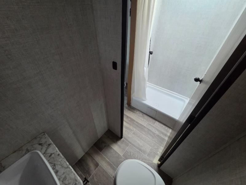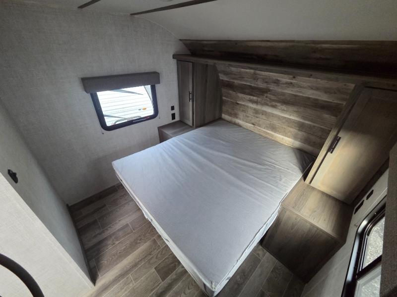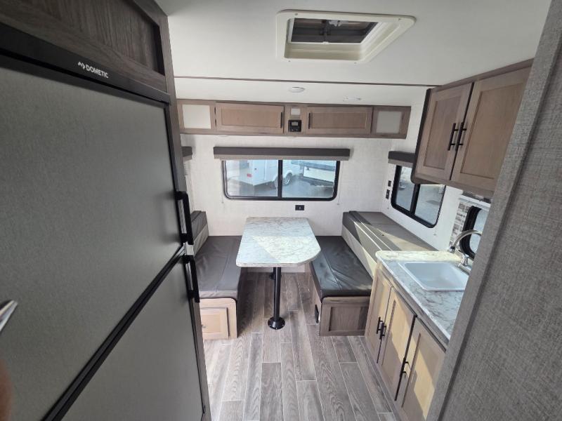 This travel trailer will feel more like home thanks to its front bedroom with a queen bed and dual wardrobes for your clothes. There is a private toilet and sink, with the shower just across the hall so two people can freshen up at once, and the rear booth dinette will provide a place to dine and sleep. The 6 cu. ft. double door refrigerator will keep your perishables fresh all week, and you can prepare meals on the two burner cooktop or in the microwave oven.
