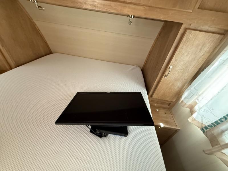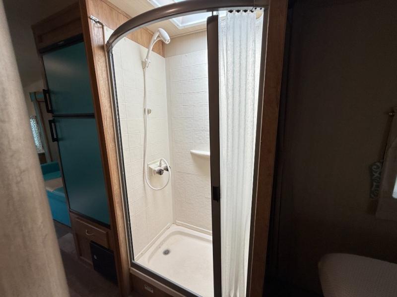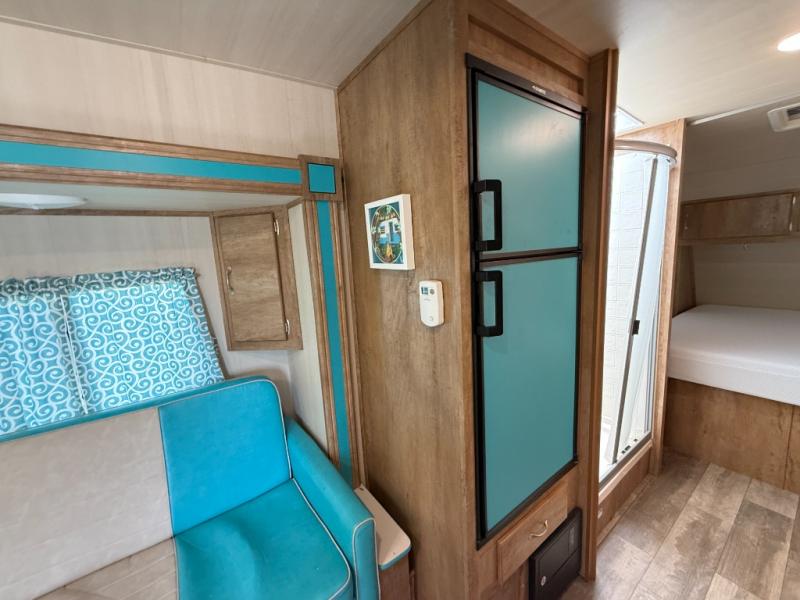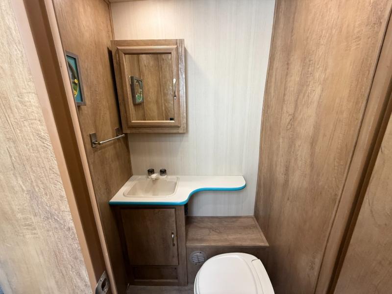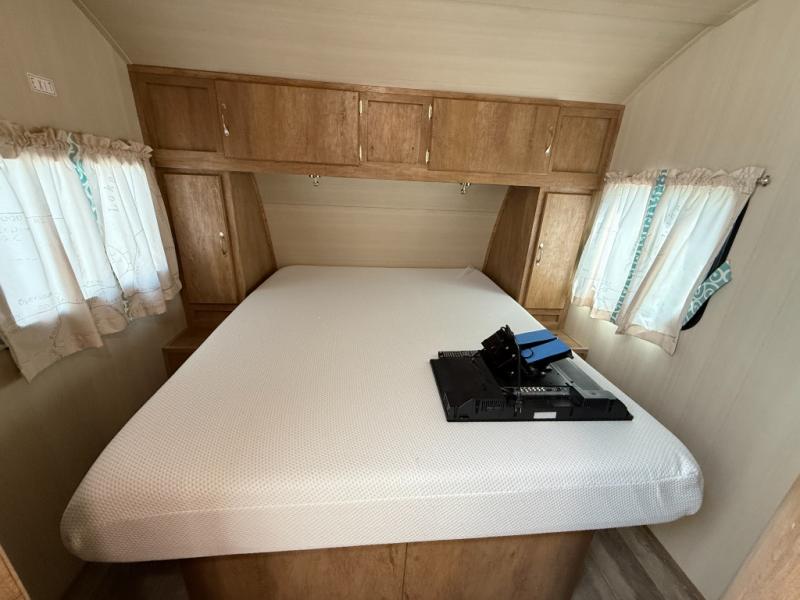Now you can enjoy the camping lifestyle with at-home comforts in this comfortable travel trailer. The sofa bed slide out will provide the dog space to stretch out on the floor, and the chef can prepare meals on the two burner cooktop with ease. Dine together at the booth dinette or take your plate to sit under the electric awning outside. Since this model includes a private toilet and sink with the shower just across the hall, two people can freshen up at once. You and your spouse will feel right at home in the front bedroom with its RV queen bed and dual shirt closets for your clothes!