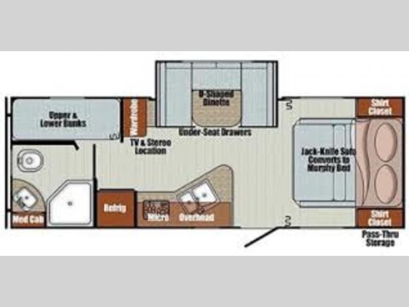Pack your bags, load the kids, and hitch up this travel trailer! The kids will enjoy a good night's rest on the rear corner bunk beds with privacy curtain, and you will enjoy the front jackknife sofa that converts into a Murphy bed. The U-shaped dinette slide can also transform into an extra sleeping space and it has under-seat drawers to store your games. The wardrobe by the bunks has a TV and stereo location for your entertainment, and the rear corner bathroom has a neo-angled shower for everyone to stay clean and fresh!