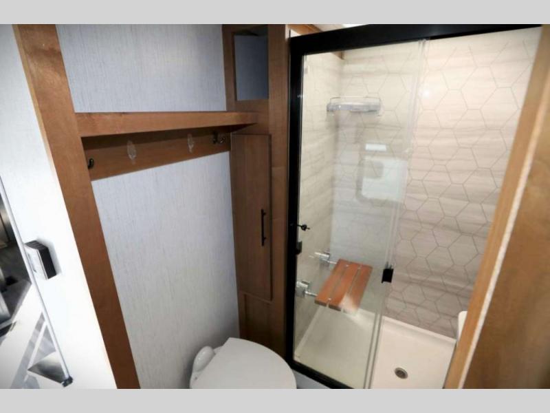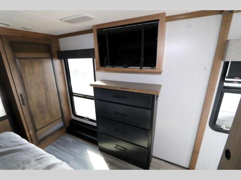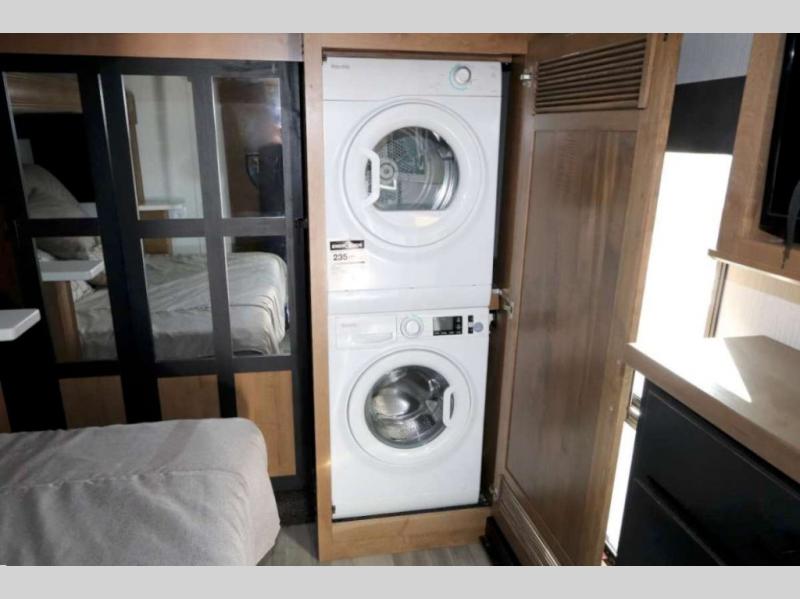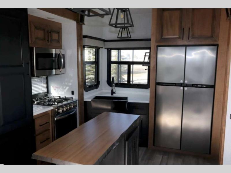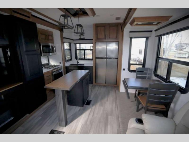 You won't want to camp any other way once you step inside this luxurious fifth wheel! The rear kitchen layout allows you to move around more freely as you prepare your delicious home cooked meals with the three burner cooktop, the over-the-range microwave, and the kitchen island which not only offers extra counter space, but also has two bar stools for others to help as well. The power theater seating is conveniently across from the entertainment center with a recessed fireplace and a 55" LED TV with a built-in DVD player, radio, and Bluetooth capability. The front private bedroom welcomes you to a good night's rest on the standard king size bed, and the built-in closet system features hanging clothes rods and recessed shelving, plus there is a closet prepped to add the optional washer and dryer so your clothes can look their best throughout your entire trip!