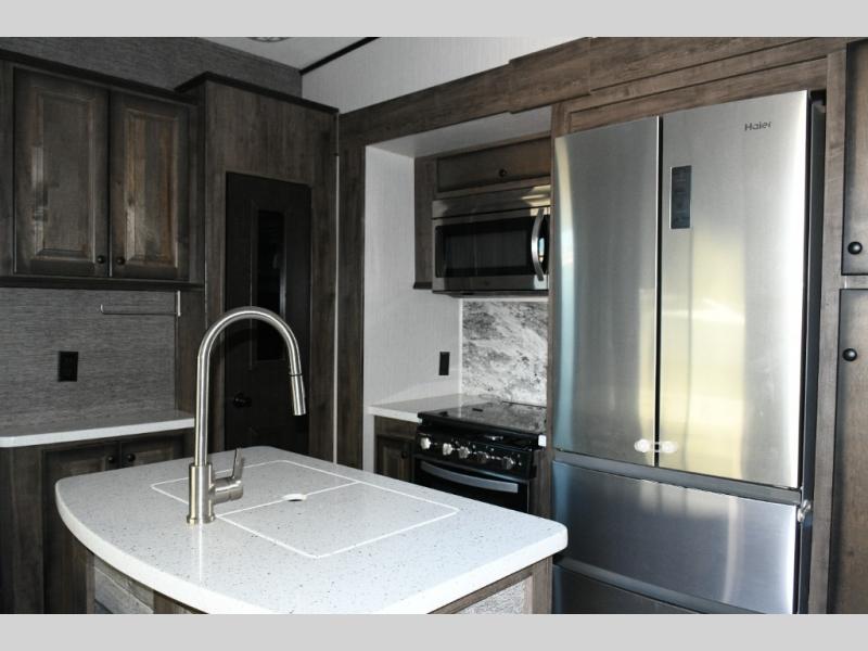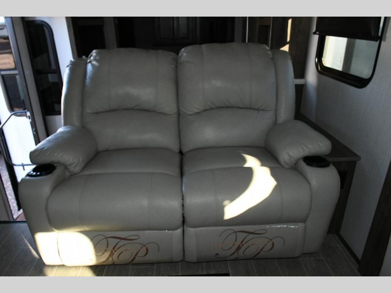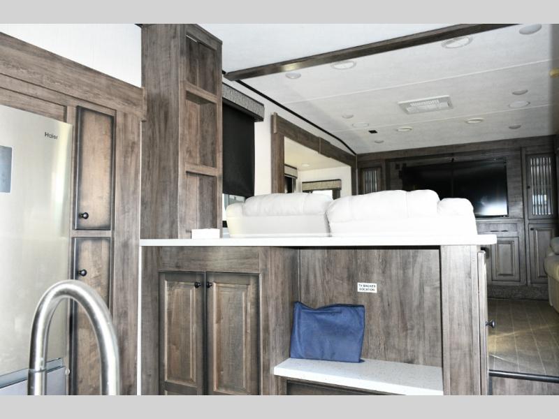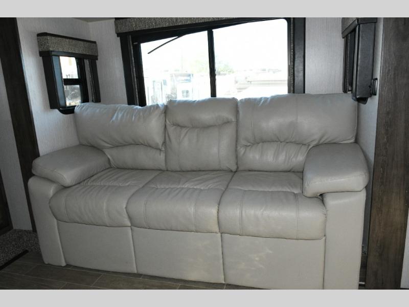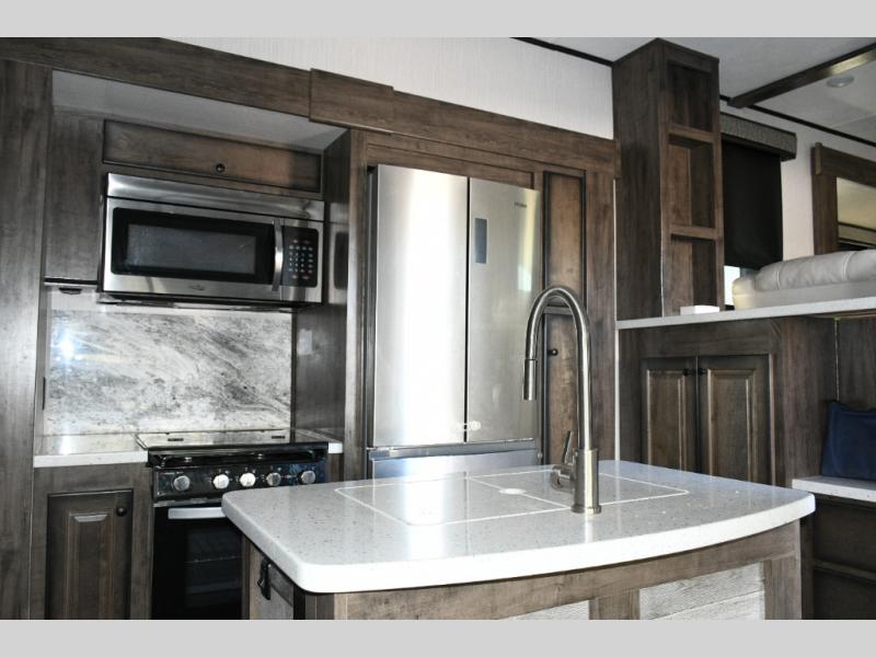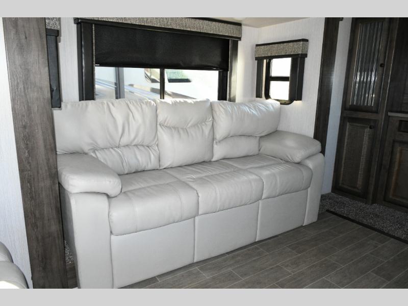 With dual opposing slides in every main area, the 38FL offers unmatched interior space—ideal for long-term travelers or those who want to bring the whole family. Every detail, from the glazed hardwood cabinetry to the residential décor, creates an inviting atmosphere that feels more like home than an RV.