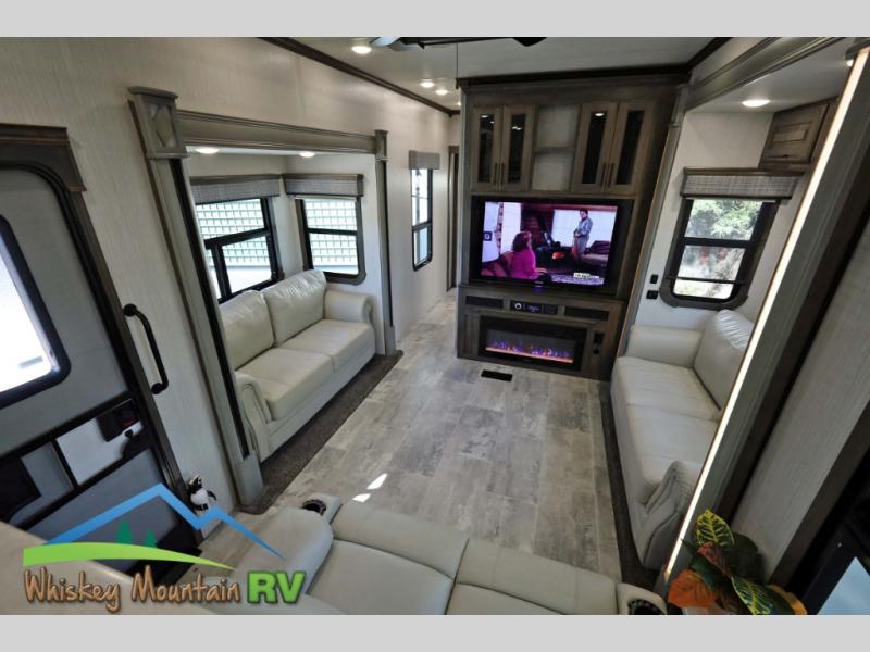 You will be amazed at all this fifth wheel has to offer! From the front raised kitchen with lots of counter space, the large, deep pantry, and breakfast bar counter with two bar stools overlooking the living and dining area to the spacious rear bedroom. The living area has a flip and fold sleeper sofa for you to take an afternoon nap on or relax at the power theater seating while others play card games at the standard dinette slide which can be switched out for the optional sofa. After a fun-filled day outdoors, head to the full bathroom and take a nice, hot shower in the shower with a teak seat. The rear private bedroom welcomes you to a good night's rest on the king bed slide, and if you choose to add the optional washer and dryer then you can have clean clothes throughout your entire trip!