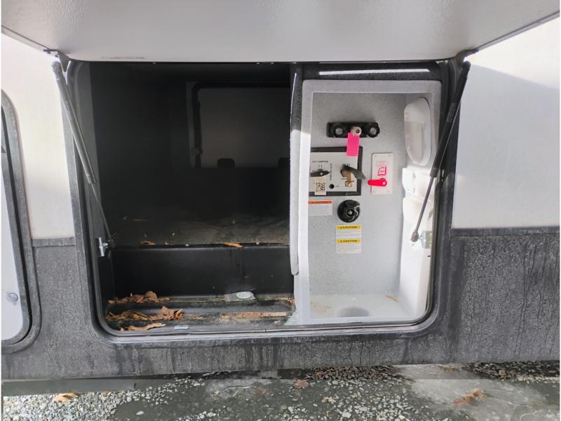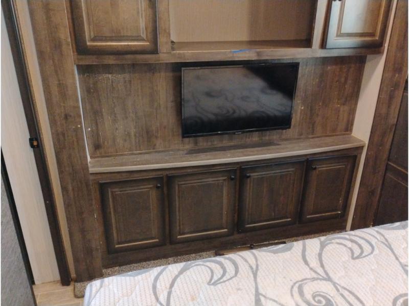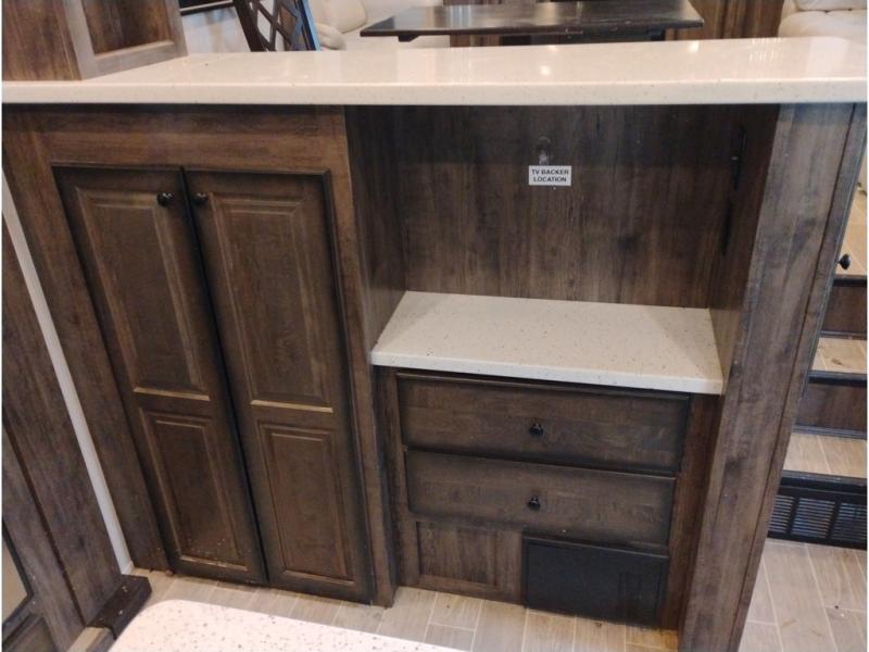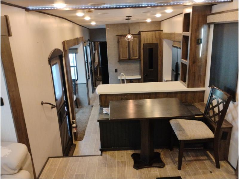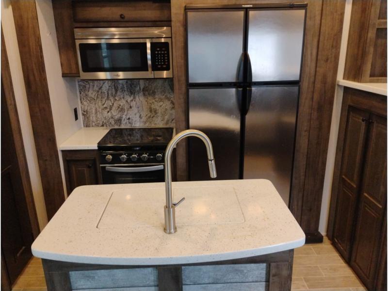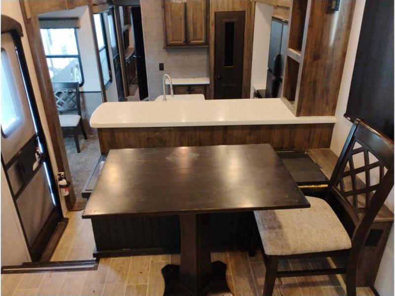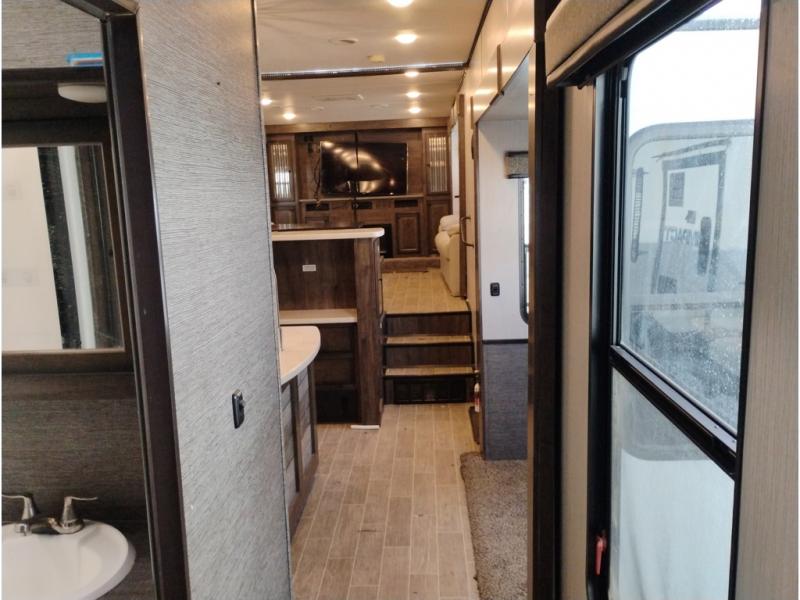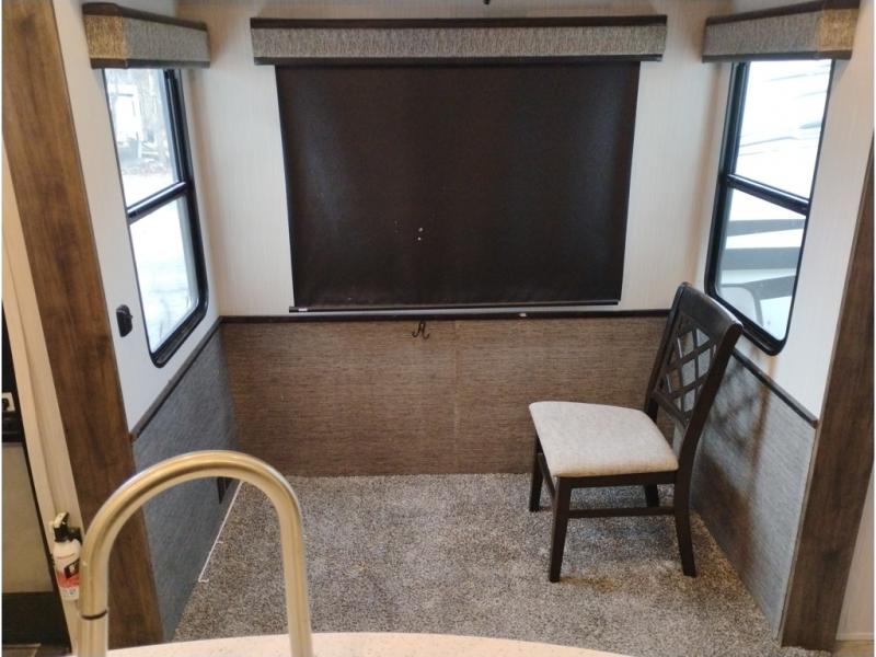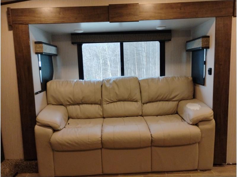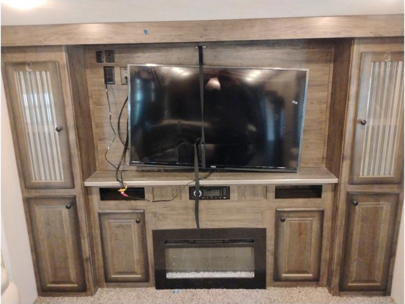 Why not be comfortable wherever you decide to live! This fifth wheel offers opposing sofas and power theater seating in the separate front living area which also includes an entertainment center and fireplace. The middle kitchen area is equipped with everything you will need to create home-cooked meals including a residential refrigerator, a kitchen island, extra counter space and a free-standing dinette to dine at. The cook will also love having the choice of cooking on the outside kitchen while everyone relaxes under the power awning. The full bathroom is near the second exterior entry as an added convenience, and it includes a cabinet prepped to add the optional washer and dryer. And you can fall quickly to sleep in the rear bedroom on your own king bed slide out.