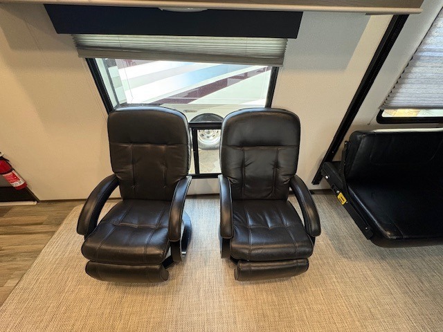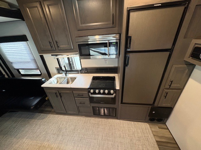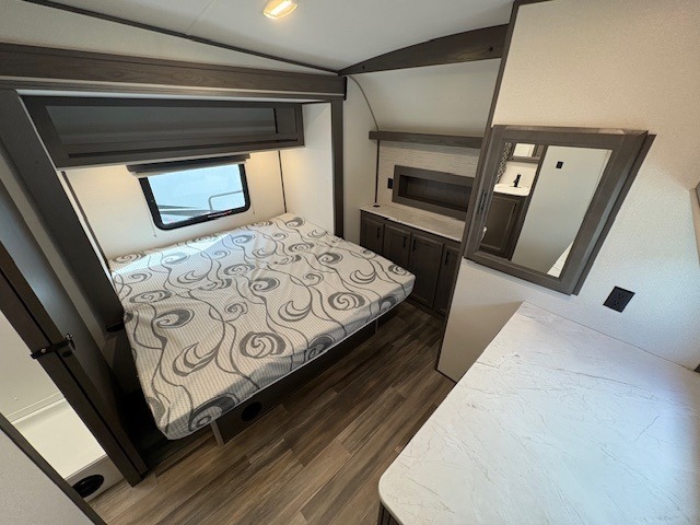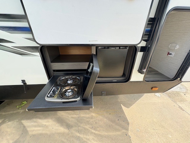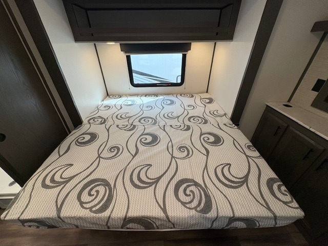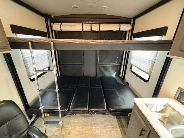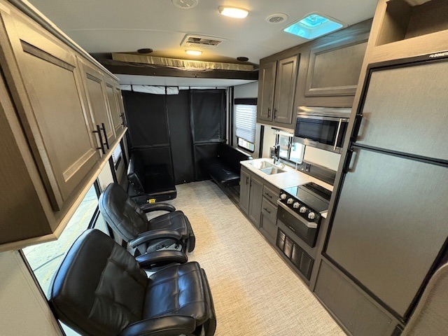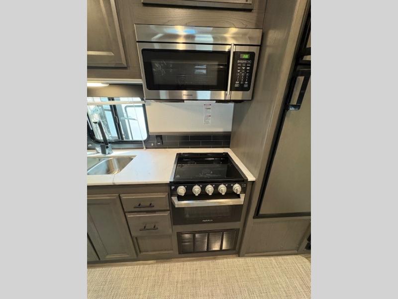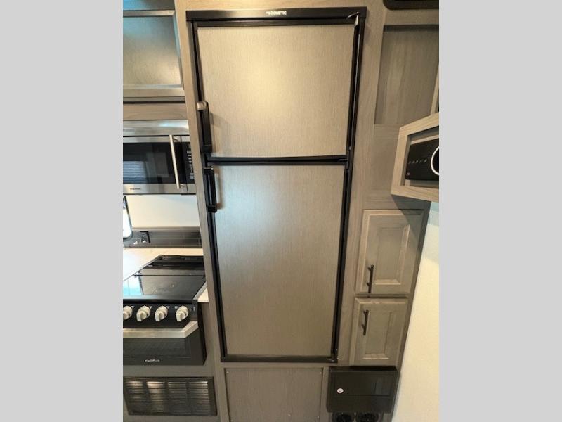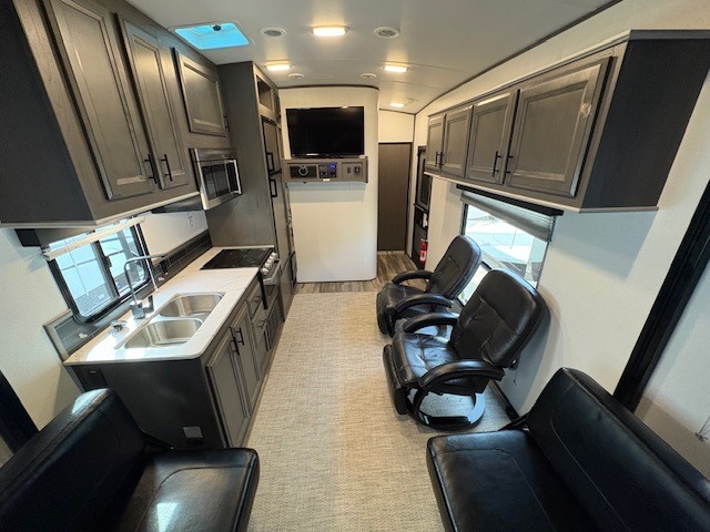 This Fuel toy hauler is big enough for extra guests to join! You will feel right at home in the front private bedroom with a king bed slide that has wireless phone charging ports on the nightstands, two dressers, and a wardrobe to keep your clothes looking nice, plus an entrance into the dual entry bathroom. You can prepare a delicious home cooked meal on the three burner cooktop, store any leftovers in the 8 cu. ft. stainless steel refrigerator, and easily clean up with the double stainless steel sink that has a residential style faucet. The two recliner chairs welcome you to a relaxing evening by the entertainment center, and the queen bed lift is above a dual hinge couch for your convenience!