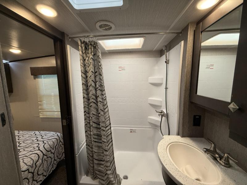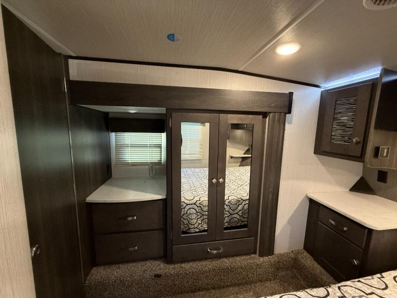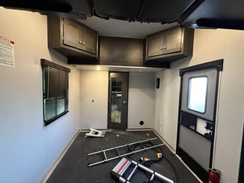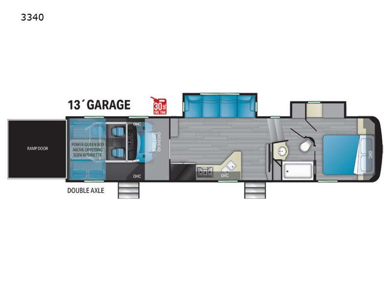 Hit the off-road trails of your dreams after unloading your ATV down the rear ramp door and out of the 13' garage. This area converts to an extra living and sleeping space for the kids, your buddies or extra family members. The main living and kitchen are quiet spacious with the slide out sofa allowing you more floor space to make meals in the kitchen area. You can get then get cleaned up in the double entry bathroom to retire to your own master bedroom with the second slide out offering more storage, a queen size mattress that could accommodate an Olympic Queen mattress. Plus, the double entry doors makes for a smooth flow of traffic in and out of this unit!