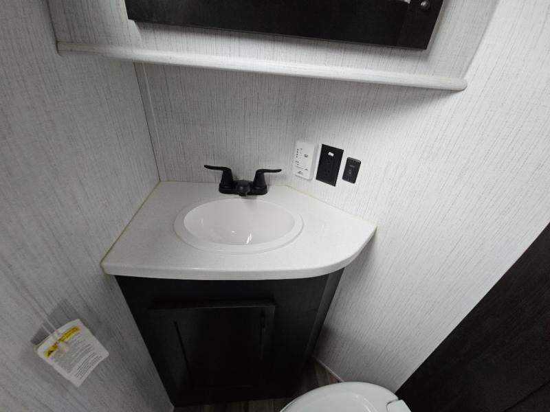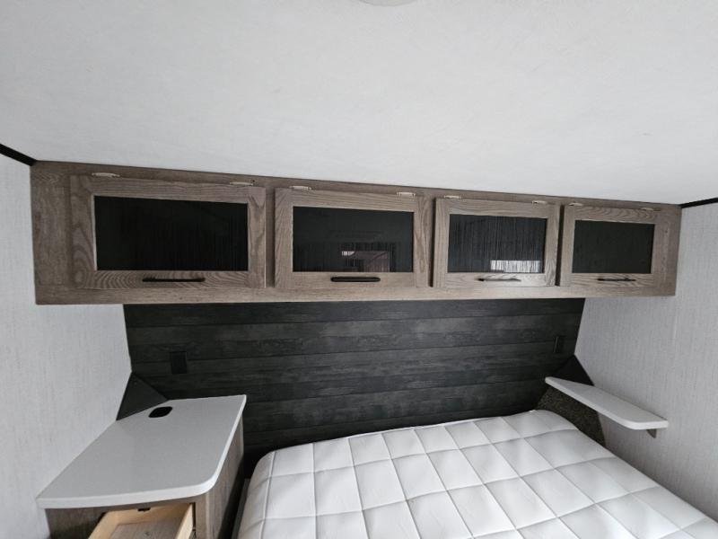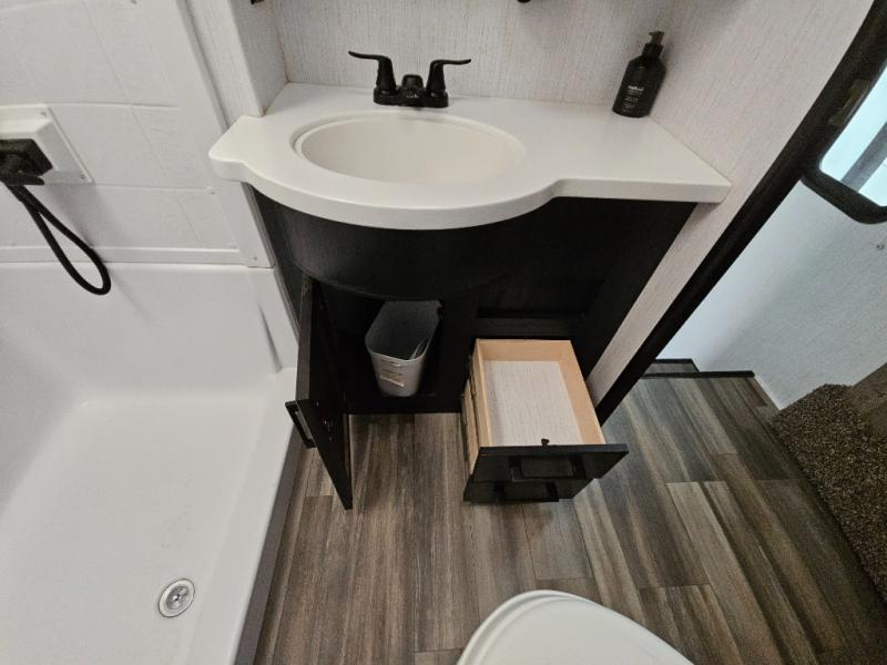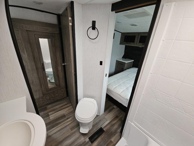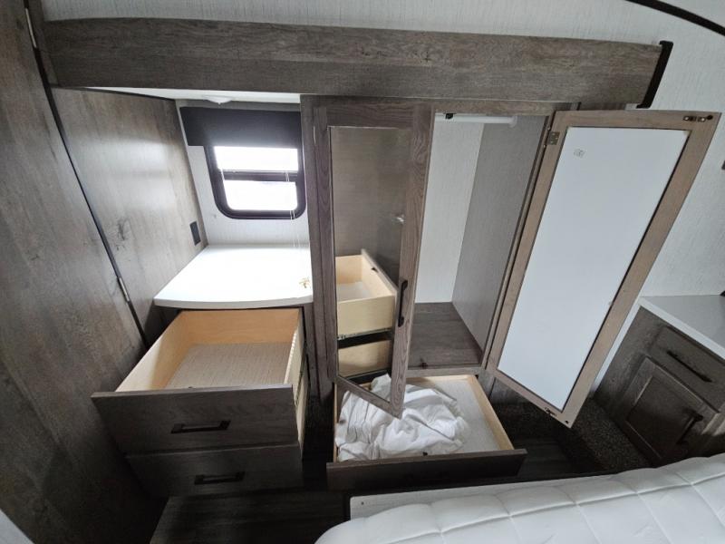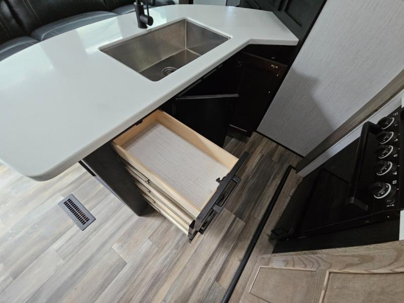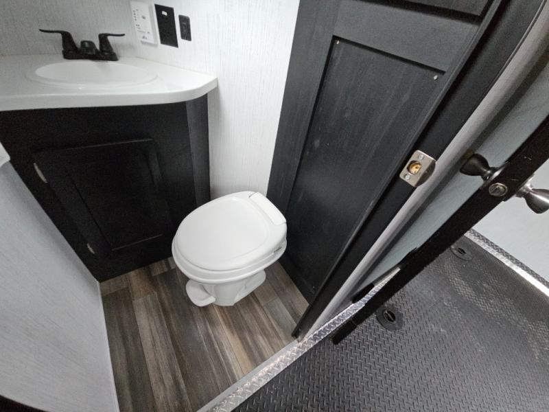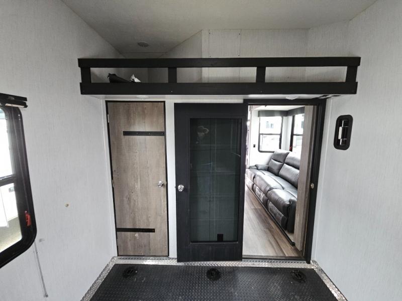 If you like to keep the dirt out of the main living area, this toy hauler gives you a separate garage with a side man door, a half bath for those quick breaks, and a power queen bed above opposing sofas with a dinette so the dirty shoes and all can stay in this area. After hitting the trails, you can get cleaned up in the full bathroom with a seated shower, make a meal in the kitchen and serve everyone from the counter peninsula then relax on the sofa. The dual slides in this space offer everyone enough room to stretch out and recoup from the ride. And don't forget about your oasis in the front private bedroom with plenty of storage for your clothing.