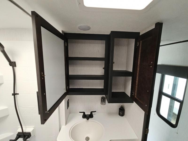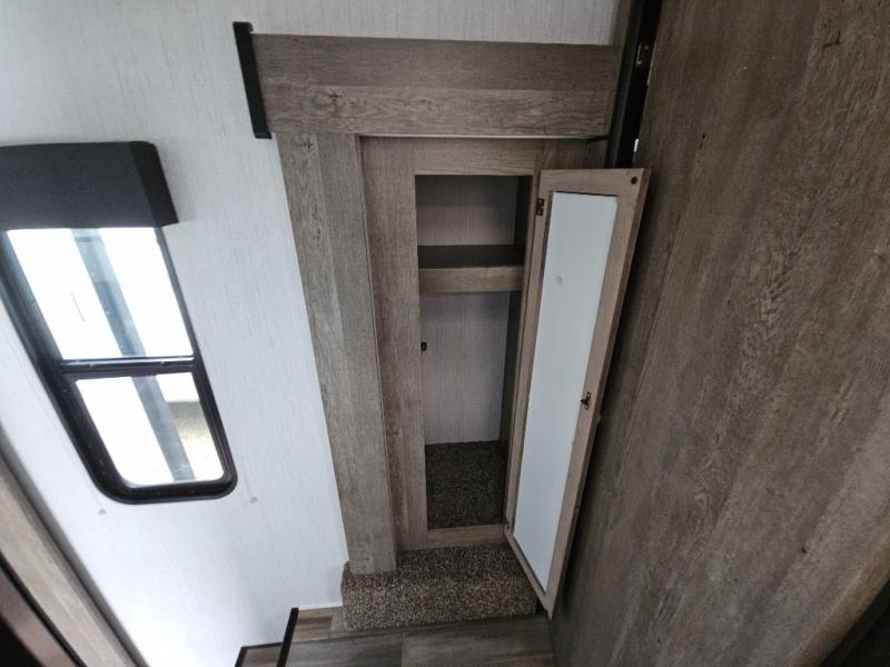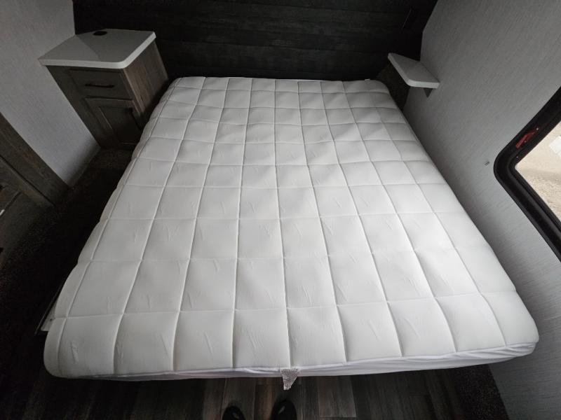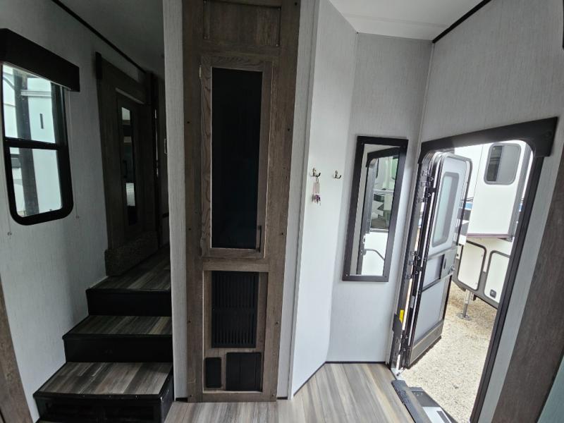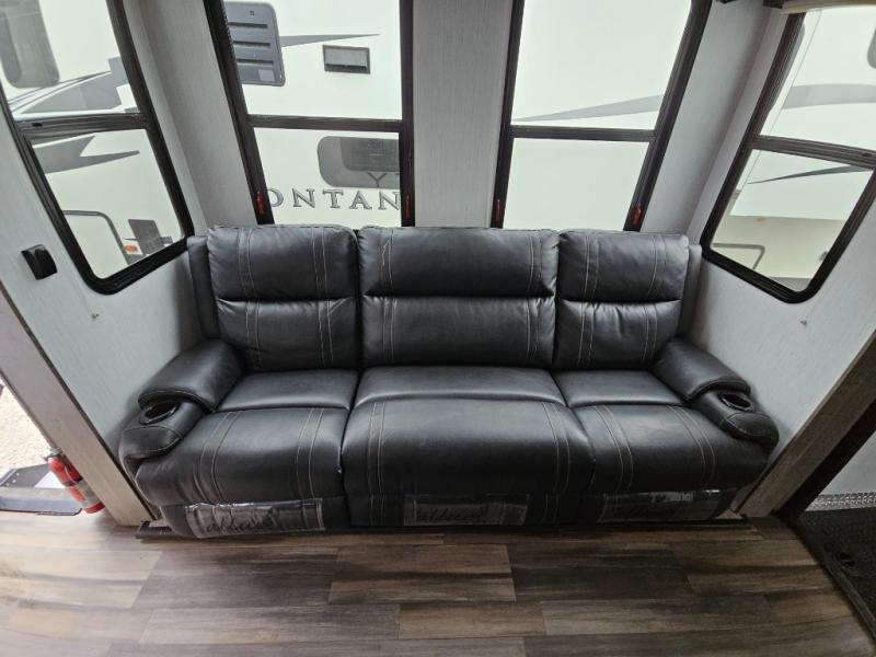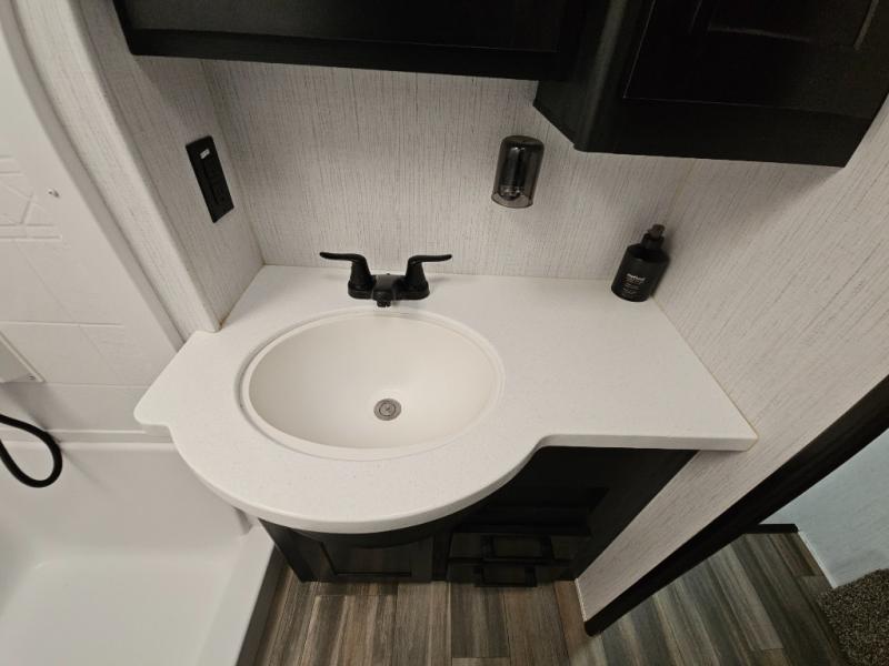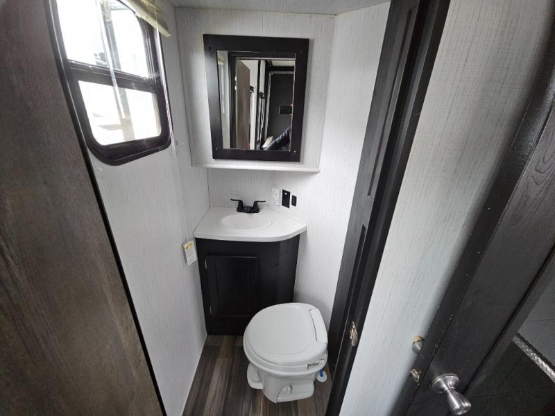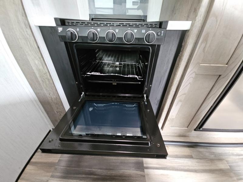 If you like to keep the dirt out of the main living area, this toy hauler gives you a separate garage with a side man door, a half bath for those quick breaks, and a power queen bed above opposing sofas with a dinette so the dirty shoes and all can stay in this area. After hitting the trails, you can get cleaned up in the full bathroom with a seated shower, make a meal in the kitchen and serve everyone from the counter peninsula then relax on the sofa. The dual slides in this space offer everyone enough room to stretch out and recoup from the ride. And don't forget about your oasis in the front private bedroom with plenty of storage for your clothing.