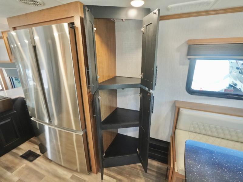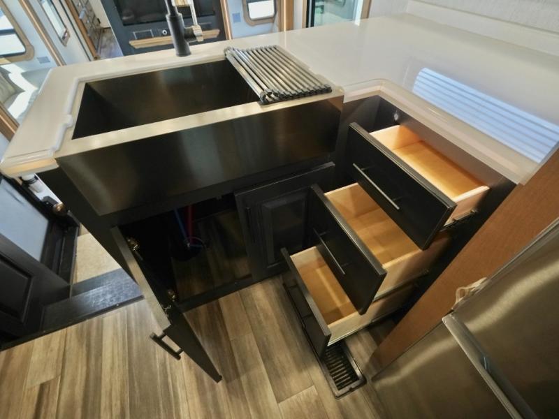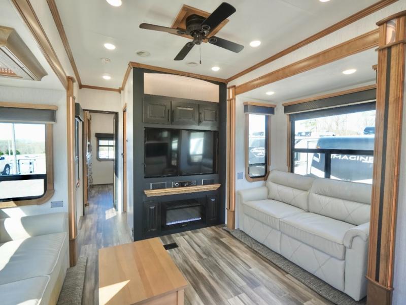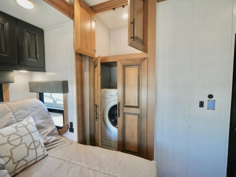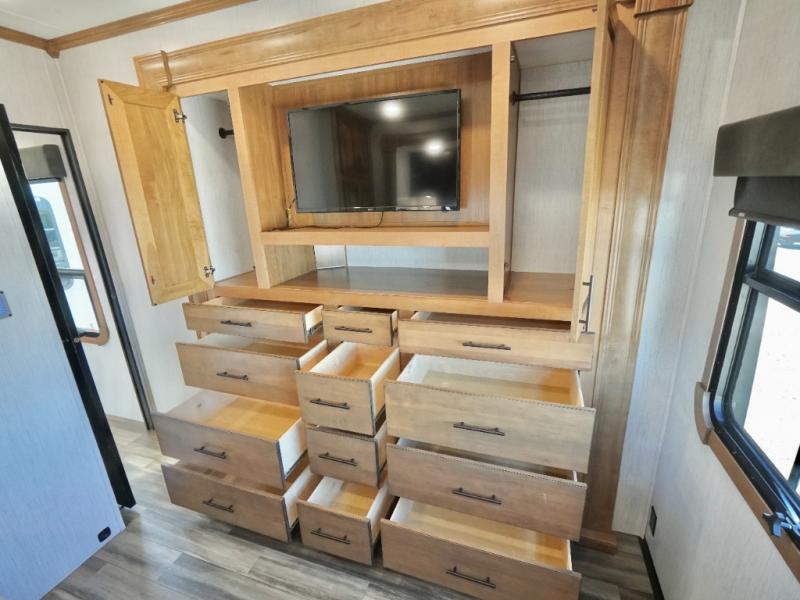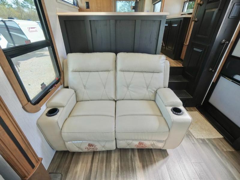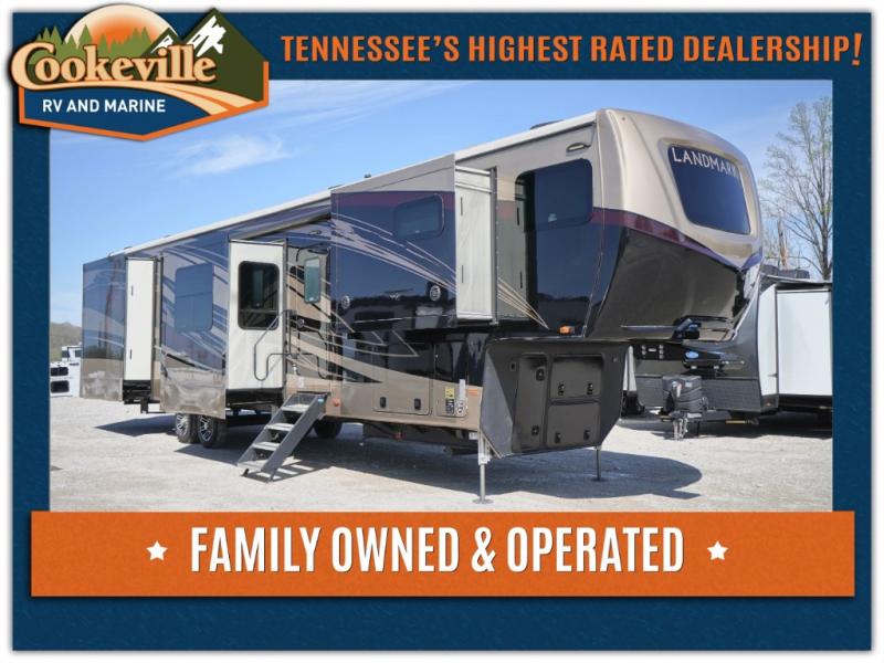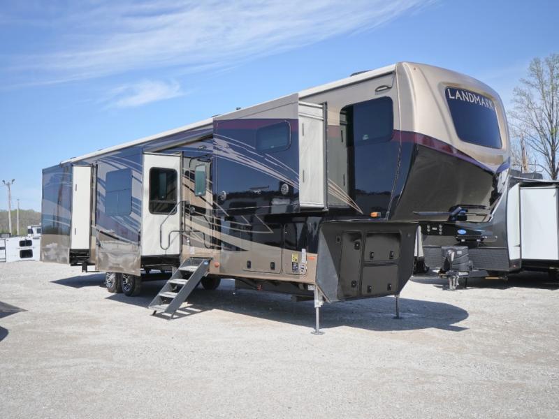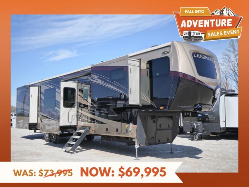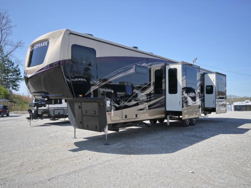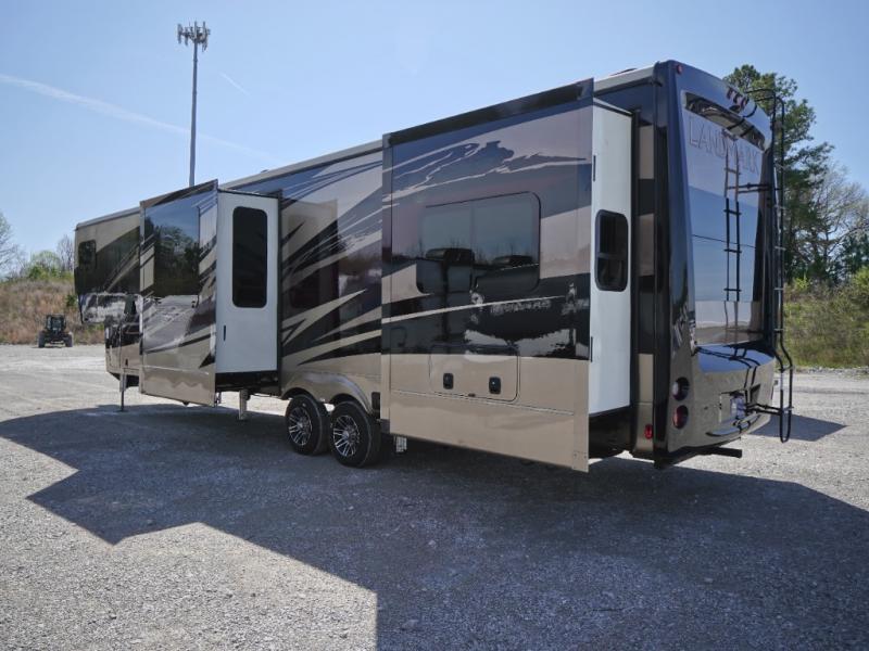 Everyone will love camping in this Landmark fifth wheel! The rear private bedroom is fit for a King with a tilting king-size bed, a TV, adjustable reading lights, and a closet prepped for the optional washer and dryer. Just outside the bedroom is the full bathroom equipped with everything you will need to start each morning squeaky clean. The chef of the group is going to love whipping up delicious meals in the full kitchen and love having the front dinette close by even more for others to socialize too. After you have filled yourself to the brim, you can head into the middle living area and choose to relax on one of the two sofas or the power theatre seating with heat and massage for the ultimate relaxation!
