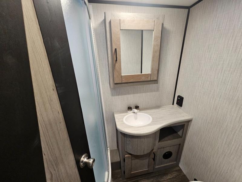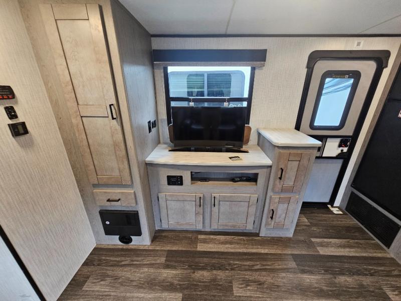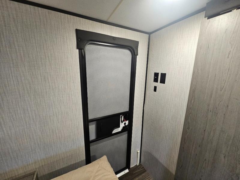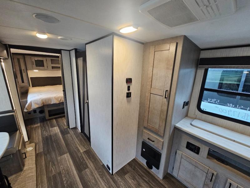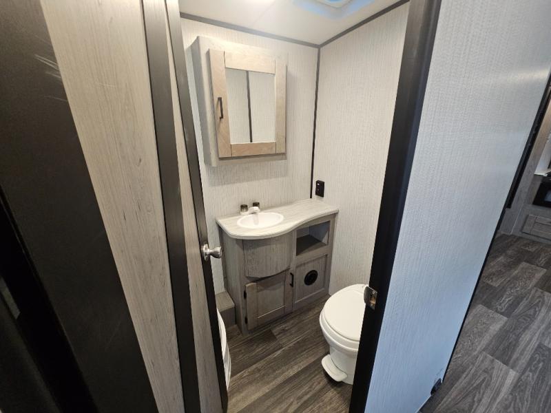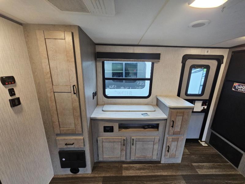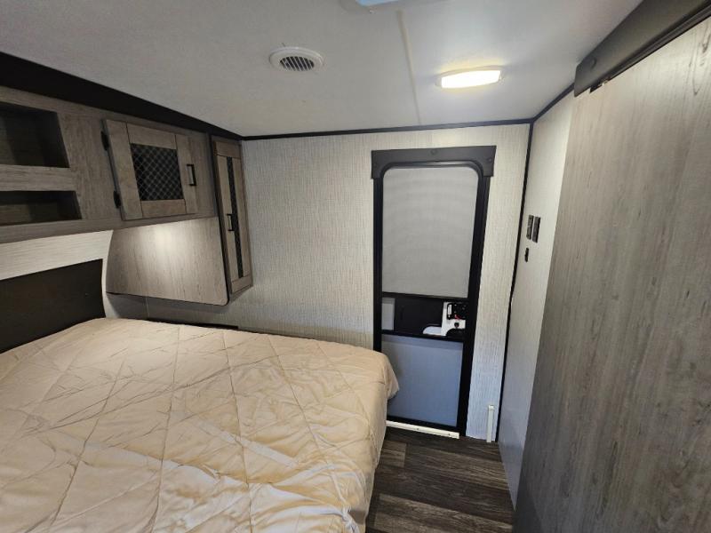 Easily load and unload as well as enter and exit this Mallard travel trailer with dual entry doors! One of those doors is located in the main living area/kitchen, and the second door is included within the front private bedroom. Inside the bedroom you will have your own king bed with wardrobes while the kiddos sleep on the furniture within the slide out in the main living area. The booth dinette and sofa also provide a place to visit and play games while the cook makes meals in the rear kitchen with full amenities. And don't forget that you will have your own full bathroom to get cleaned up and refreshed every morning or night.