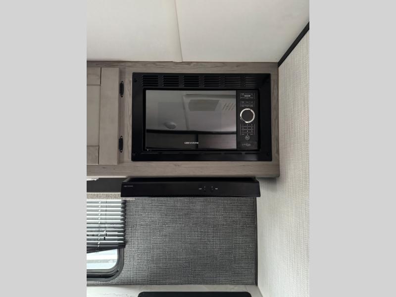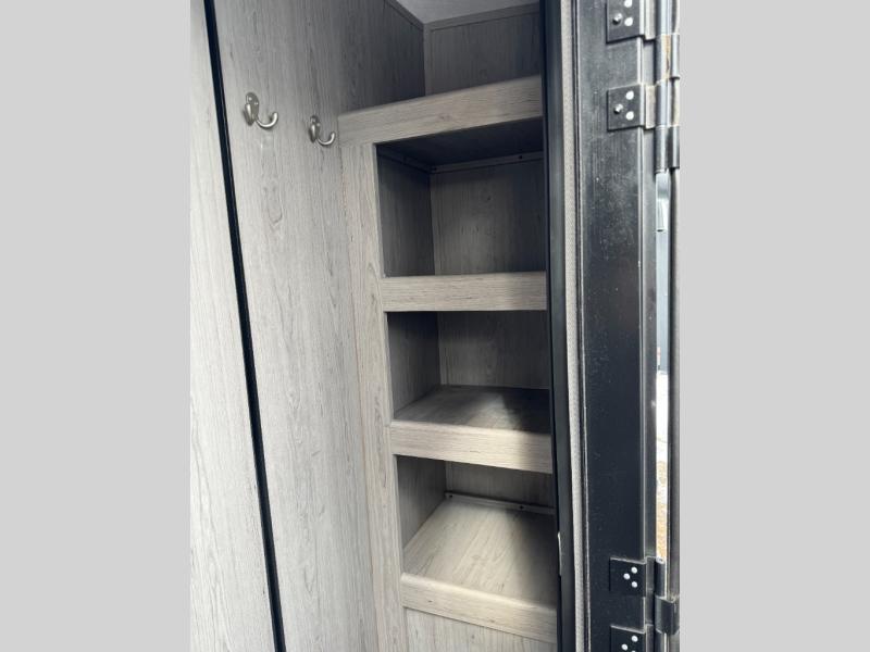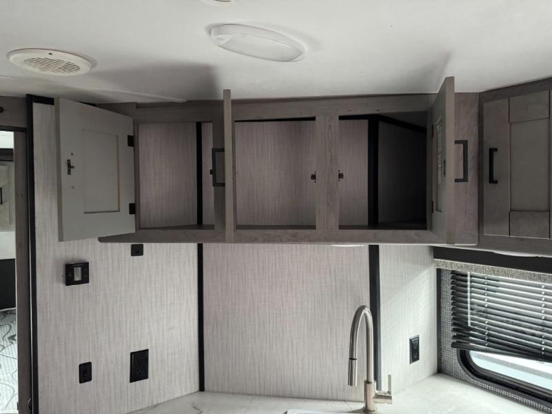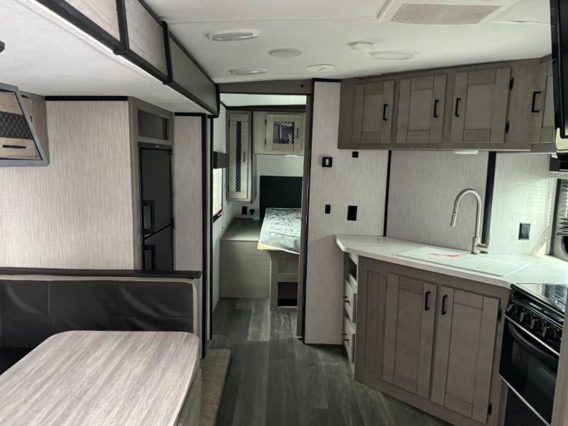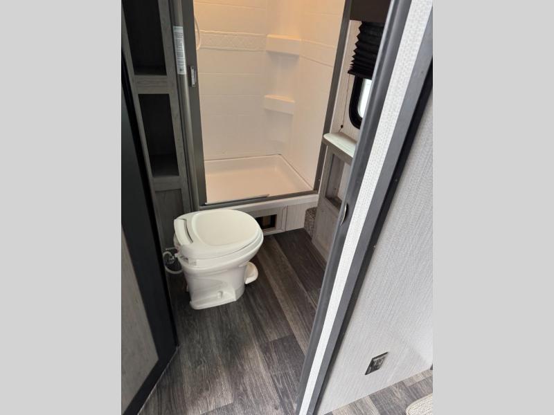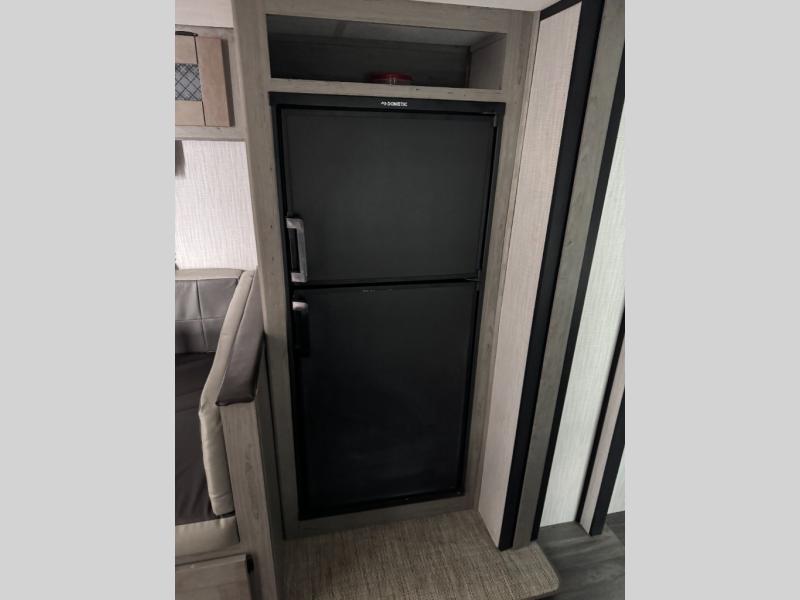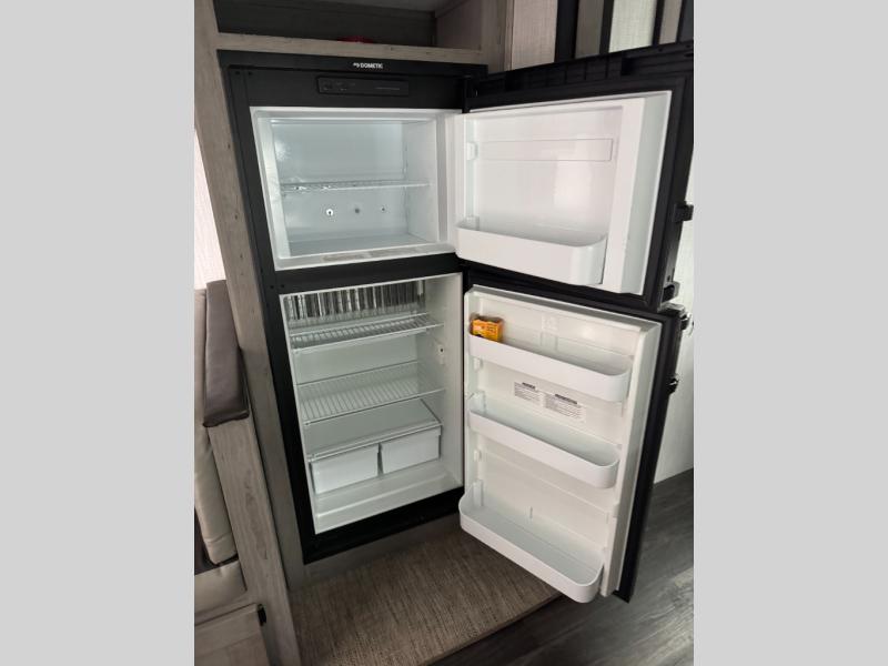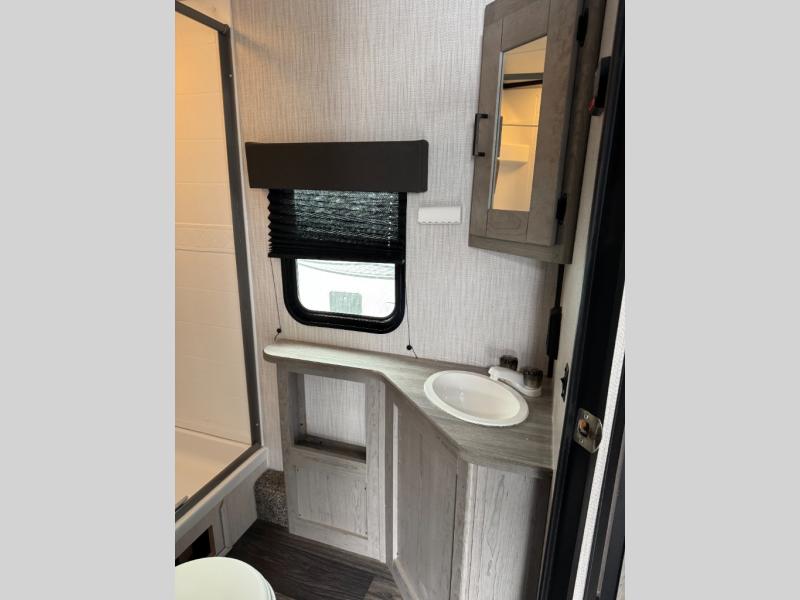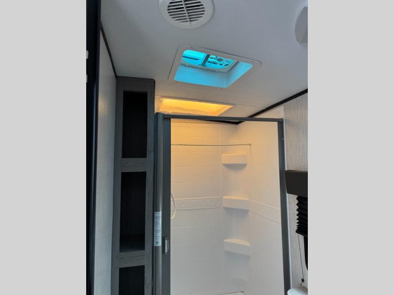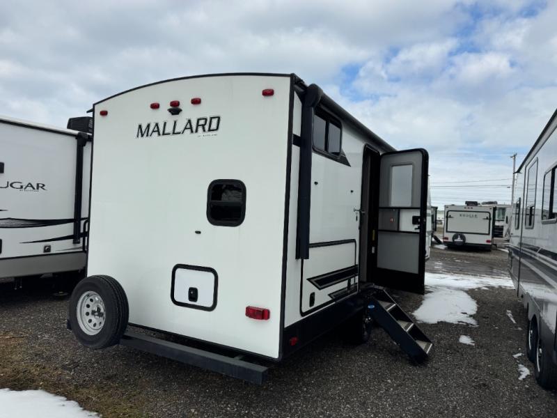 Having a large pantry and an 8-cu. ft. refrigerator in this Mallard travel trailer will allow you to camp for longer periods of time before going into town to restock. You can make meals inside or outside, and you can also choose to dine inside at the U-shaped dinette or outside under the 18' power awning with LED lighting. Everyone can take turns getting cleaned up in the full bathroom next to the bunks before bedtime, and you can retreat to your own king bed in privacy while your kiddos or guests sleep on the U-shaped dinette once set up for bedtime.