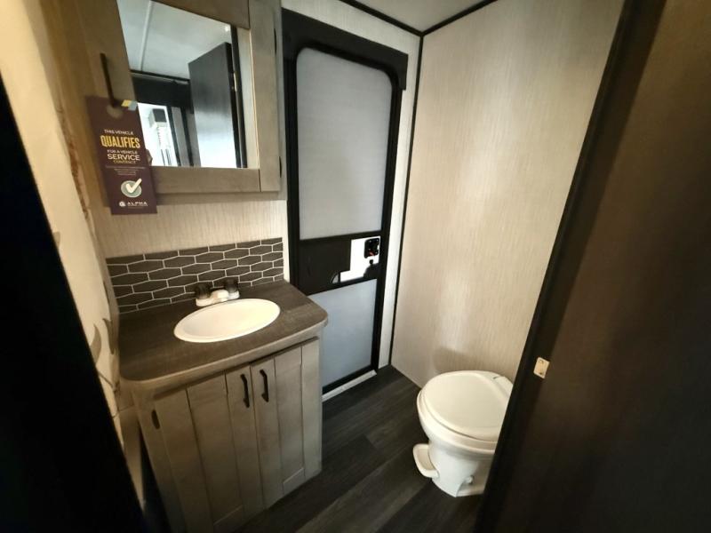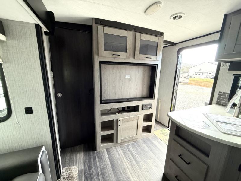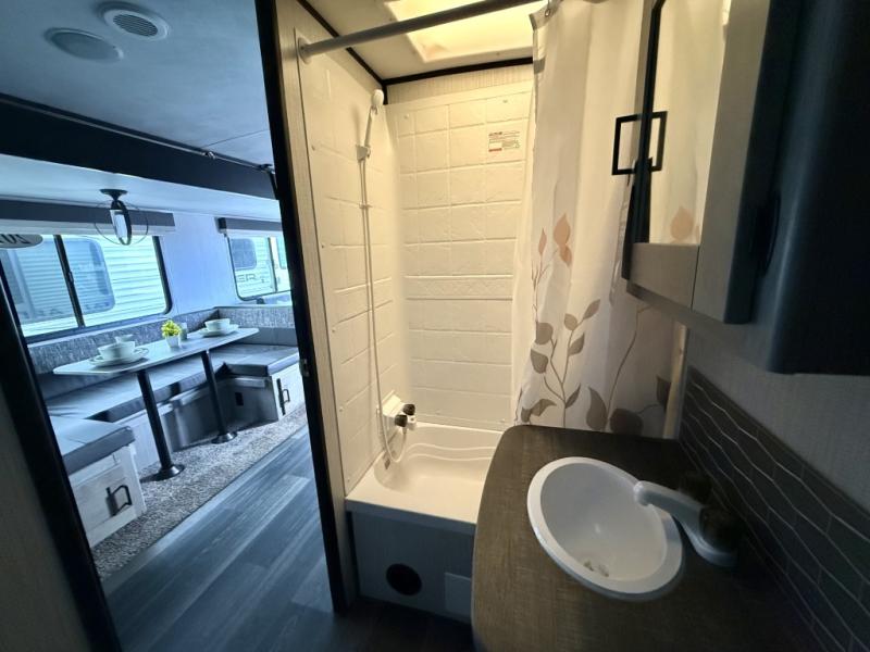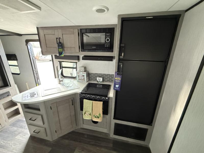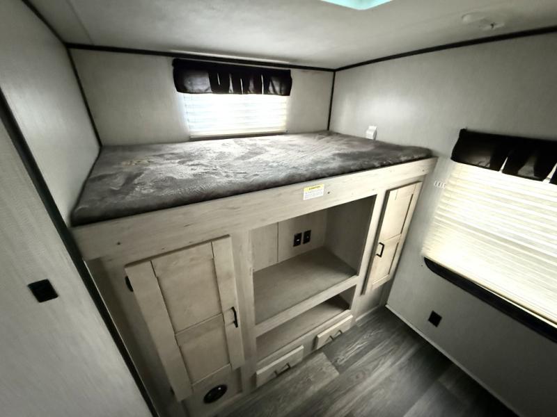 Imagine having two entry doors in your next travel trailer allowing you to have easy access to the full bathroom when you are outside or inside! This Mallard travel trailer provides you with that and more. There's something for everyone between the rear private bunkhouse with an entertainment center, two bunks, and seating, the exterior kitchen to grill up some juicy burgers while enjoying the sunshine, and the U-shaped dinette that can be used for meal time, game time, and bed time. You will even have your own private retreat when you head into the front private bedroom which features a king bed and overhead cabinets!